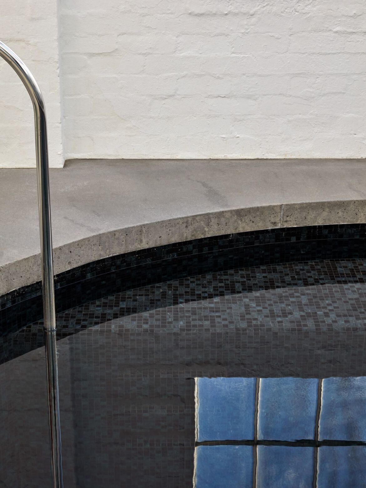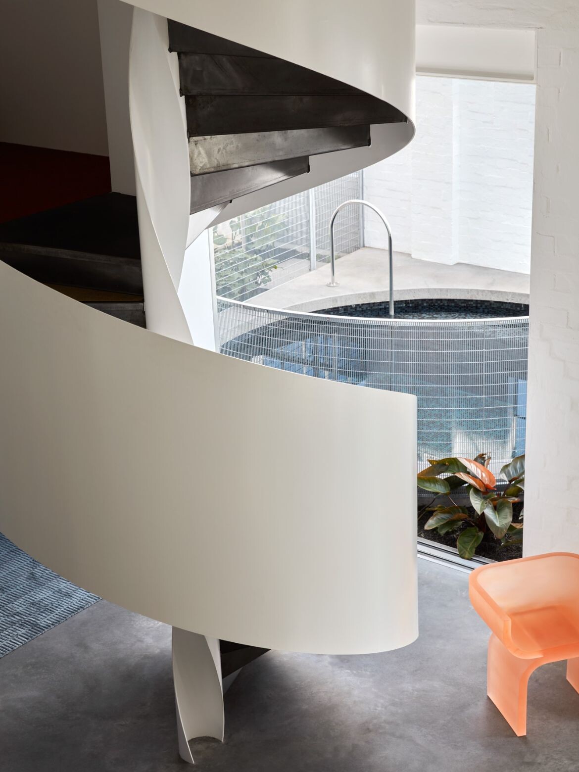 There is a logic applied to the planning that works with the constraints, such as where to arrive and descend. “The spiral gave us the best outcome in terms of functional requirements, but then it also influences other things, like the circular swimming pool and other circular elements that were spun off the spiral stair,” shares Walker.