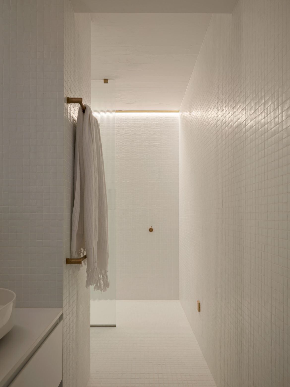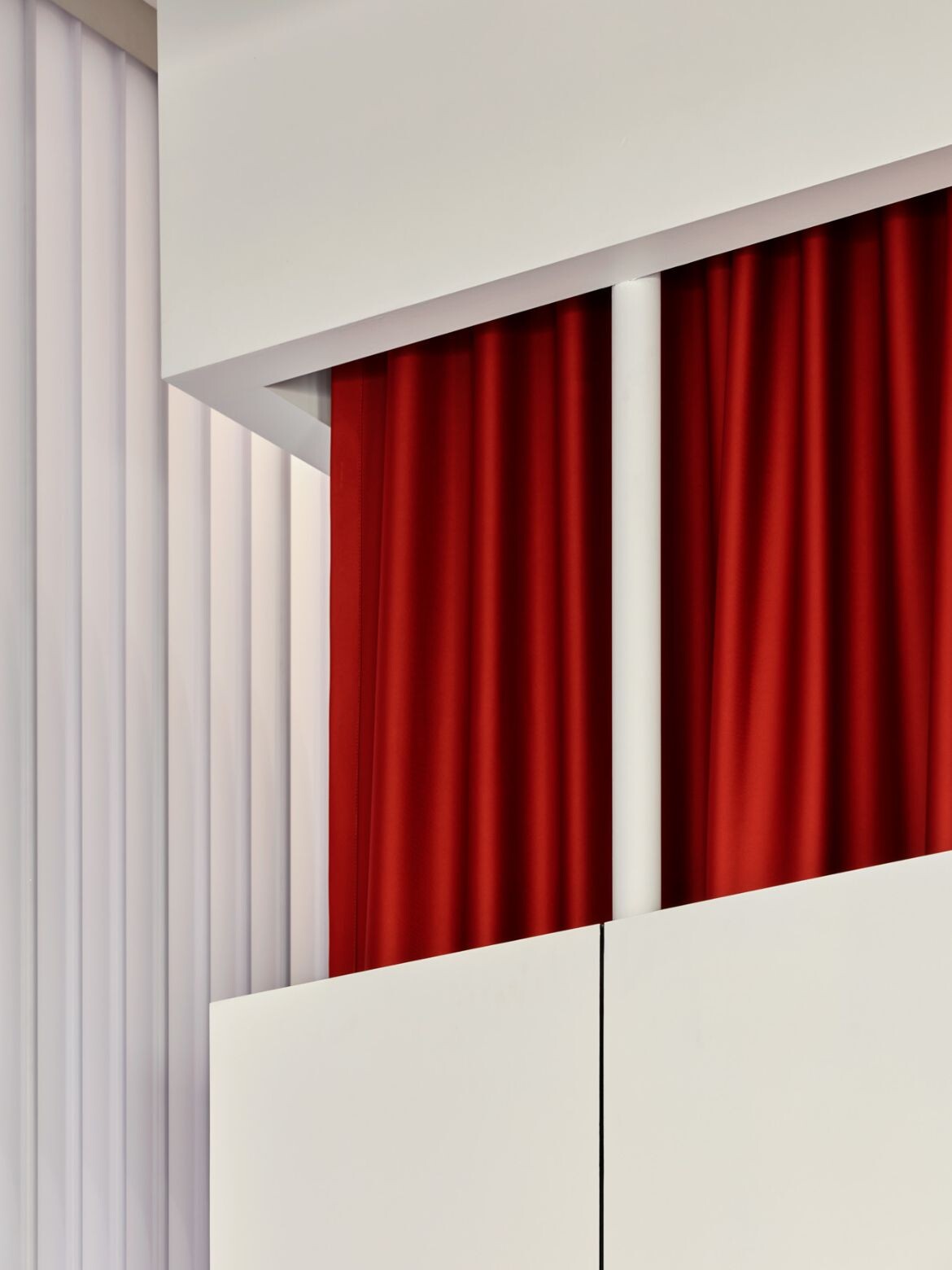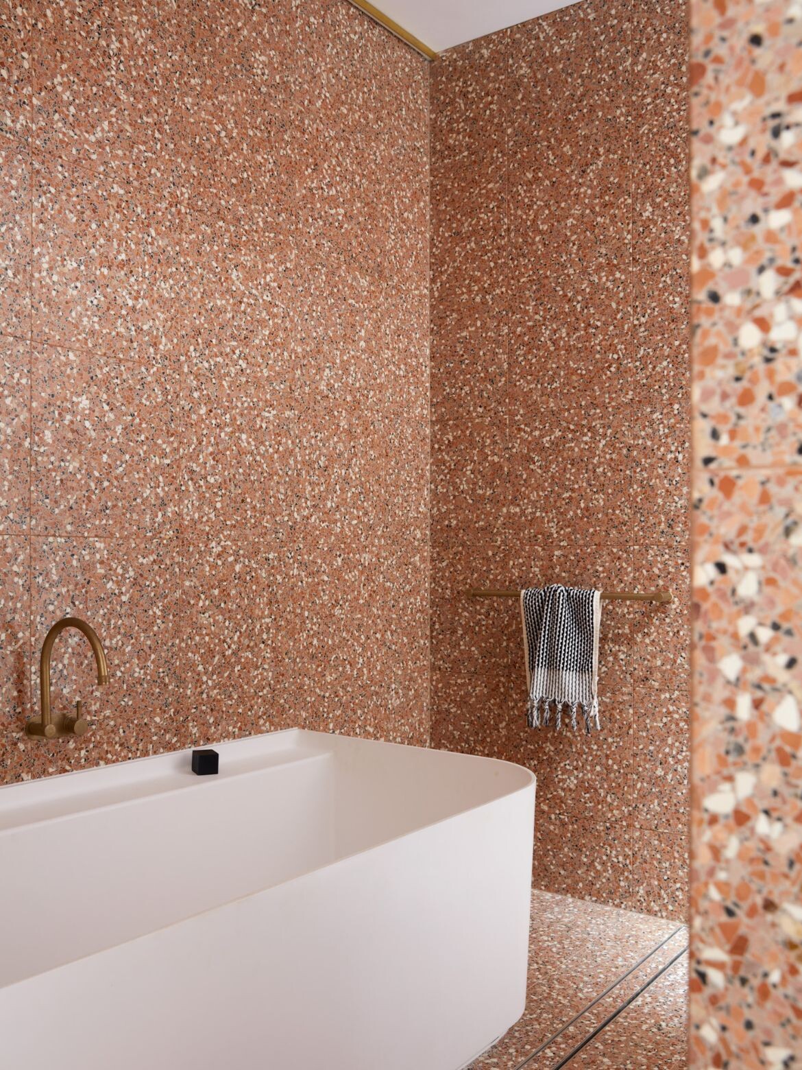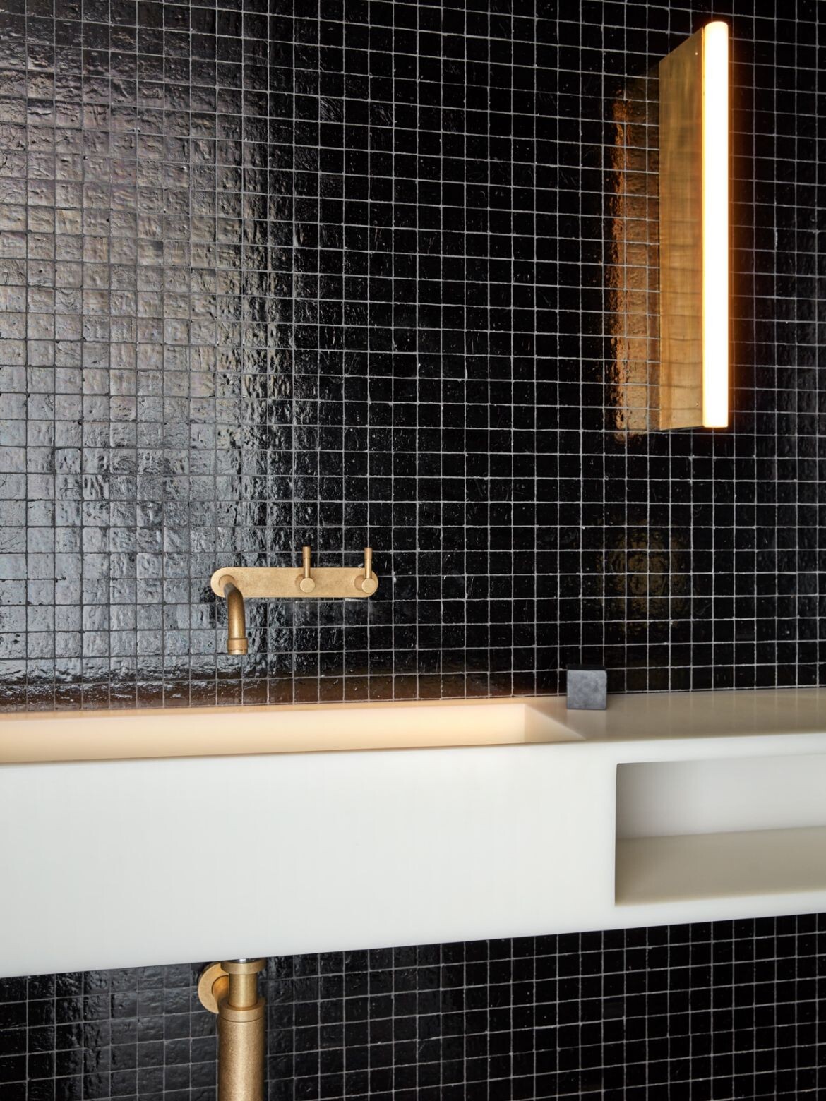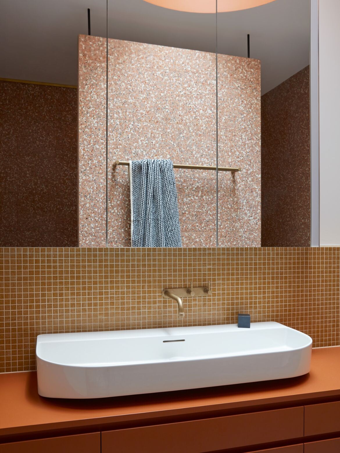 Dawn Curtain from Kvadrat. Vixel mosaic wall tiles from Artedomus. Terrazzo tile in Fatima’s Reflection from Fibonacci Stone. Mosaic tiles in Velour and Vetricolour from Bisazza. Carpet by Tretford from Gibbon Group. Wall cladding from Easy Craft. Polycarbonate by Danpal.