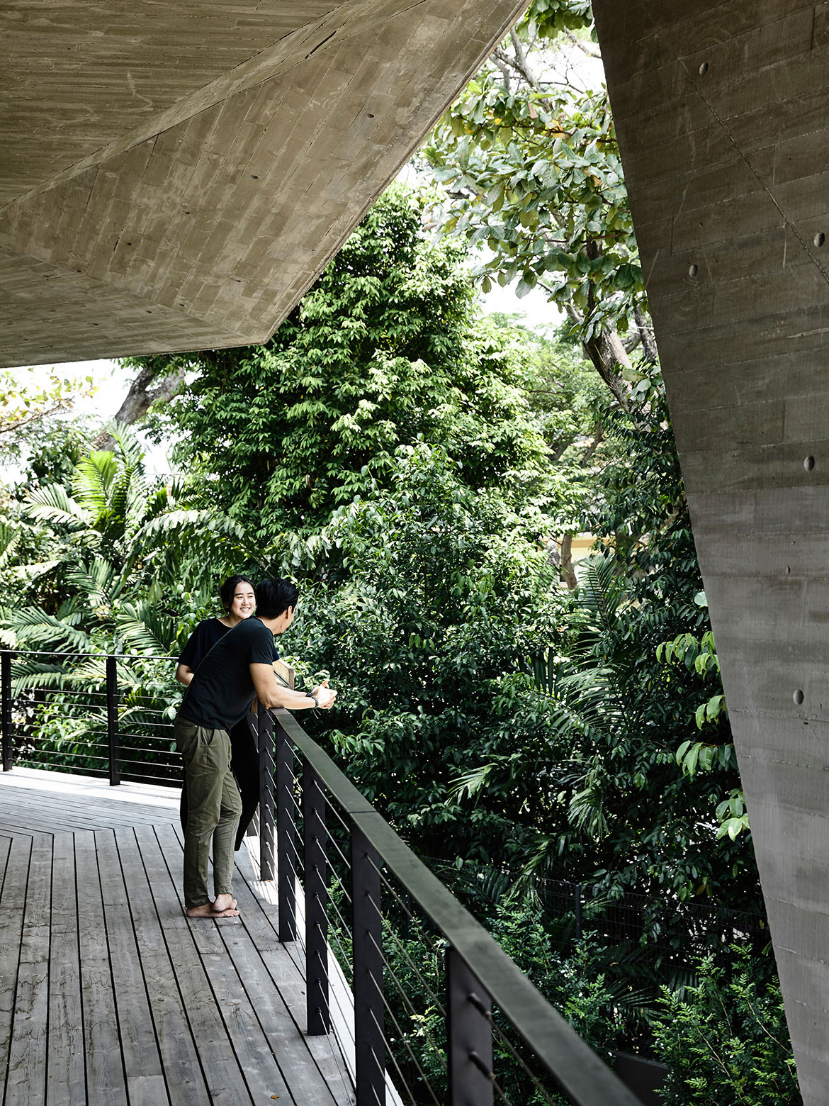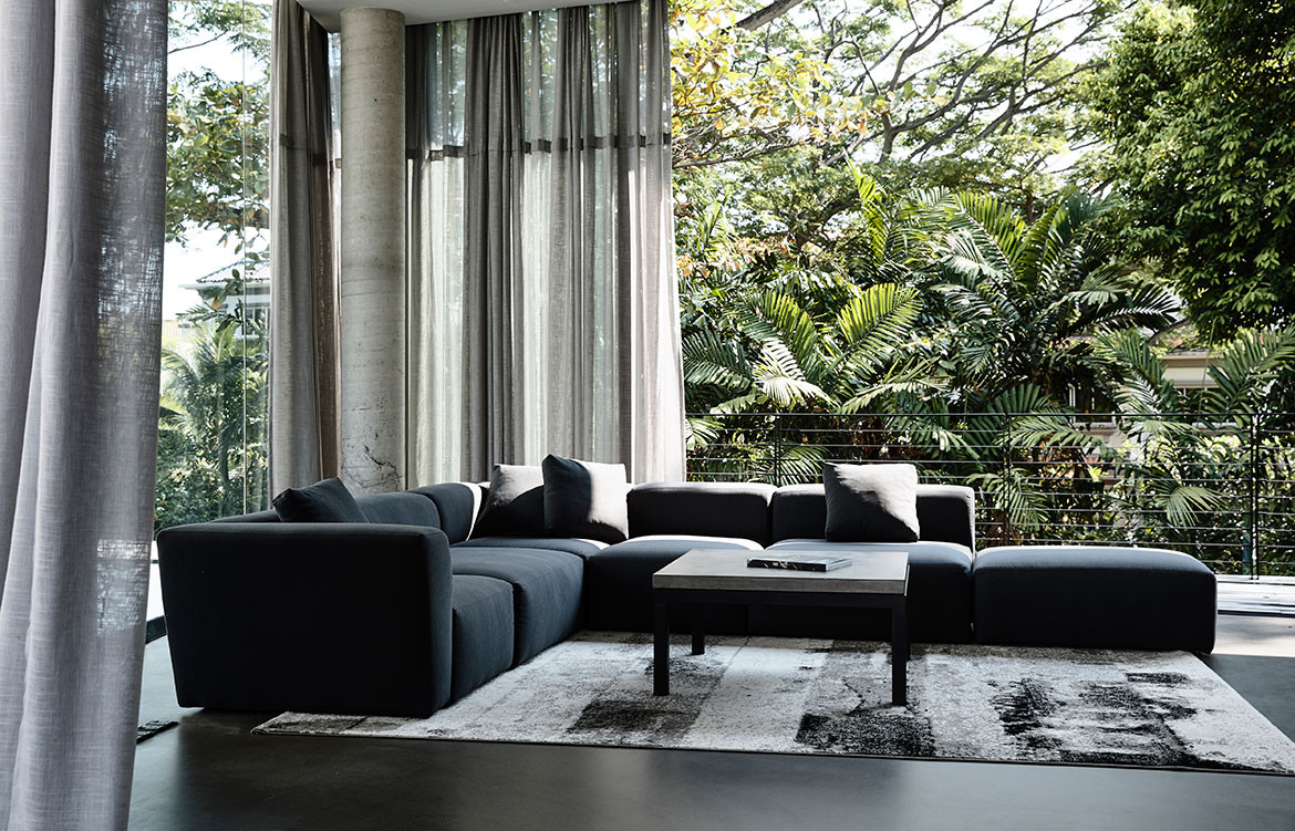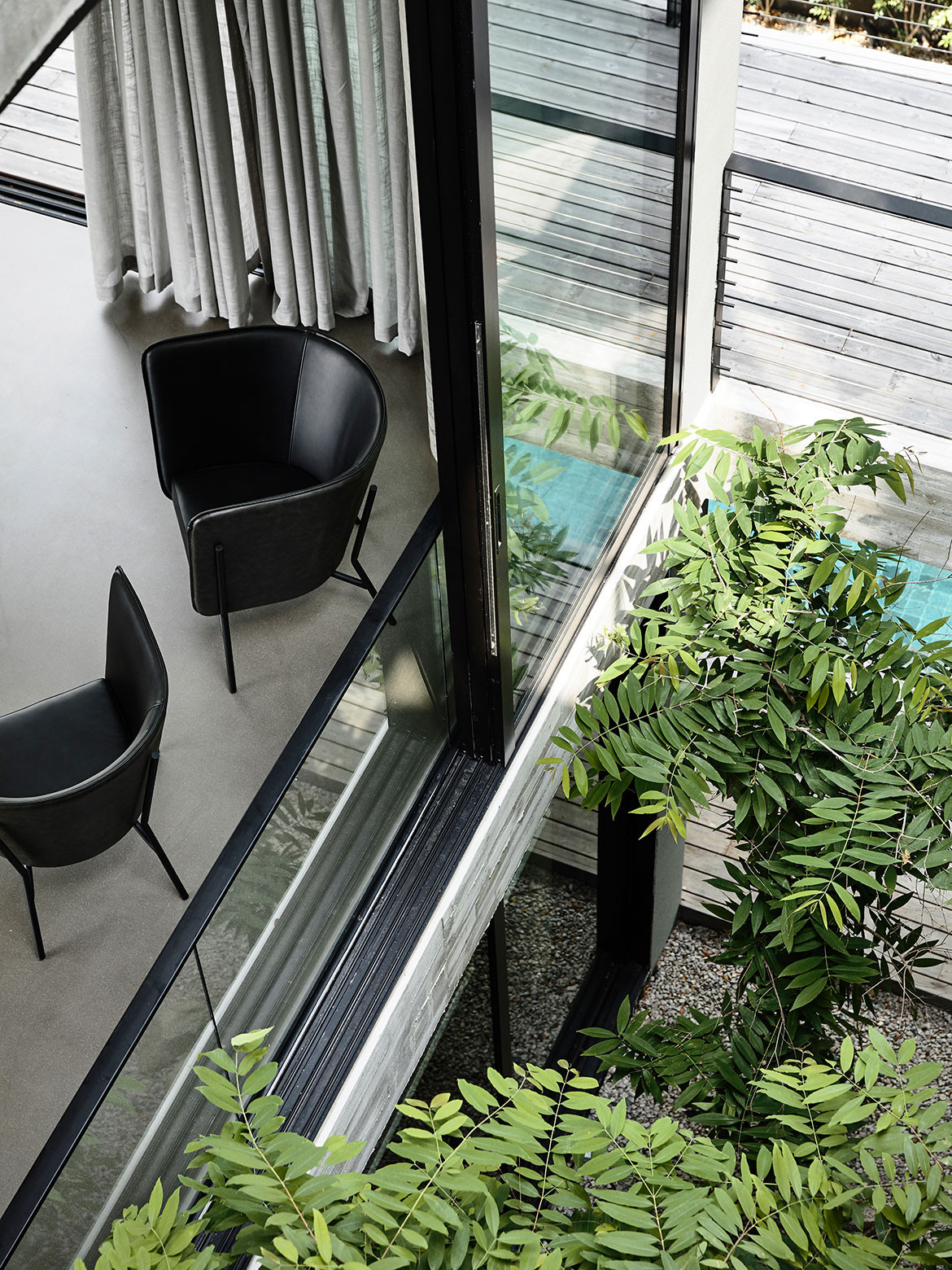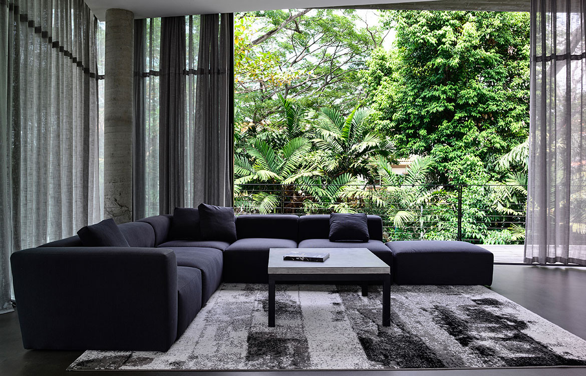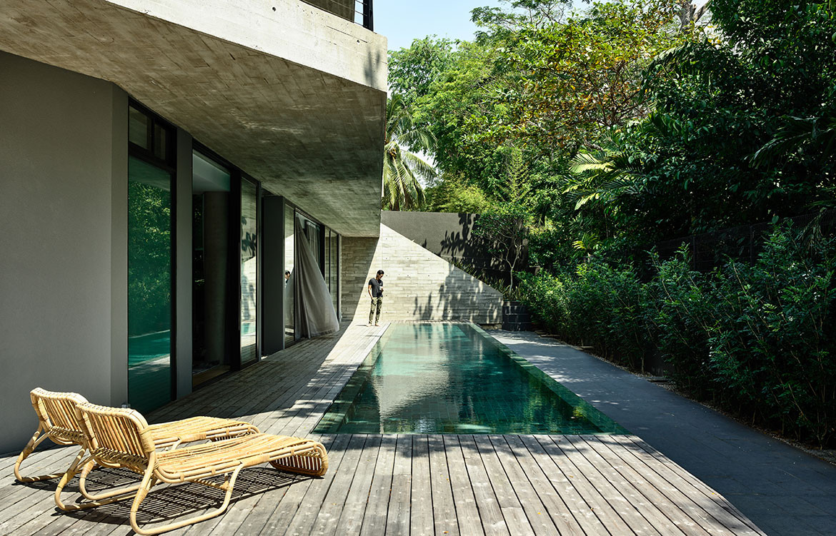 Architect and clients were also in harmony over a more austere selection of materials. The natural off-form concrete finish with timber imprints showcases the integrity of its construction – no reliance on plastering to cover up any shoddy workmanship. “We like grey and having this off-set against the Kebony timber that would also turn grey over time turned out to be a good outcome,” adds Wendy Teo, daughter of the owner. “They were also our only clients who kept asking for darker interiors,” laughs Christina, and this tonality is most apparent in the spacious family nook of the semi-basement. Here, the walls are lined with black cabinetry works, housing a good stock of books and liquor. Their neat placement in a monochromatic setting is almost an exemplary showcase for the current decluttering craze, even in this most social of spaces within the house. For it is here that entertainment can spill out to the outdoors, onto the deck of a 23-metre-long swimming pool, flanked by a luxuriant row of mature trees just beyond the porous BRC fence.