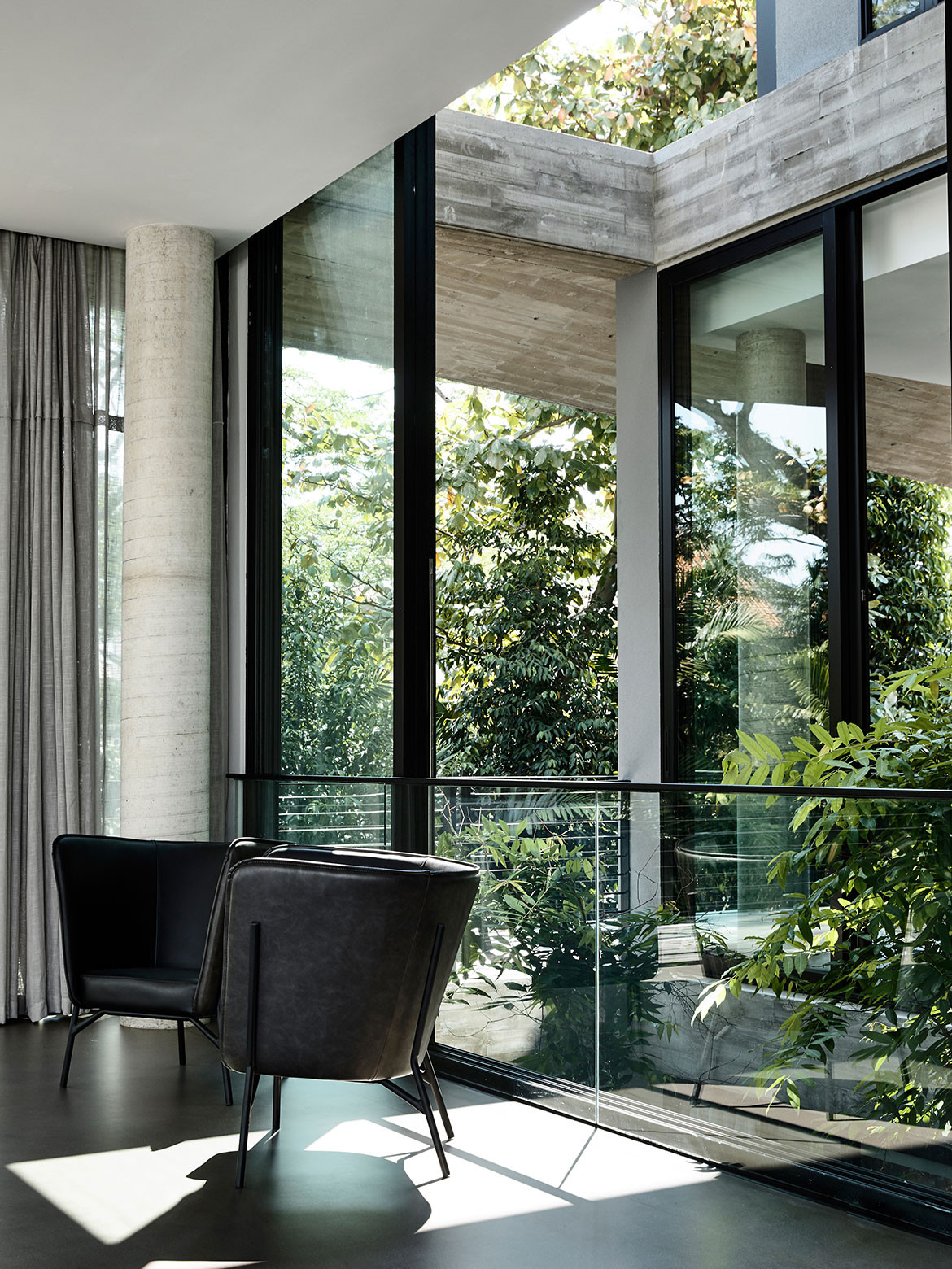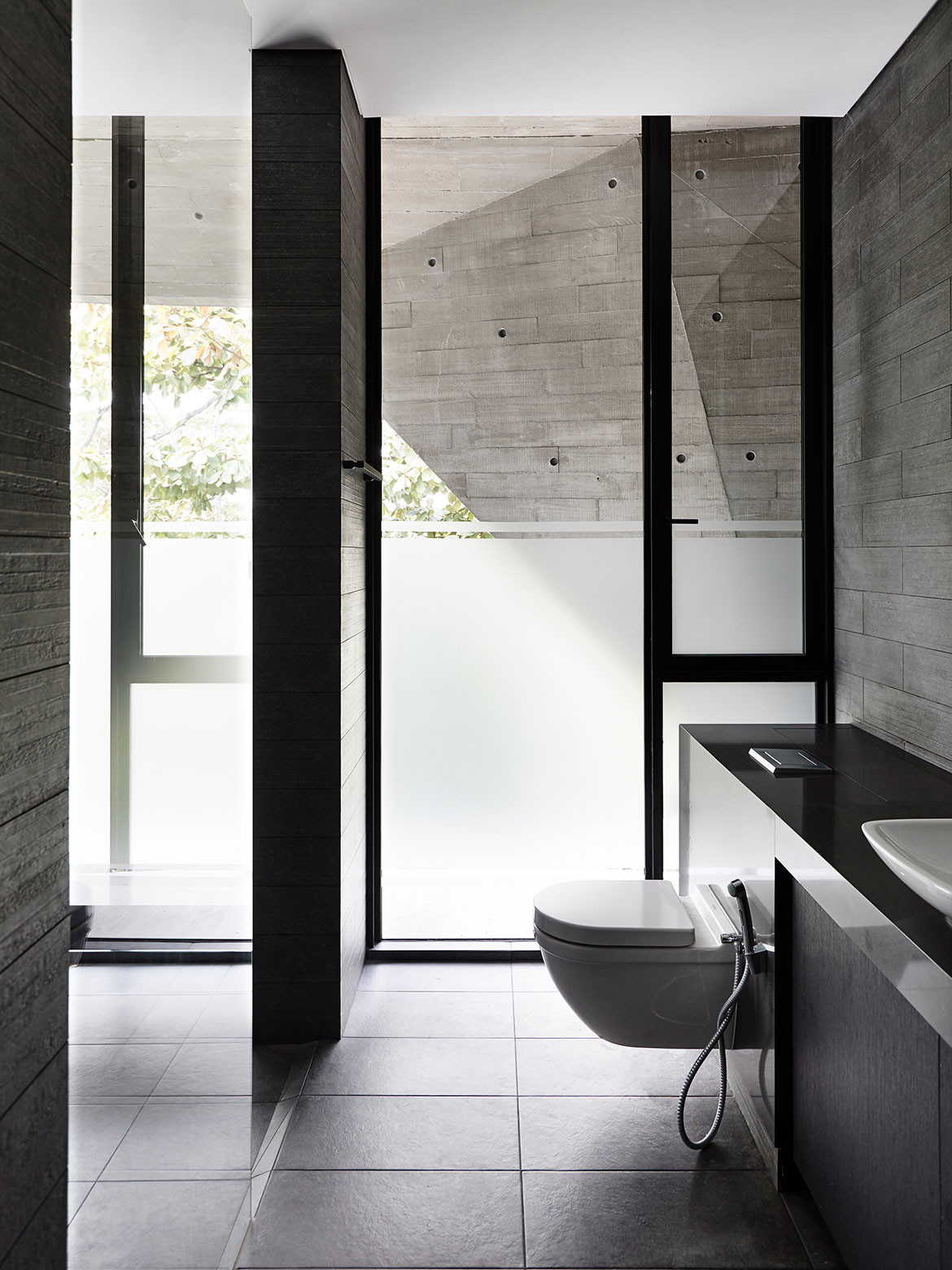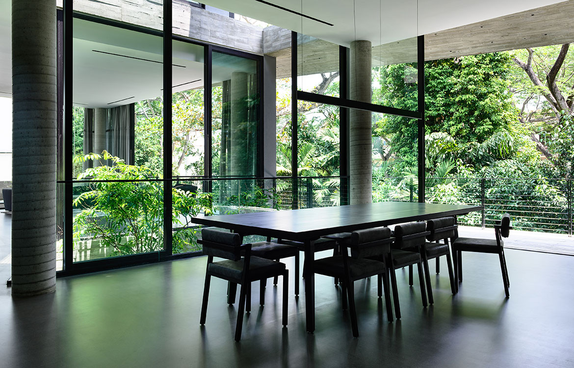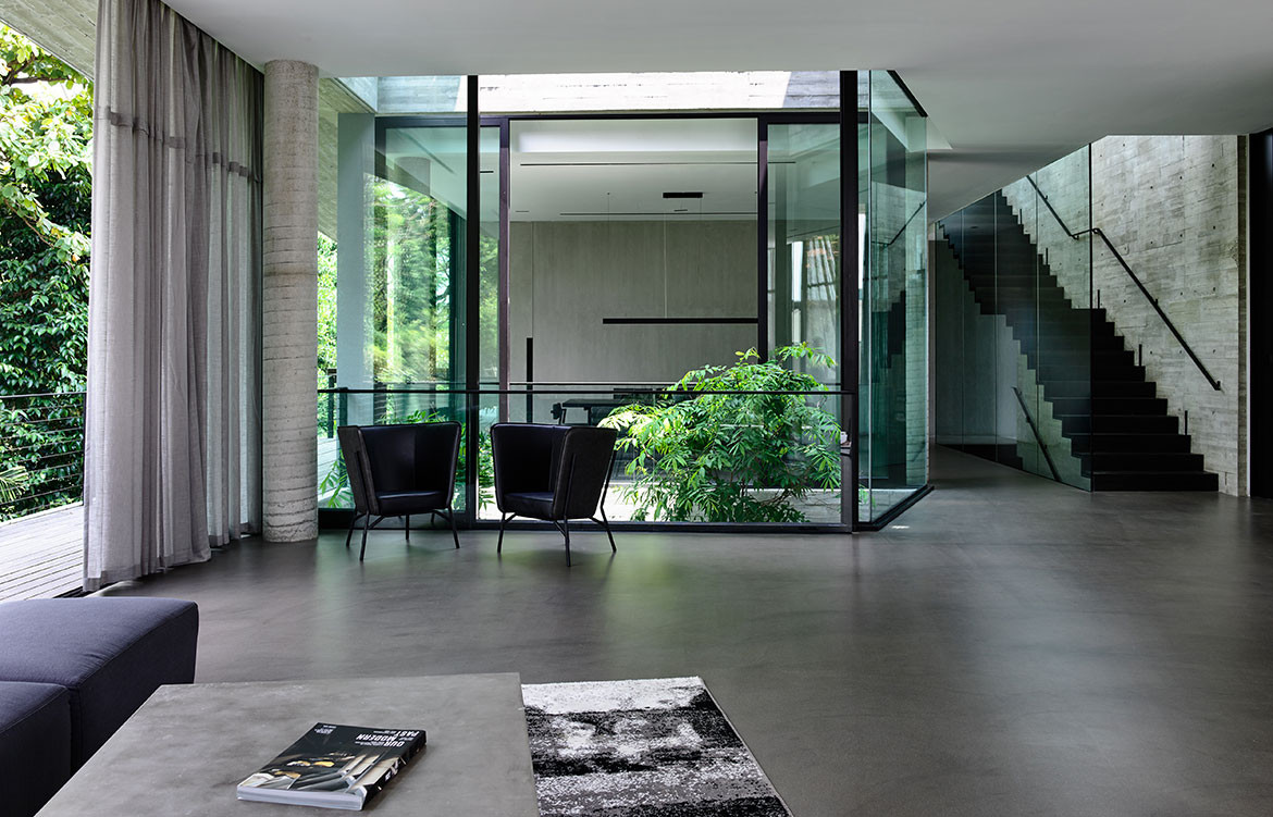 Not surprisingly, visual porosity towards the trees behind was a major driving force governing the design. Almost without exception, all the major rooms and even beds are orientated towards the trees. Views are framed by frameless glass, or else framed glass windows are slid open for direct biophilic connection. A vertical courtyard links all three floors to a dry garden at the basement, and it is positioned to be the first sight that greets the visitor upon entering the front door. There is everywhere a Zen touch that imbues the design, one that downplays the architecture so that nature can be its focus.