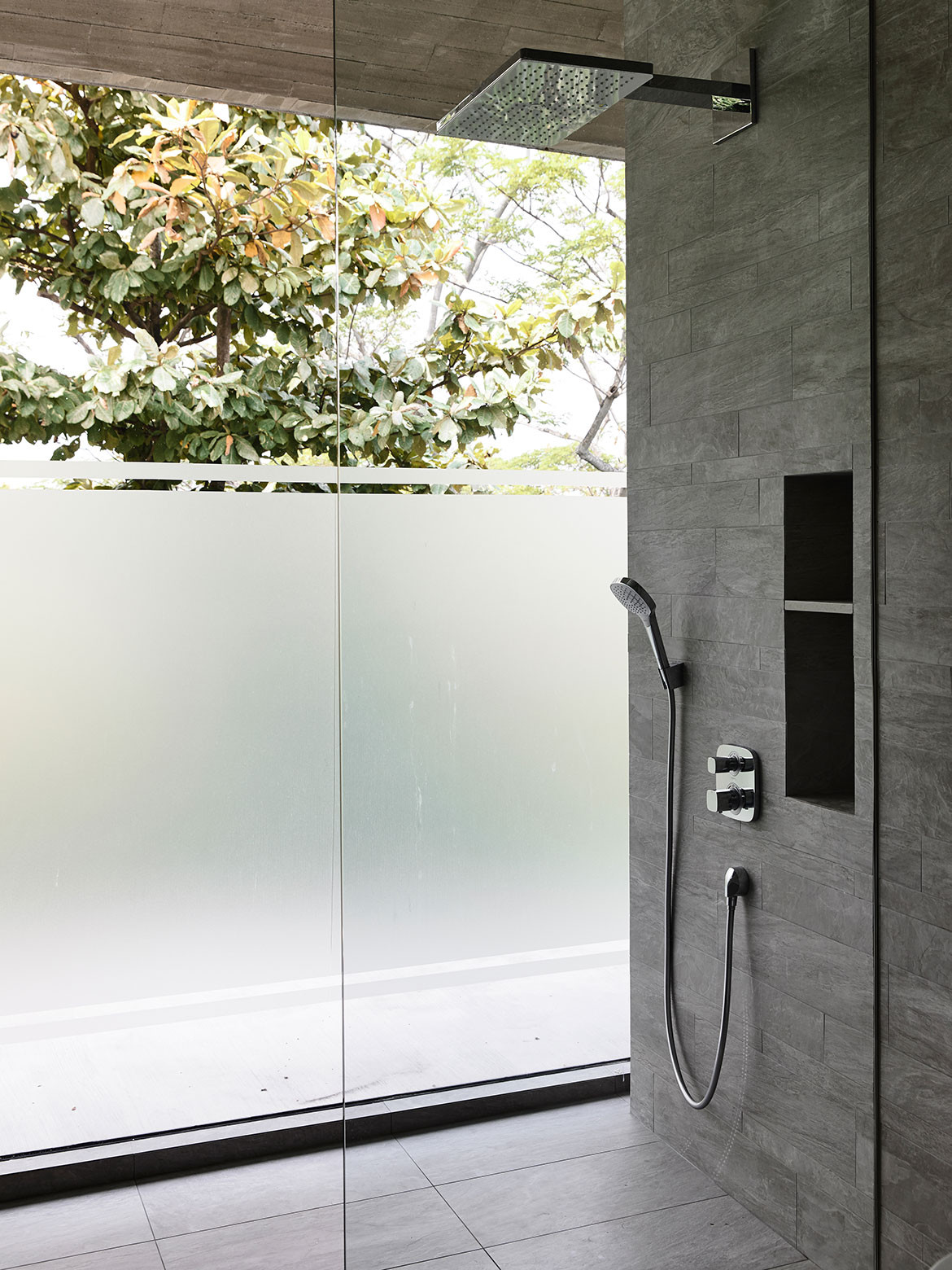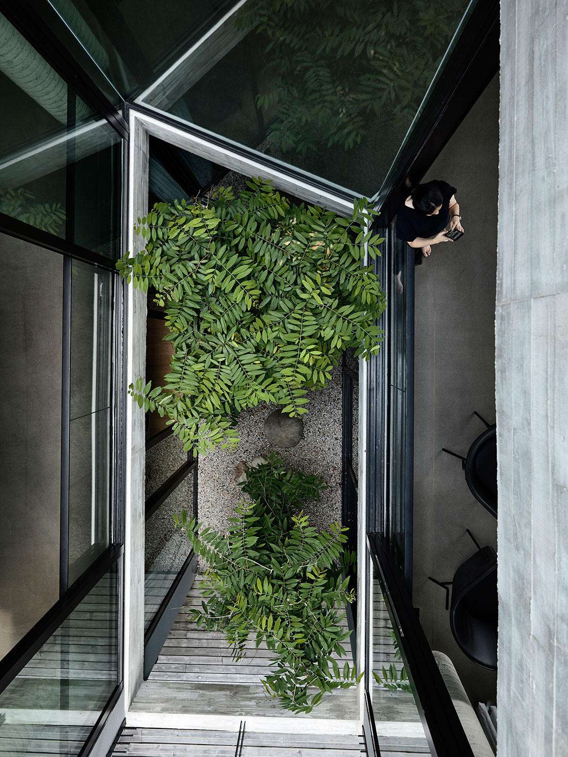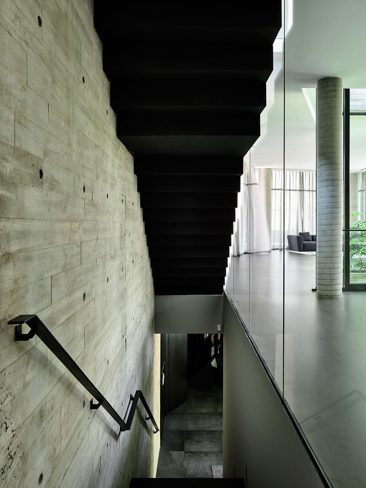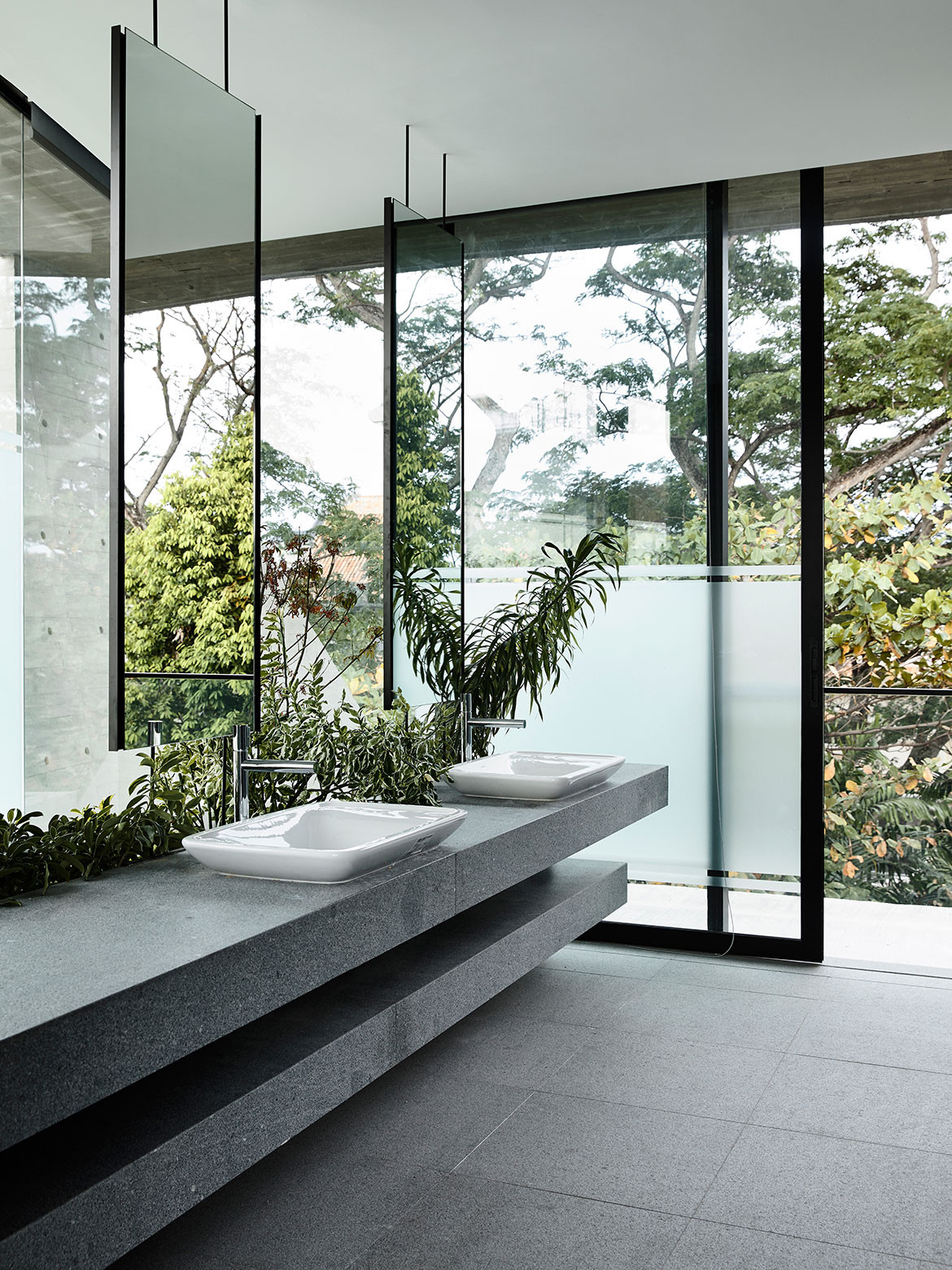 Not surprisingly, visual porosity towards the trees behind was a major driving force governing the design. Almost without exception, all the major rooms and even beds are orientated towards the trees. Views are framed by frameless glass, or else framed glass windows are slid open for direct biophilic connection. A vertical courtyard links all three floors to a dry garden at the basement, and it is positioned to be the first sight that greets the visitor upon entering the front door. There is everywhere a Zen touch that imbues the design, one that downplays the architecture so that nature can be its focus.