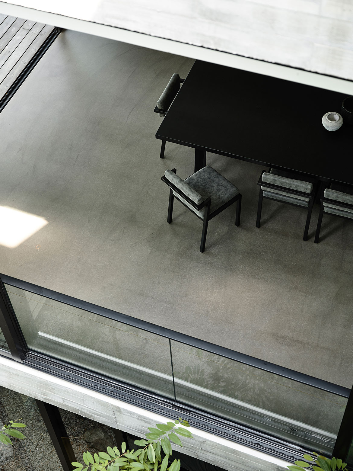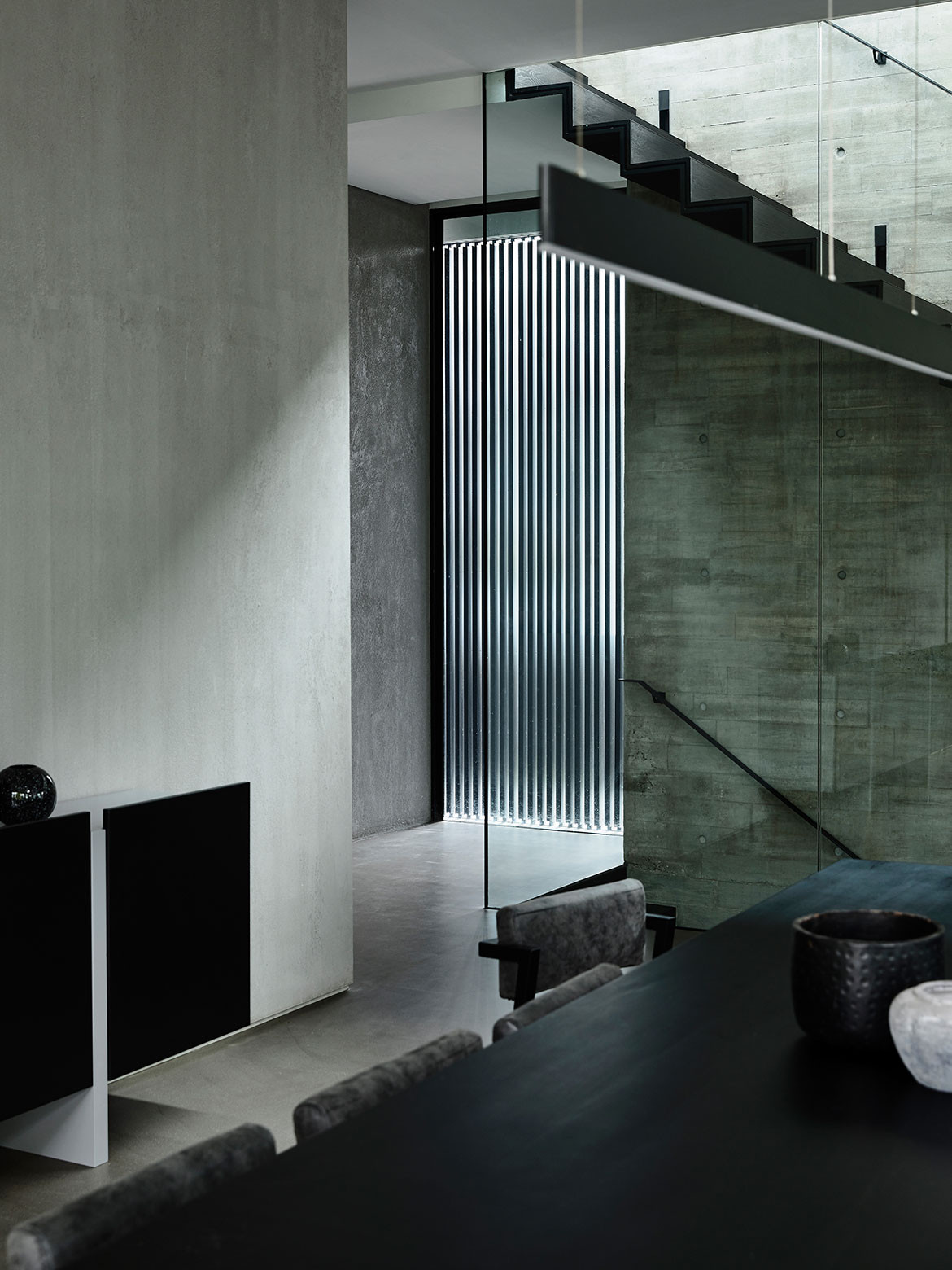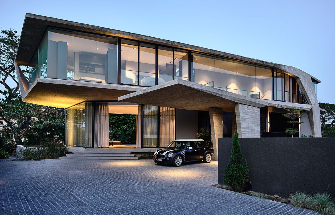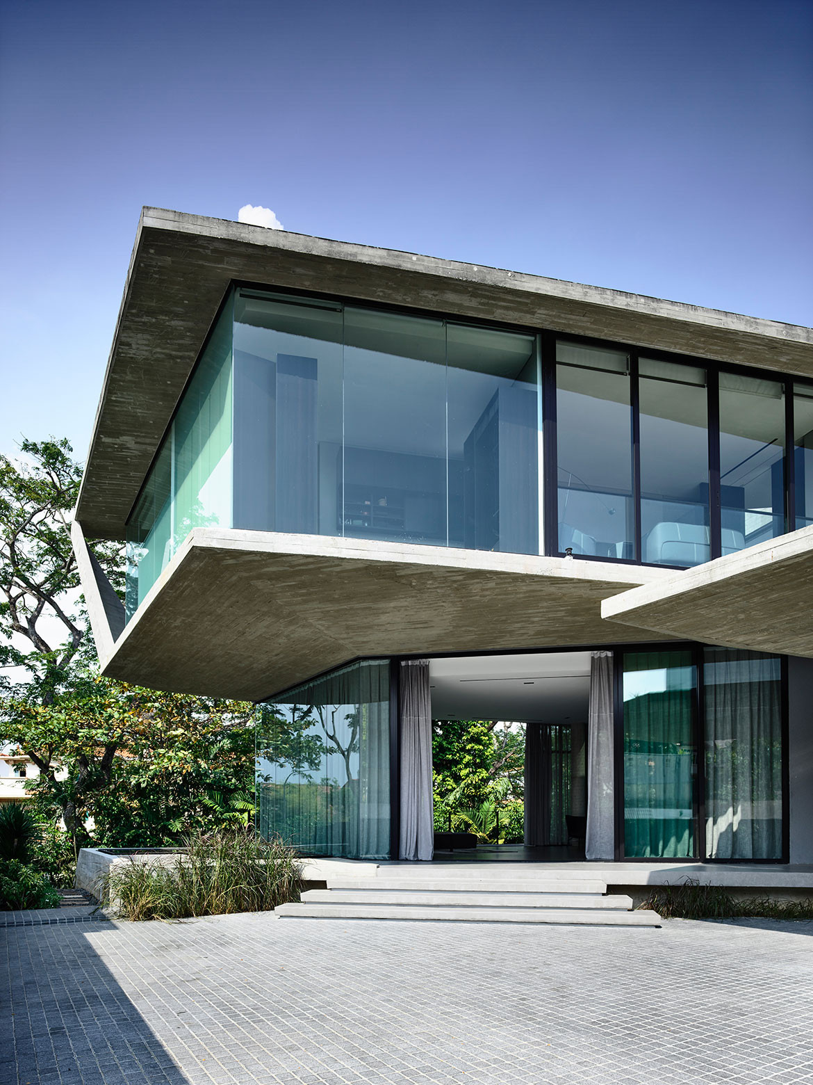 Happily, for Christina Thean, director at Park + Associates, one such owner approached her with just such a brief for their family of five. “Mr Teo’s brief to us was that they didn’t want a giant boxy house like those in the neighbourhood,” she recalls. Presenting them with an initial ground-hugging design, the owners were glad to see their ideas on scale aligned. “How did you guess we had also wanted a 2-storey house?” they asked. Composed in a horizontal sweep, the run of the residence’s upper body is perched over the entry hall with a dramatic cantilever, as if the house is poised for takeoff like the planes at Changi Airport, which is less than 1.5 kilometres from its location. A semi-basement level is tucked away from the approaching view by taking advantage of a floor-high drop in the terrain, but it is otherwise entirely open towards the greenery at the back. Elsewhere, the language is faceted and angular, making the massing more terrestrial than aerial, as if hewed tectonic plates have been playfully folded over fragile planes of ethereal glazing. The composition is simple and complete, both externally and internally, in that nothing can be added or subtracted without jarring the whole. “We wanted the architecture to be its structure, without frills,” Christina explains.