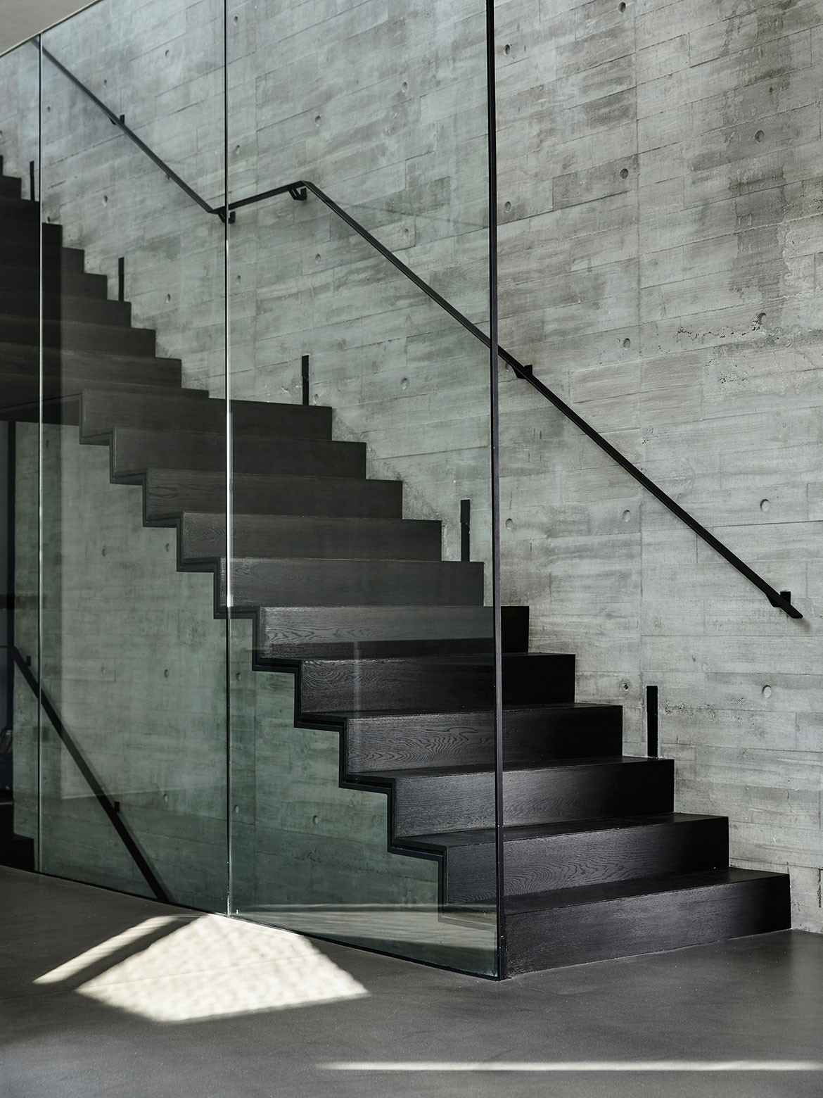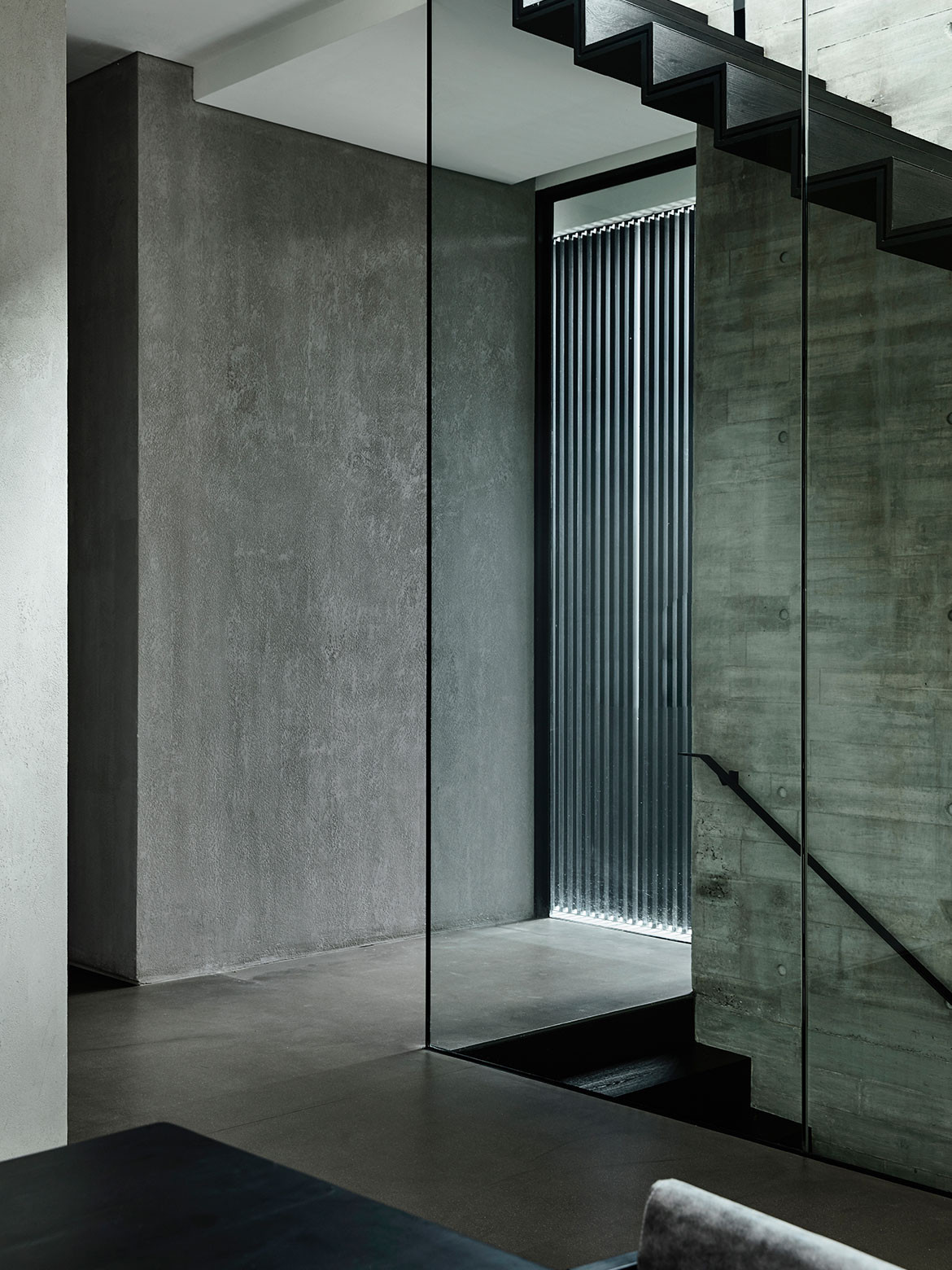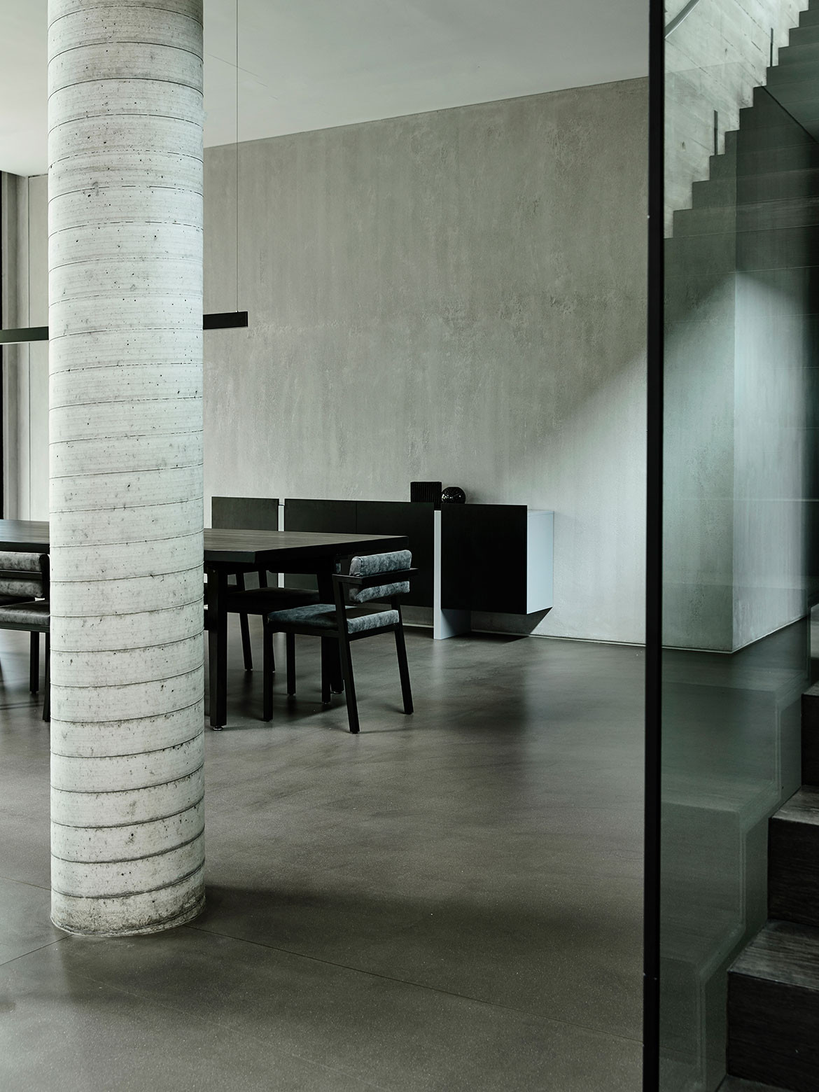 Happily, for Christina Thean, director at Park + Associates, one such owner approached her with just such a brief for their family of five. “Mr Teo’s brief to us was that they didn’t want a giant boxy house like those in the neighbourhood,” she recalls. Presenting them with an initial ground-hugging design, the owners were glad to see their ideas on scale aligned. “How did you guess we had also wanted a 2-storey house?” they asked. Composed in a horizontal sweep, the run of the residence’s upper body is perched over the entry hall with a dramatic cantilever, as if the house is poised for takeoff like the planes at Changi Airport, which is less than 1.5 kilometres from its location. A semi-basement level is tucked away from the approaching view by taking advantage of a floor-high drop in the terrain, but it is otherwise entirely open towards the greenery at the back. Elsewhere, the language is faceted and angular, making the massing more terrestrial than aerial, as if hewed tectonic plates have been playfully folded over fragile planes of ethereal glazing. The composition is simple and complete, both externally and internally, in that nothing can be added or subtracted without jarring the whole. “We wanted the architecture to be its structure, without frills,” Christina explains.