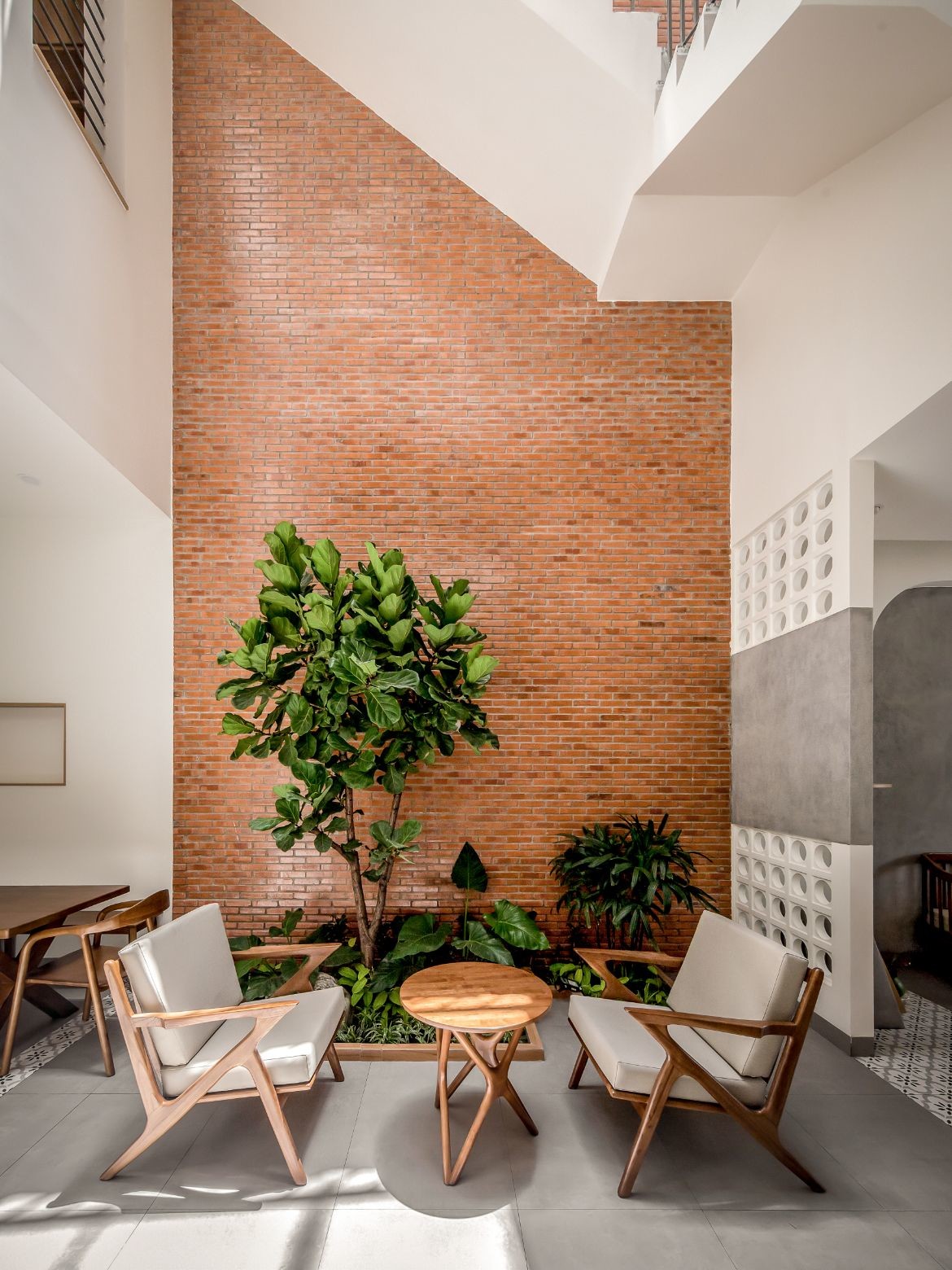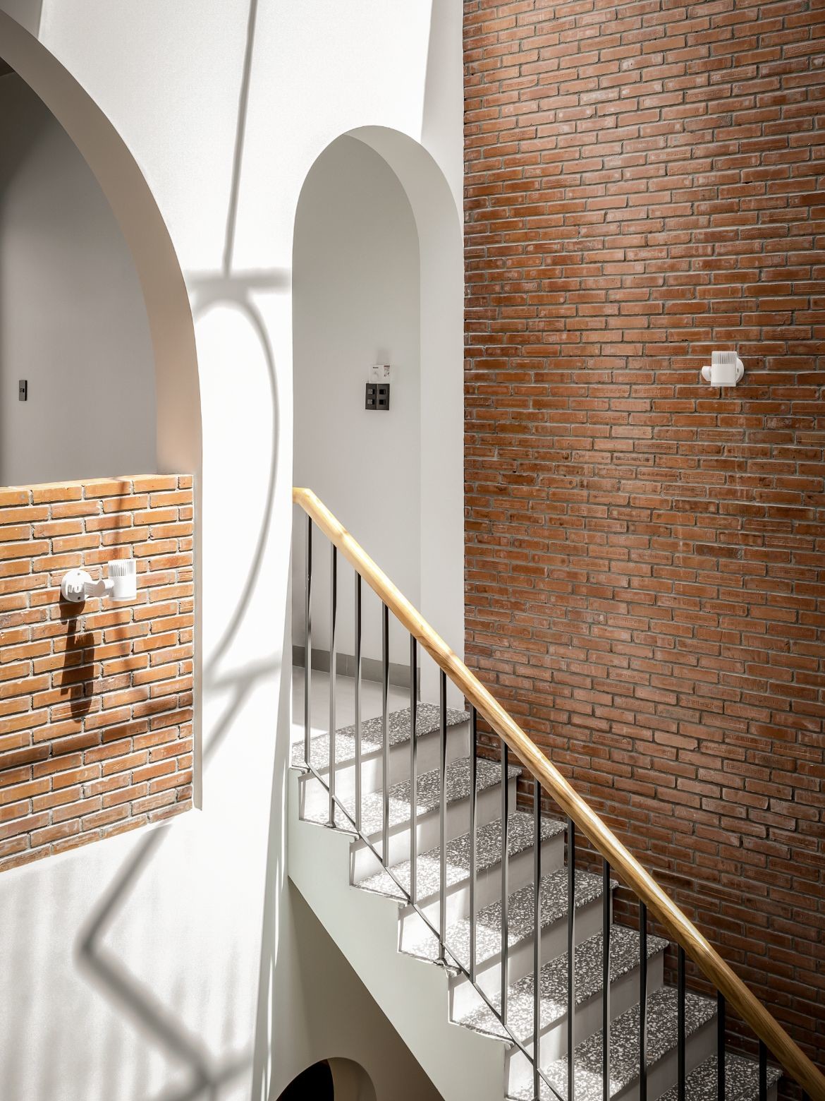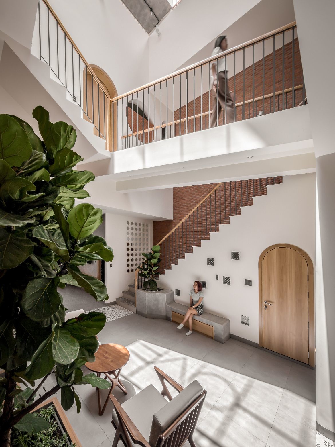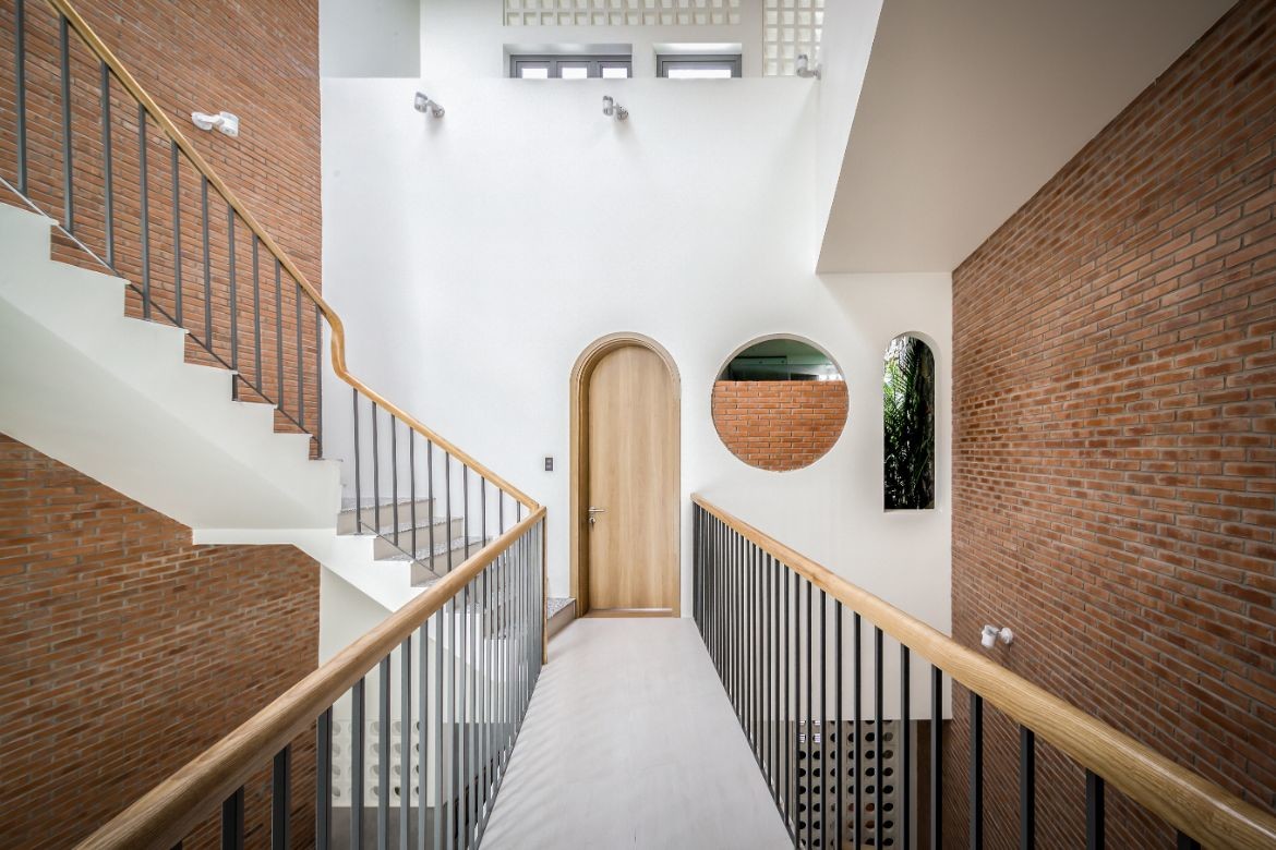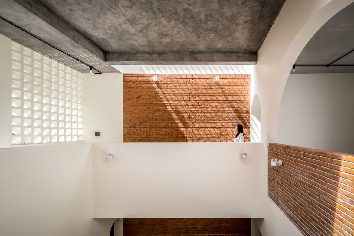 On upper floors, arched doorways lead to mezzanines, interior walkways and stairways that frame the atrium. Dappled light from petite square and circular wall details enlivens these interstitial spaces, where the journey is as important as the destination.
