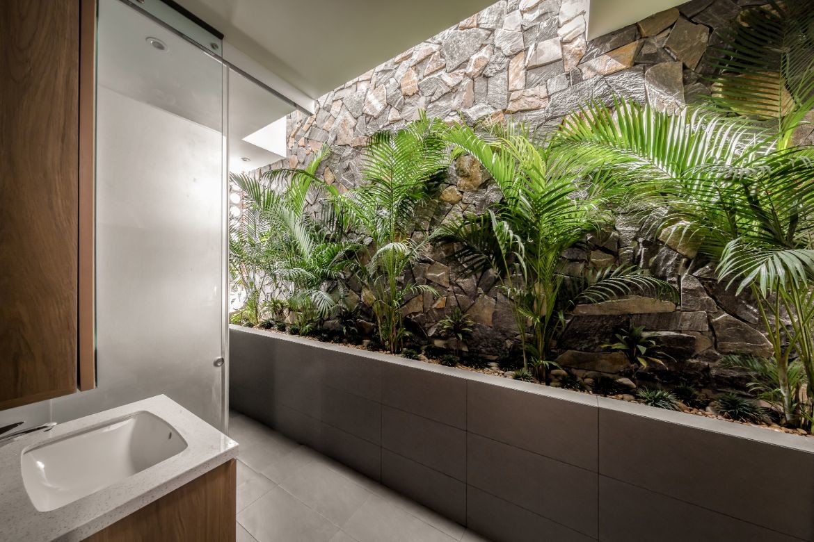 Unexpected hints of natural connection evoke calm throughout. Bathrooms are fringed by ferns in planters against a slate-like stone wall. A skylight strip above gives the experience of bathing in a lush grotto surrounded by glistening water.