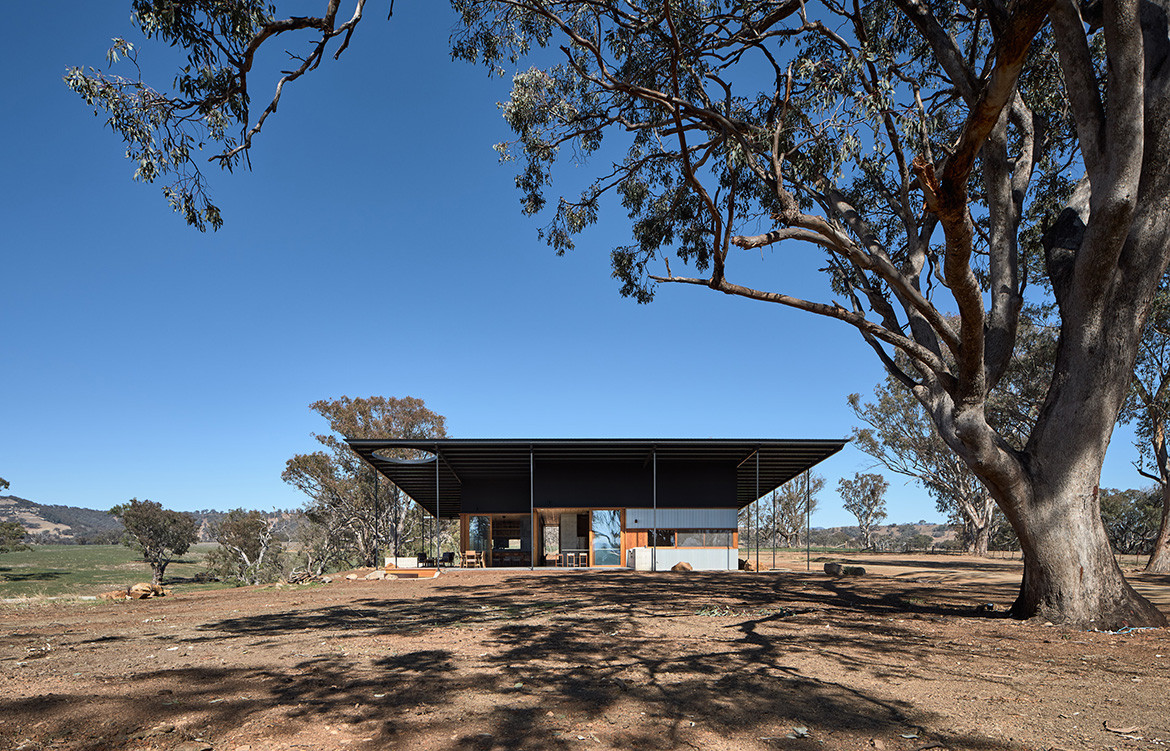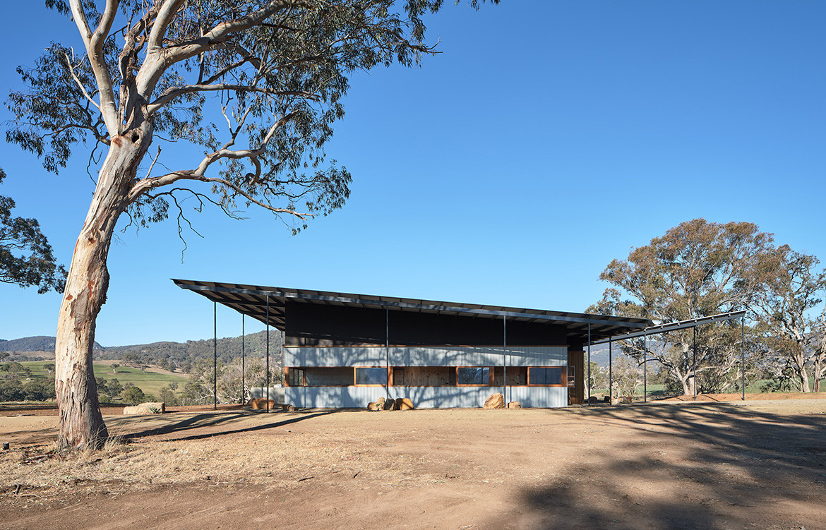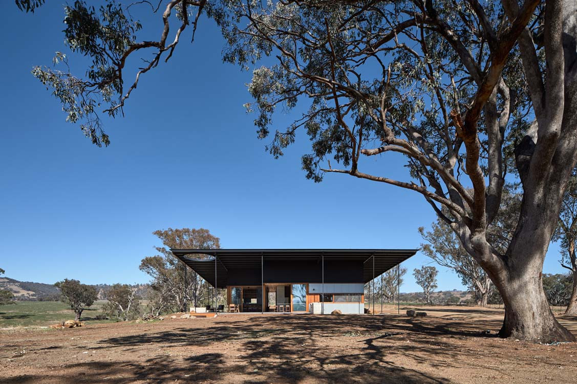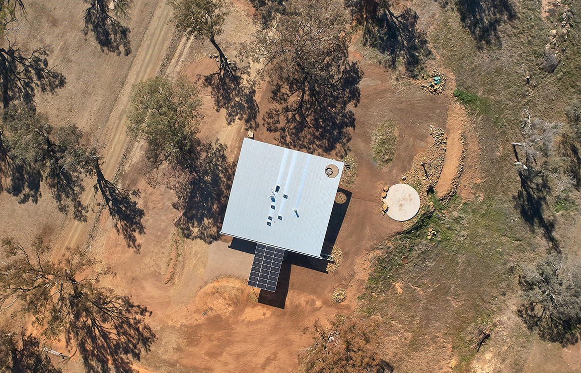 The residents of the Upside Down Akubra House came to architect Alexander Symes with a relatively comprehensive brief. They owned a 314-hectare bull farm outside Nundle (50 kilometres south east of Tamworth) and had already selected the spot on which the house was to reside. At the crest of a gentle hill the clients wanted to capture the views in literally all directions: Yella Rock to the south, Hanging Rock to the east, views north through a grove of Eucalypts and west over the bull paddocks to the rolling hills that follow. “Essentially an amazing 360-degree view all the way around,” says Alexander. But it wasn’t that simple: given its remoteness, it also needed to be completely off-grid.
