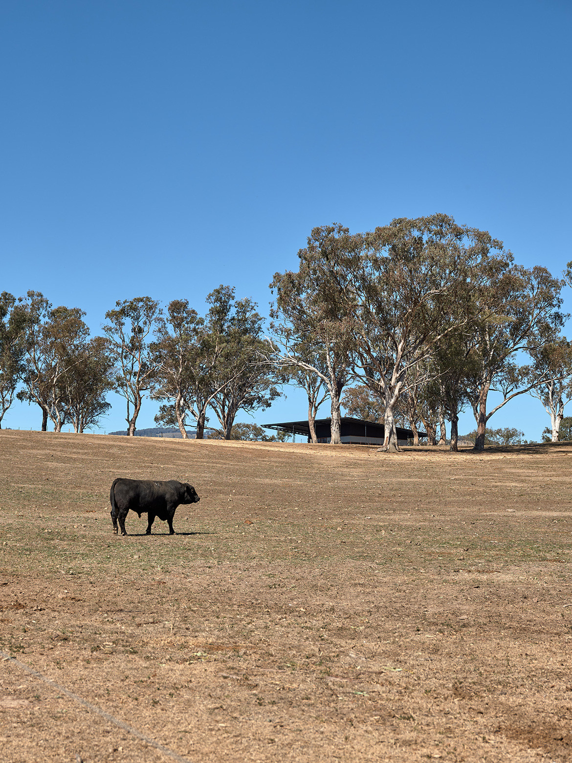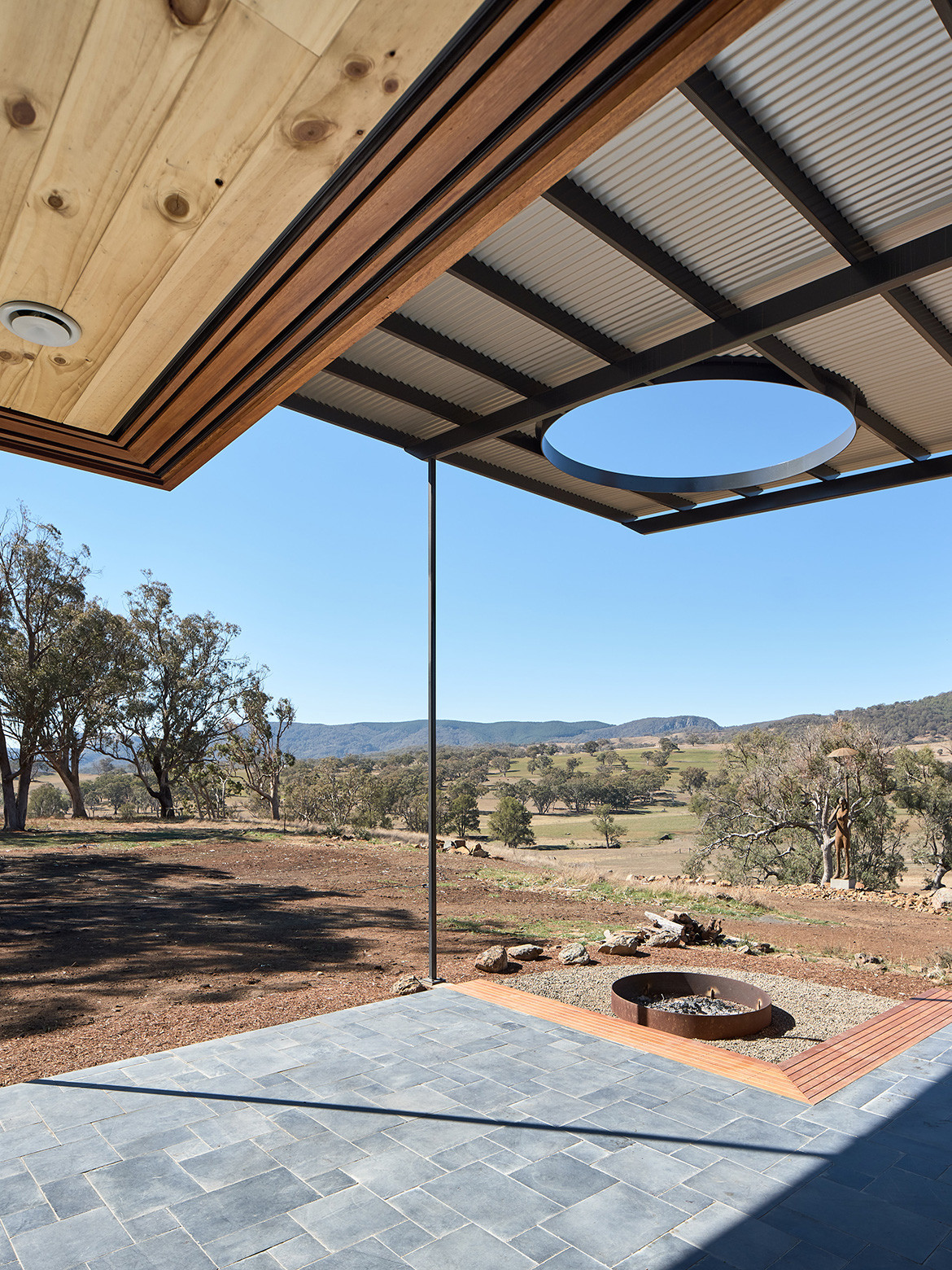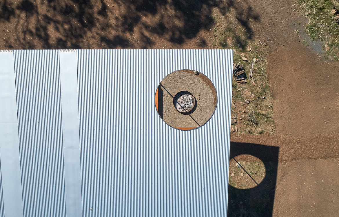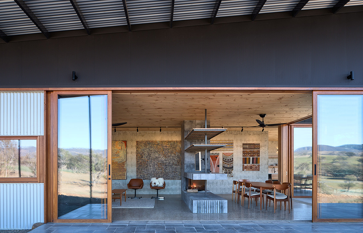The residents of the Upside Down Akubra House came to architect Alexander Symes with a relatively comprehensive brief. They owned a 314-hectare bull farm outside Nundle (50 kilometres south east of Tamworth) and had already selected the spot on which the house was to reside. At the crest of a gentle hill the clients wanted to capture the views in literally all directions: Yella Rock to the south, Hanging Rock to the east, views north through a grove of Eucalypts and west over the bull paddocks to the rolling hills that follow. “Essentially an amazing 360-degree view all the way around,” says Alexander. But it wasn’t that simple: given its remoteness, it also needed to be completely off-grid.
