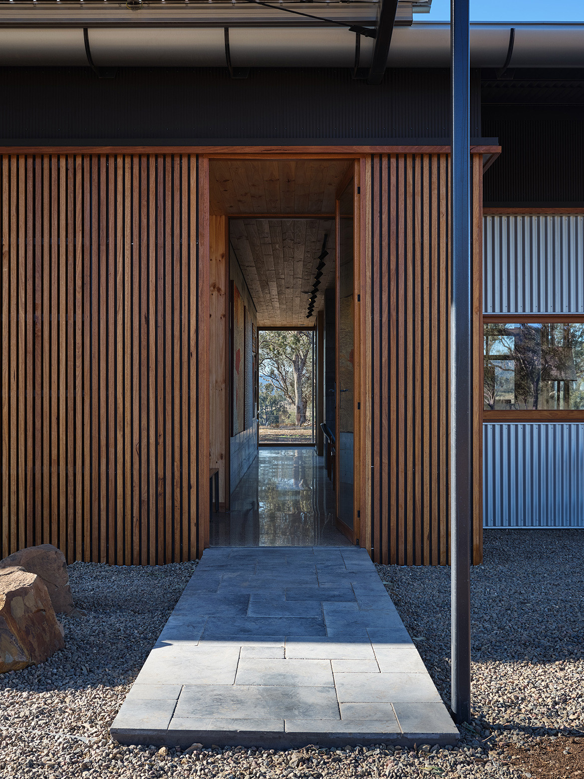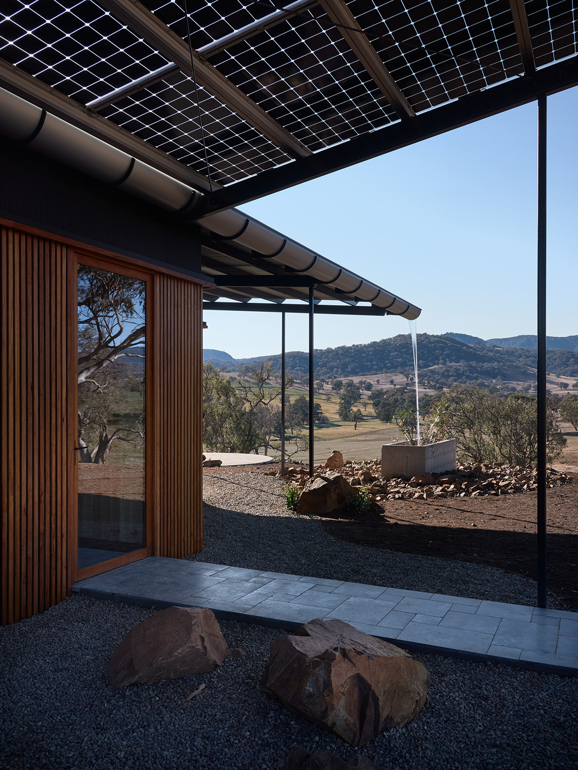 The skillion roof intersects with the carport roof in a double skillion style. The 80 square metres of the carport roof are comprised of LG neon bi-facial photo-voltaics, which in turn generate enough energy to run the house. The angle of the main roof and a 450-millimetre diameter gutter encourages rainwater to the eastern corner of the roof, where it free-falls “like a waterfall” into a concrete trough. This then feeds the rainwater into a 107,000-litre rainwater storage tank that collects enough water for the household and the management of waste.