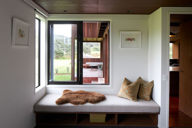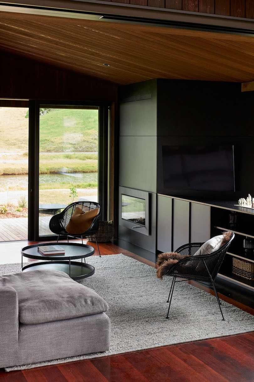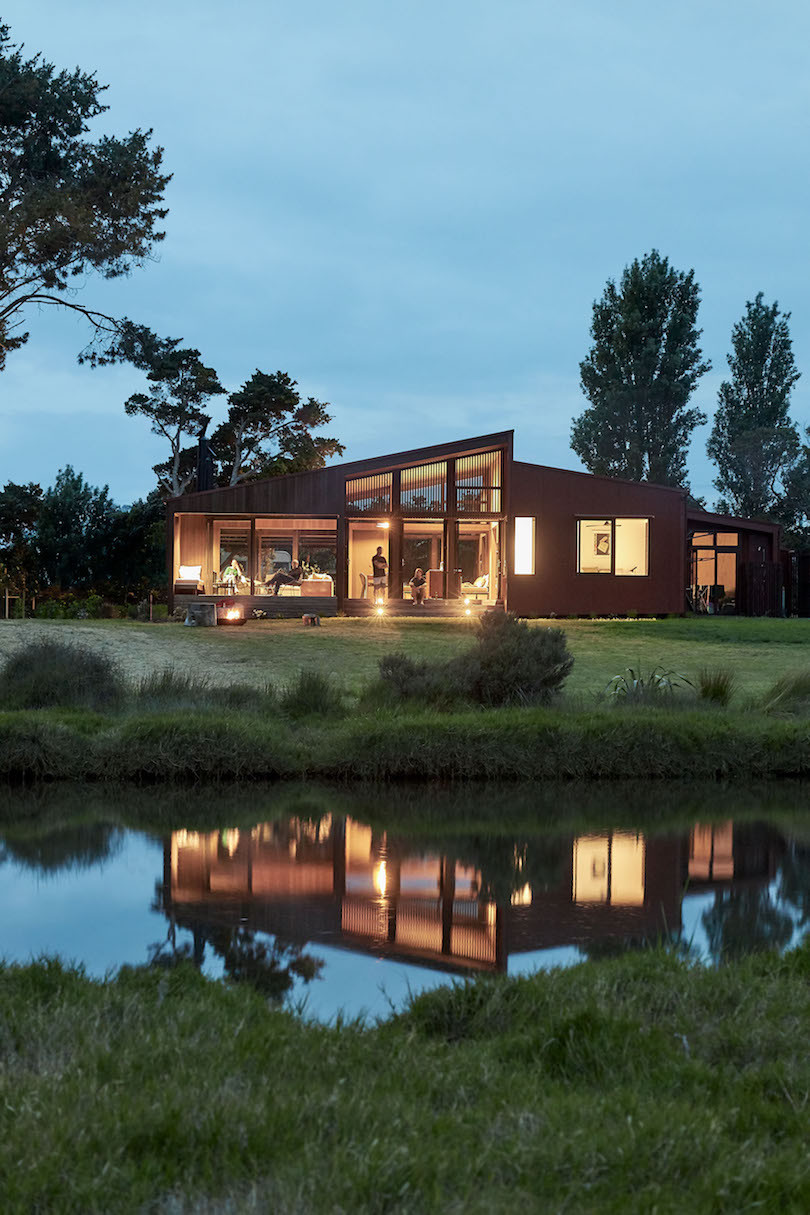 Exterior materials are wrapped inside, to bring the rural character into the interior. Kwila flooring, meranti plywood and stained cedar make it feel contained and sheltered – a comforting ‘blanket’ compared with the openness and scale of the landscape and Pacific Ocean nearby. Framed views over the adjacent Pungapunga River and farmland have a timeless feel. The spirit of this family cabin is unobtrusive and intimate, while executed in many subtle and artful ways – with intricate corners and junctions, precise lines and flush, seamless detailing.