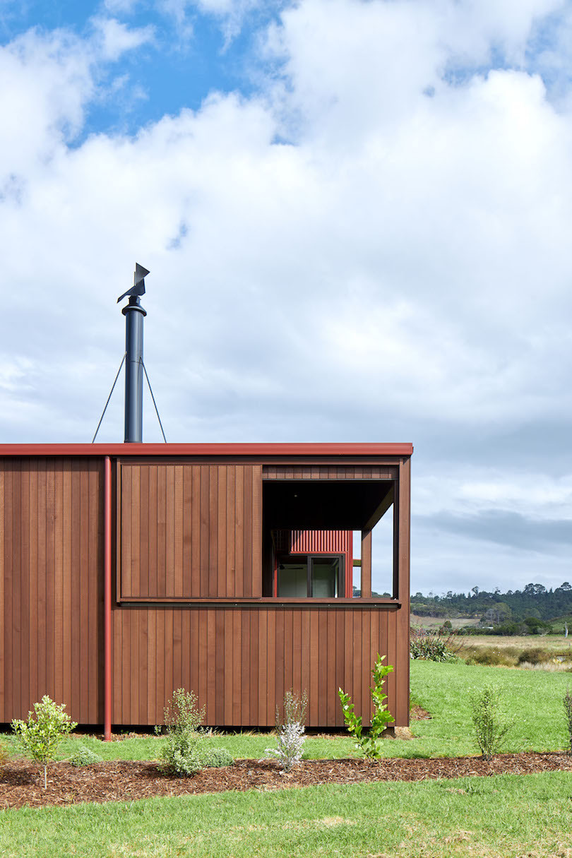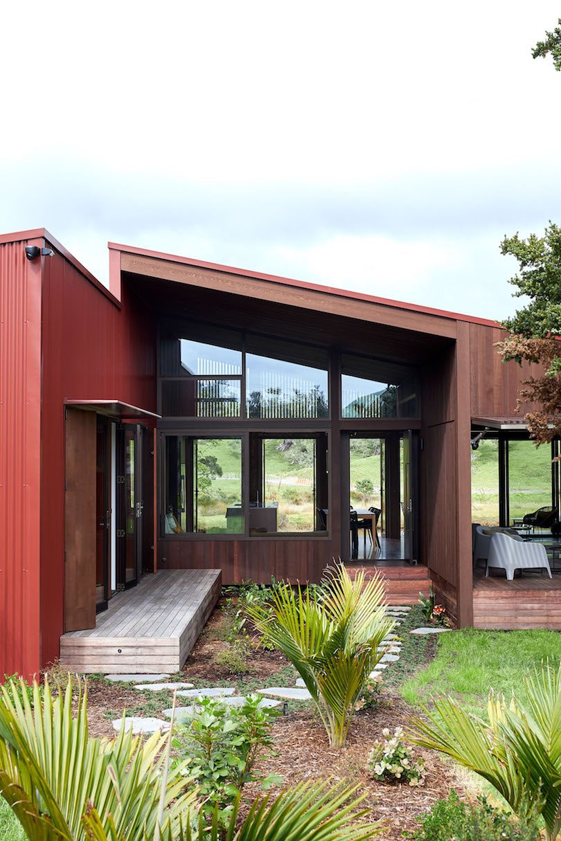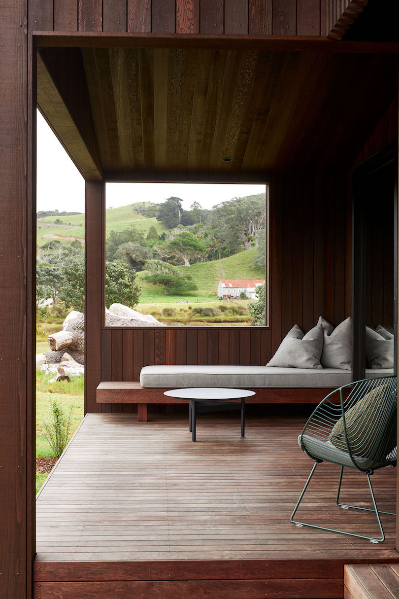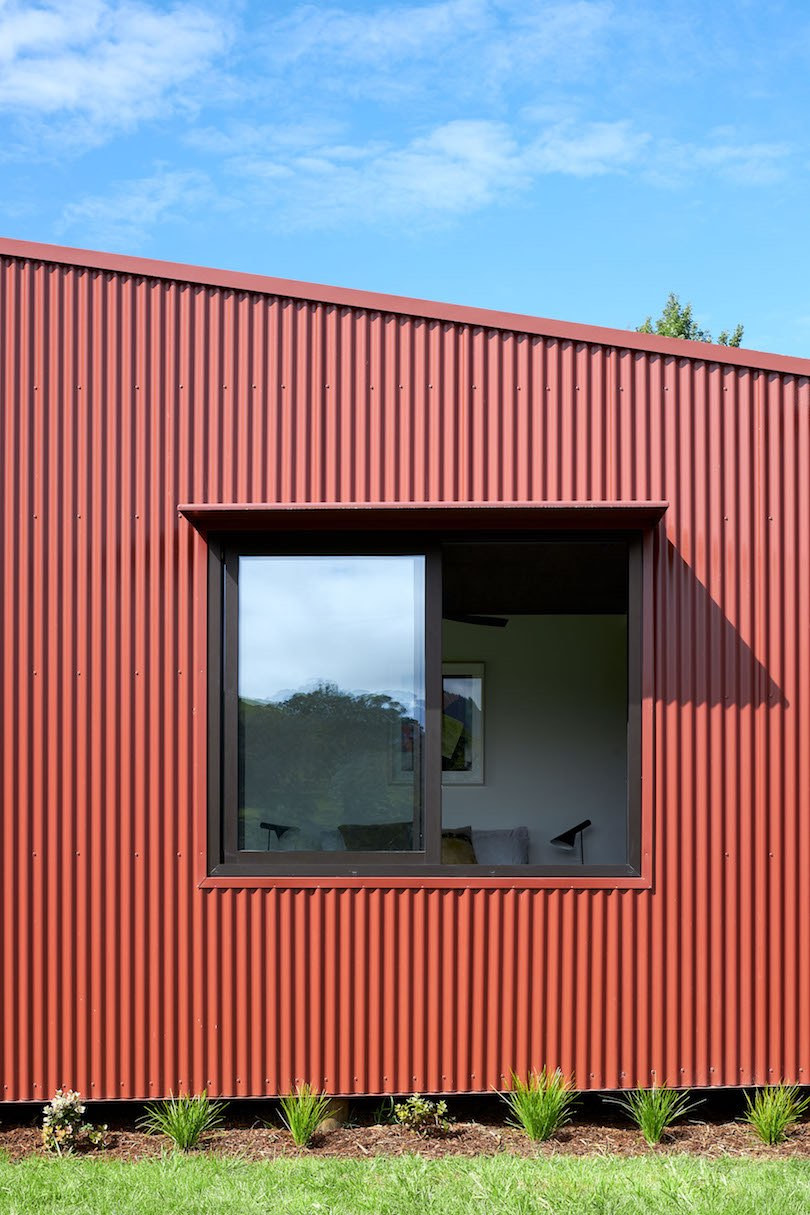 Living areas are located to the north and clad in dark-stained cedar. Bedrooms are located to the south – a retreat in the heat of the day – and covered in a rich scoria-red corrugate. The red is a reference to multiple strands of cultural heritage: painted Māori carvings and whare, the iconic red barn, the rusty colours of volcanic scoria.