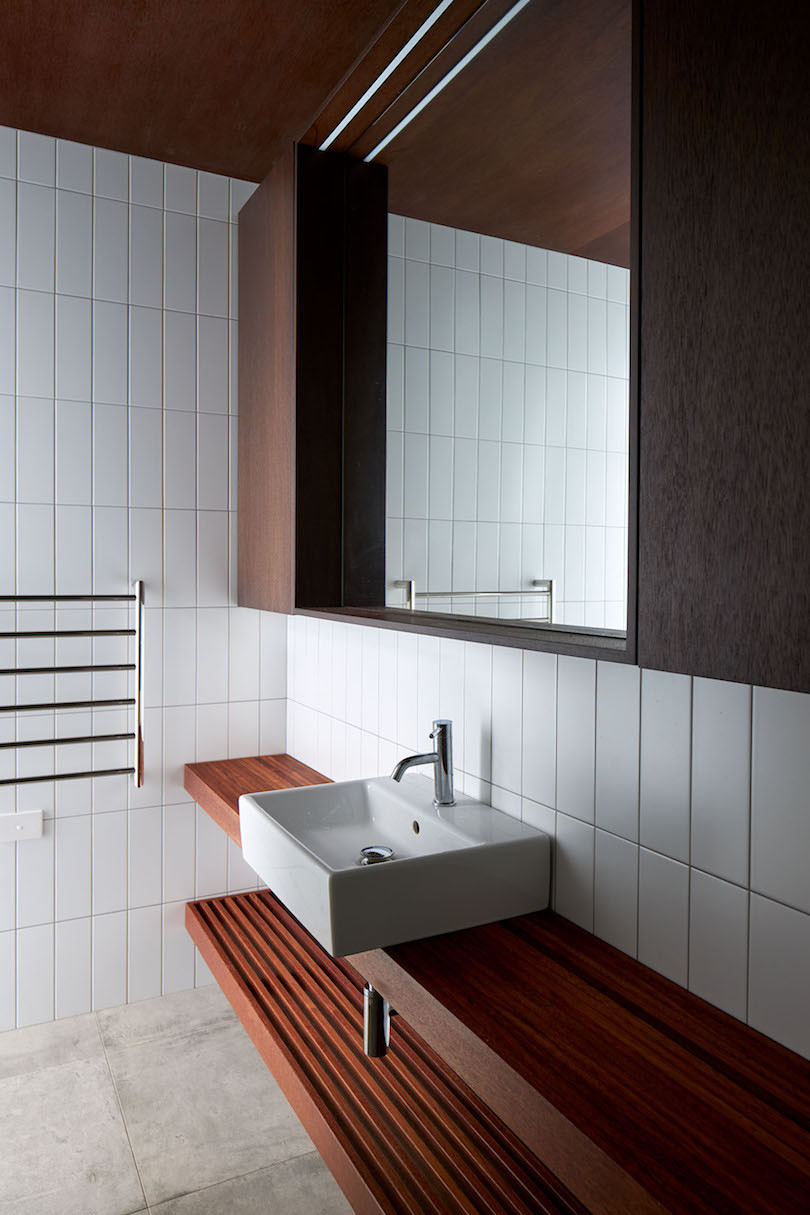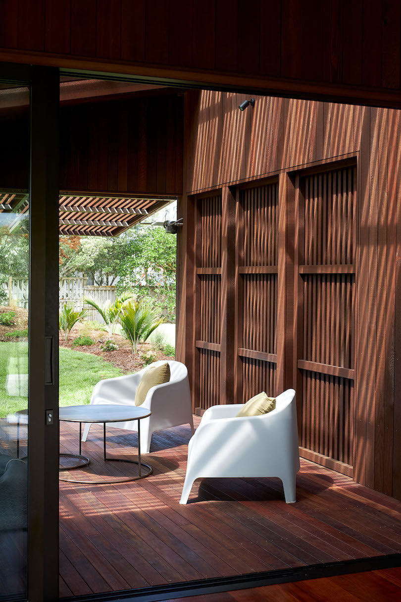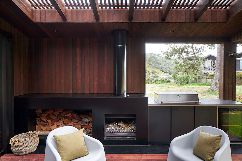 A superbly functional outdoor room becomes an extension of the kitchen, with a continuous benchtop threaded inside and outside and fitted with an outdoor fireplace and BBQ. Just as the exterior wraps inside, the interior stretches out to capture the sun, breeze and view. It’s a perforated shed of interlocking, positive and negative casual social and retreat spaces.