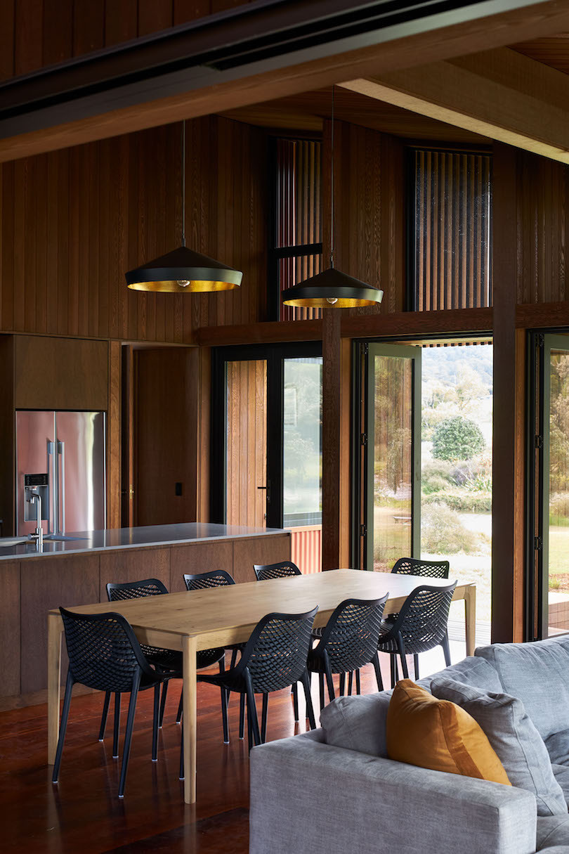 Volumes are refined and elegant in their simplicity, inspired by a small corrugated shed on the farm across the river. Adopting a similar low-pitched roof and humble iron cladding, the architects have added timber detailing, decks and landscaping to develop a sophisticated yet pared-back aesthetic. It doesn’t shout. It’s a quiet, clever house that is much larger on the inside than it looks on the outside.