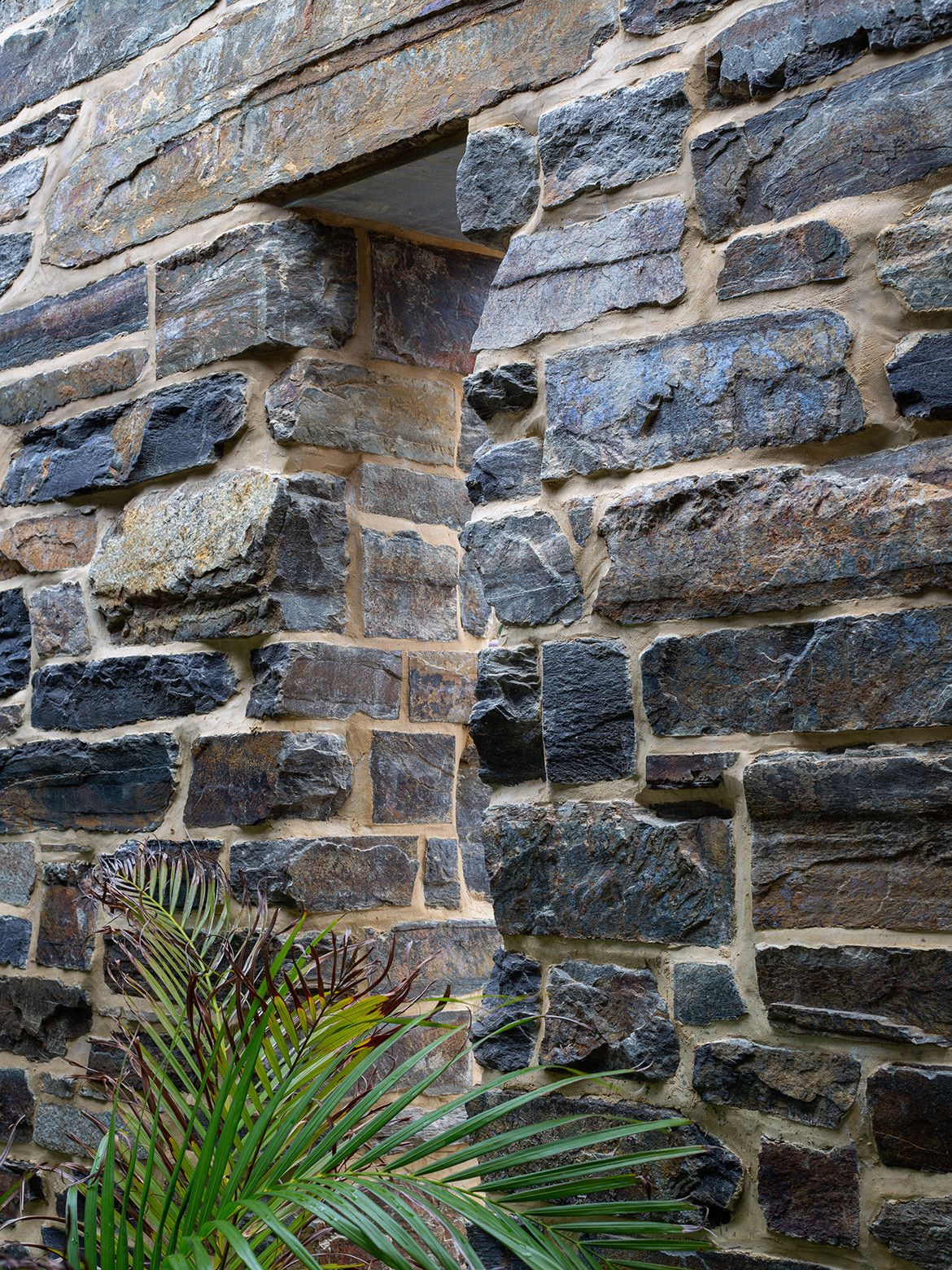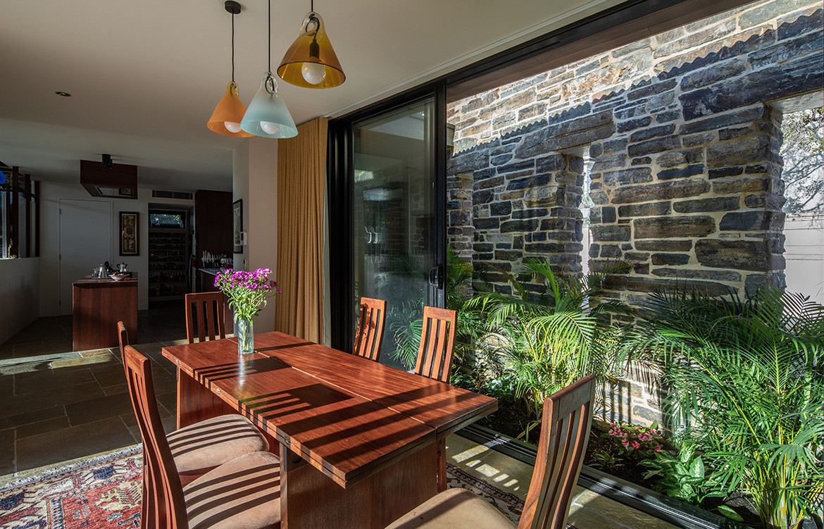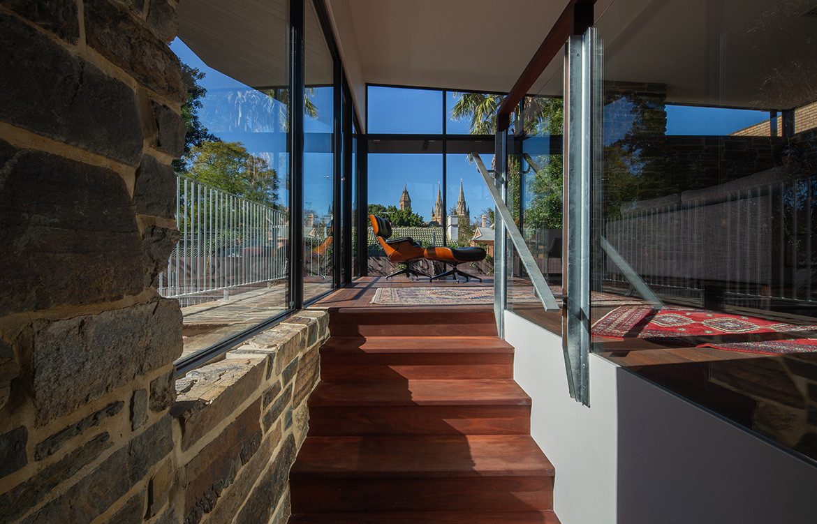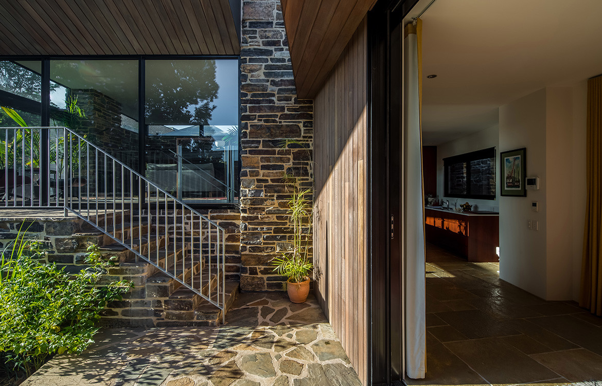 To provide privacy from that passing traffic, and protection from the hot afternoon sun along the western elevation, Nathan shielded the house with a stone wall made of locally quarried Bluestone, a material that is plentiful throughout the suburb. Apertures in the wall provide views into and out of the house, and one of them looks straight through the house to frame a view of the nearby St Peters Cathedral.