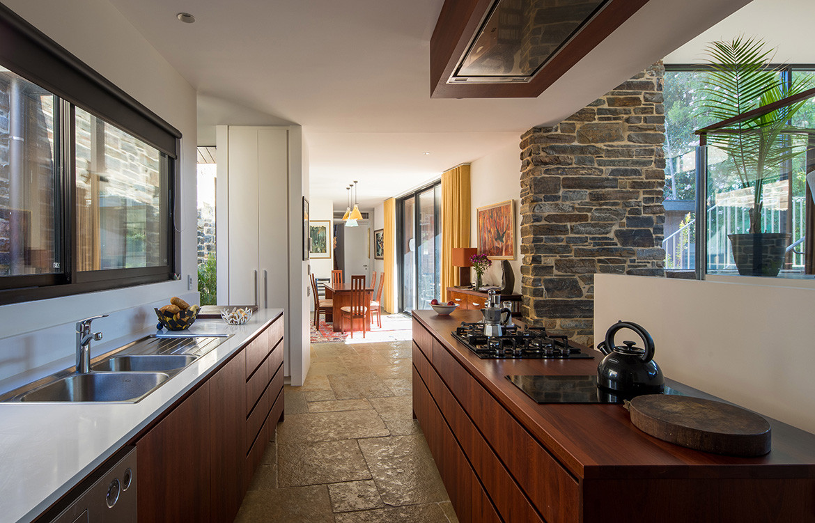 The stonework grounds the house in its context, and while stone sometimes carries a reputation for being a difficult work with, that wasn’t the case here. “We visited the quarry in the Adelaide Hills and we loved the way the stone came off the mountain,” Nathan says. “They’d pull up a front-end loader to loosen it, then collect it manually and cut it. There is a minimal amount of work to get the material ready for use in 100-millimetre deep pieces, and it was laid onsite by a bricklayer.”
