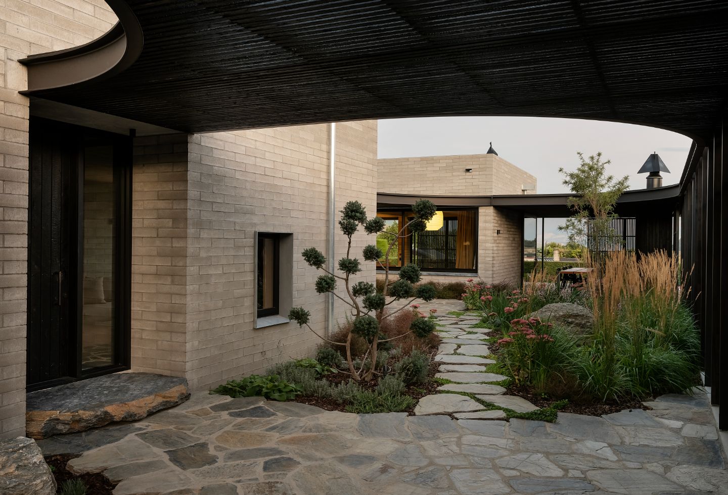 This appeal to different modes of inhabitation is seasonal. In winter, a low-lit, dark-clad mudroom transitions to a light-filled interior with framed views of the mountains beyond. In summer, a casual meander over stone steps links a sequence of gardens to a spacious central courtyard at the heart of the home.