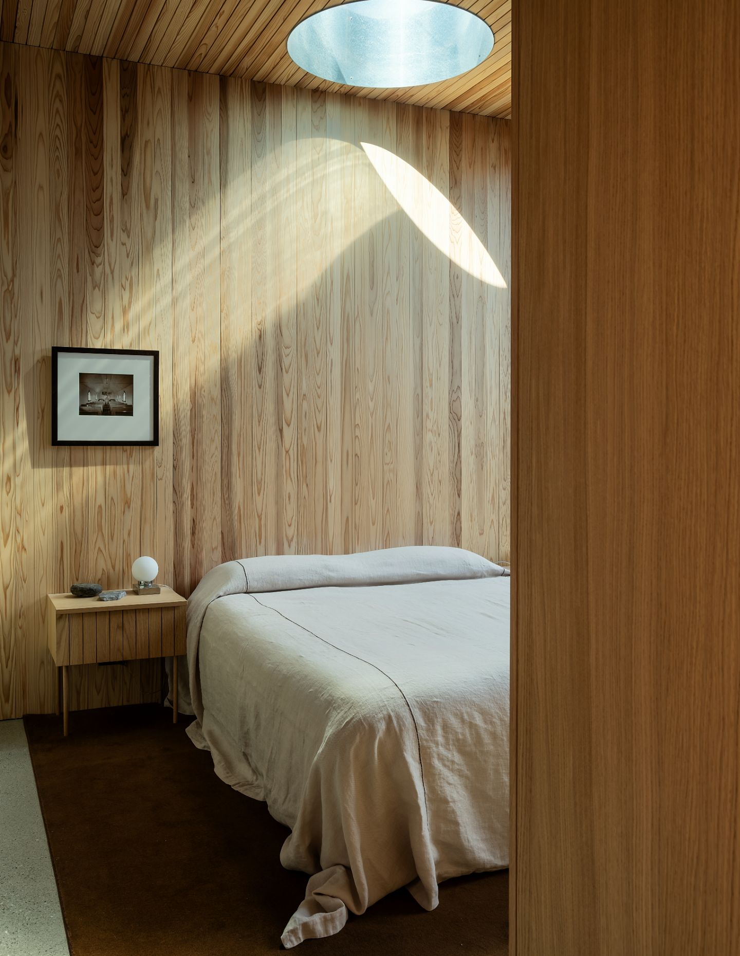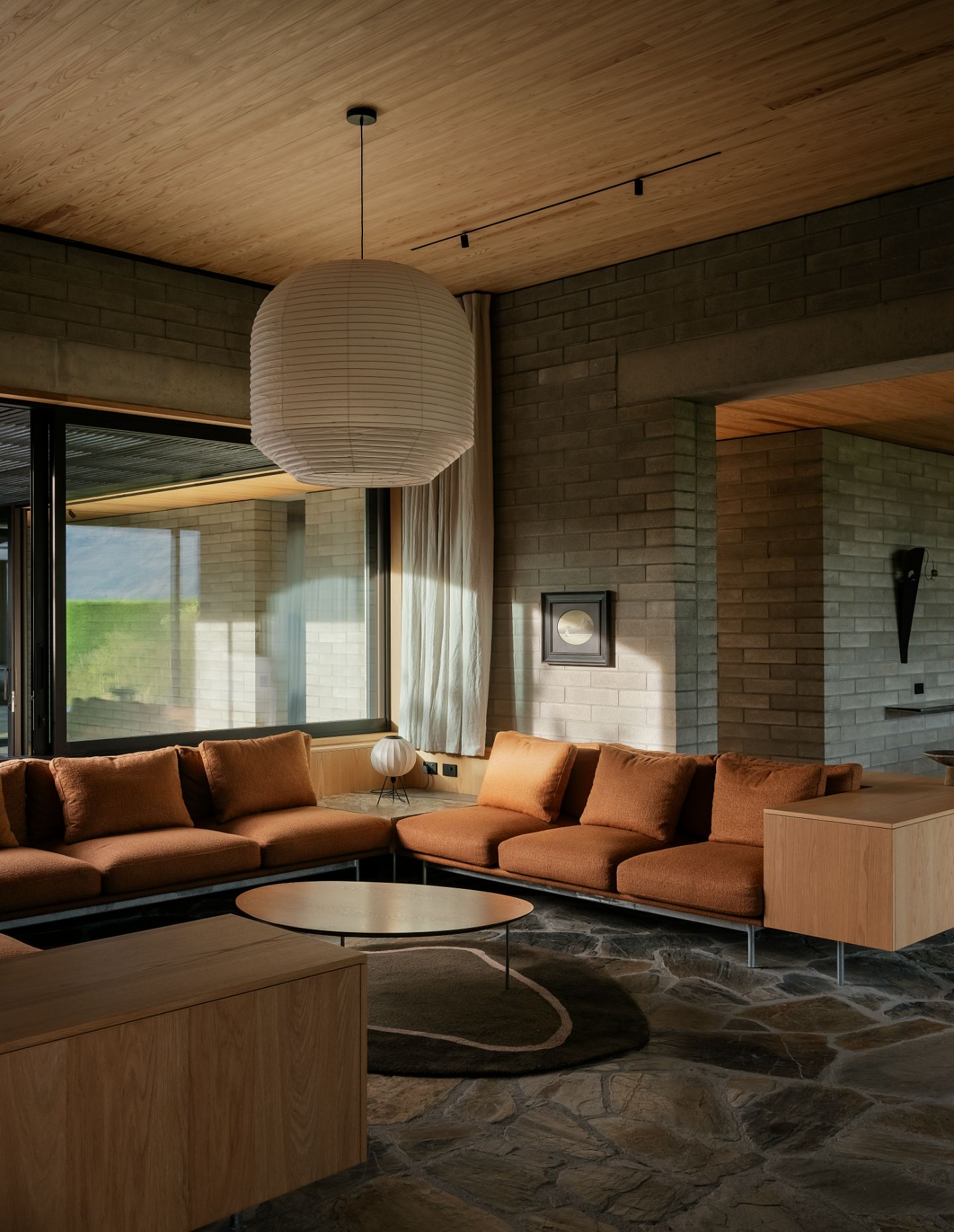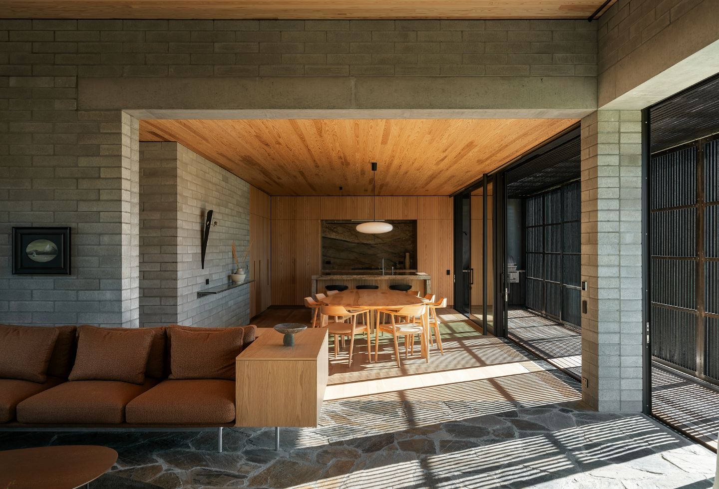 A reduced palette of natural mateerilas creates continuity between inside and out. The module of these materils inform everything from the characterful detailing to the proportion and openings of each room.