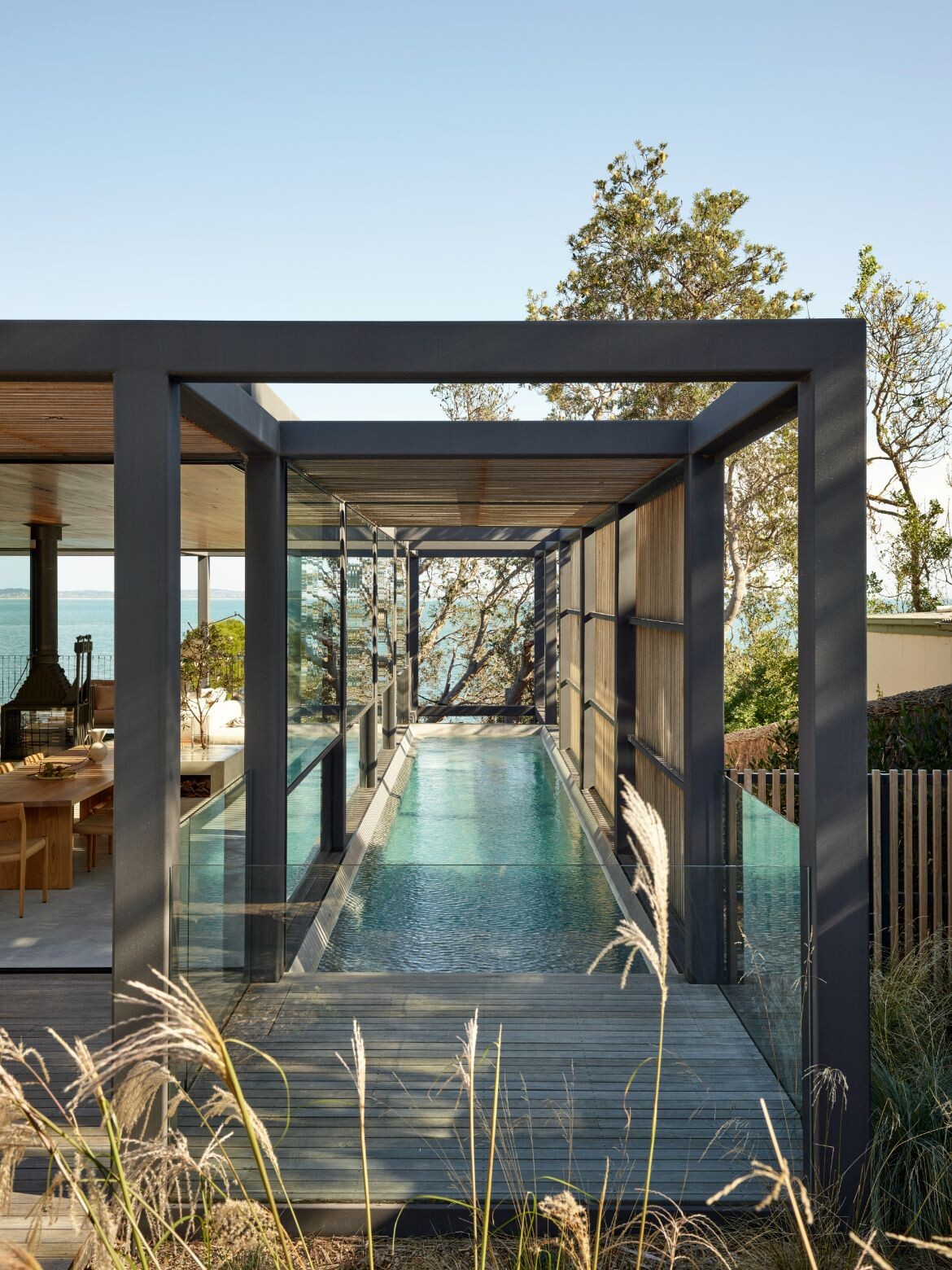 The spaces, which include an open-plan kitchen, dining and living areas, are generous, leading to a terrace to the south overlooking Somers Beach and a 14-metre lap pool to the west. The pool is framed by a timber-battened wall that allows diffuse light as well as privacy from a neighbouring property.