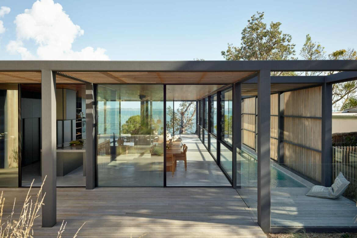 While the steep site and water views helped shape this two-level, timber-clad, expressed steel-framed house, it was the creation of a new timber pavilion adjacent to the beach that formed a maquette for the design of the main building.