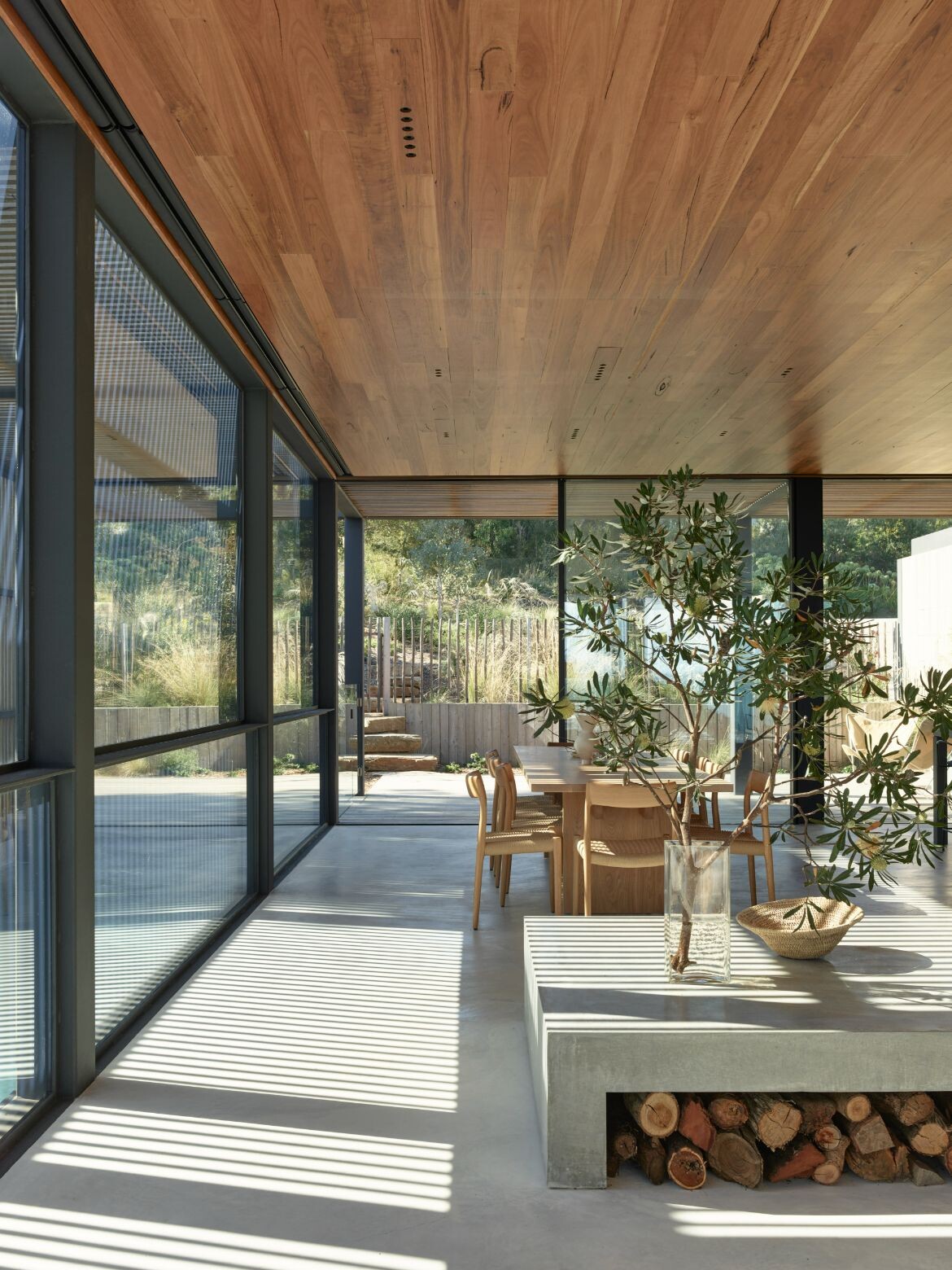 He was mindful of creating an efficient house when it came to the use of heating or cooling. When the summer heat puts out its sting, operable timber-battened screens can conceal the large picture windows.