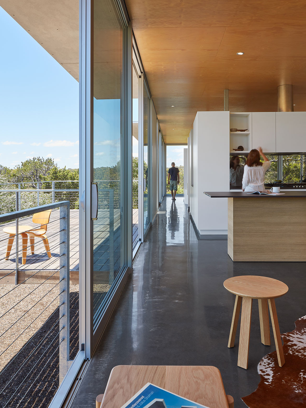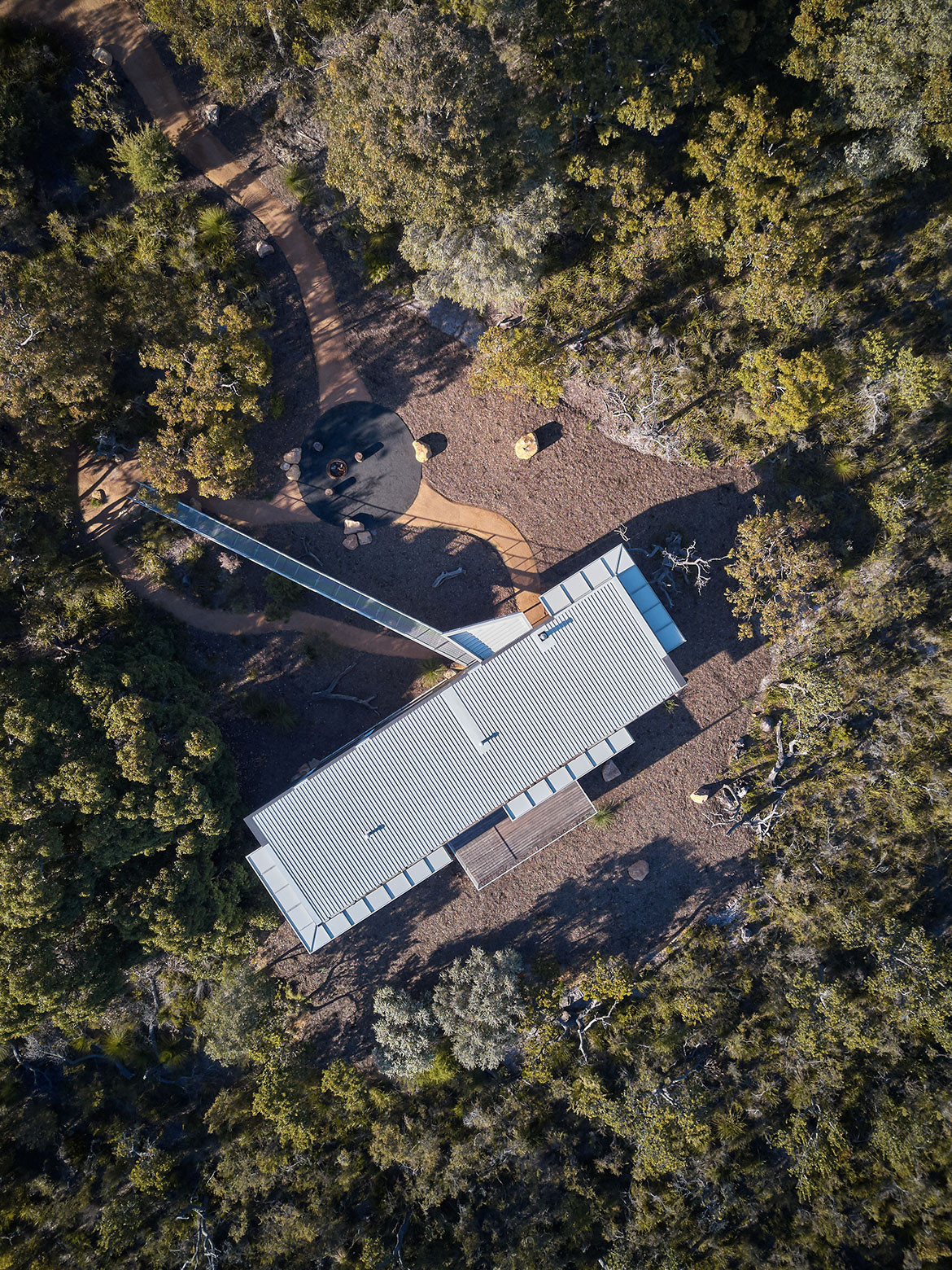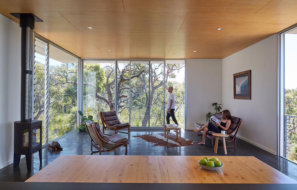 The interior is calm and neutral with white walls and Hoop Pine ceiling to draw focus to the natural landscape. The walls stop short of the ceiling and there are no internal doors in order to enhance the visual flow and amplify the sense of a singular open space. Eaves extend beyond the glass walls of the house, like the awning of a tent, to block summer sun while allowing winter rays to warm the charcoal-pigmented floor slab.