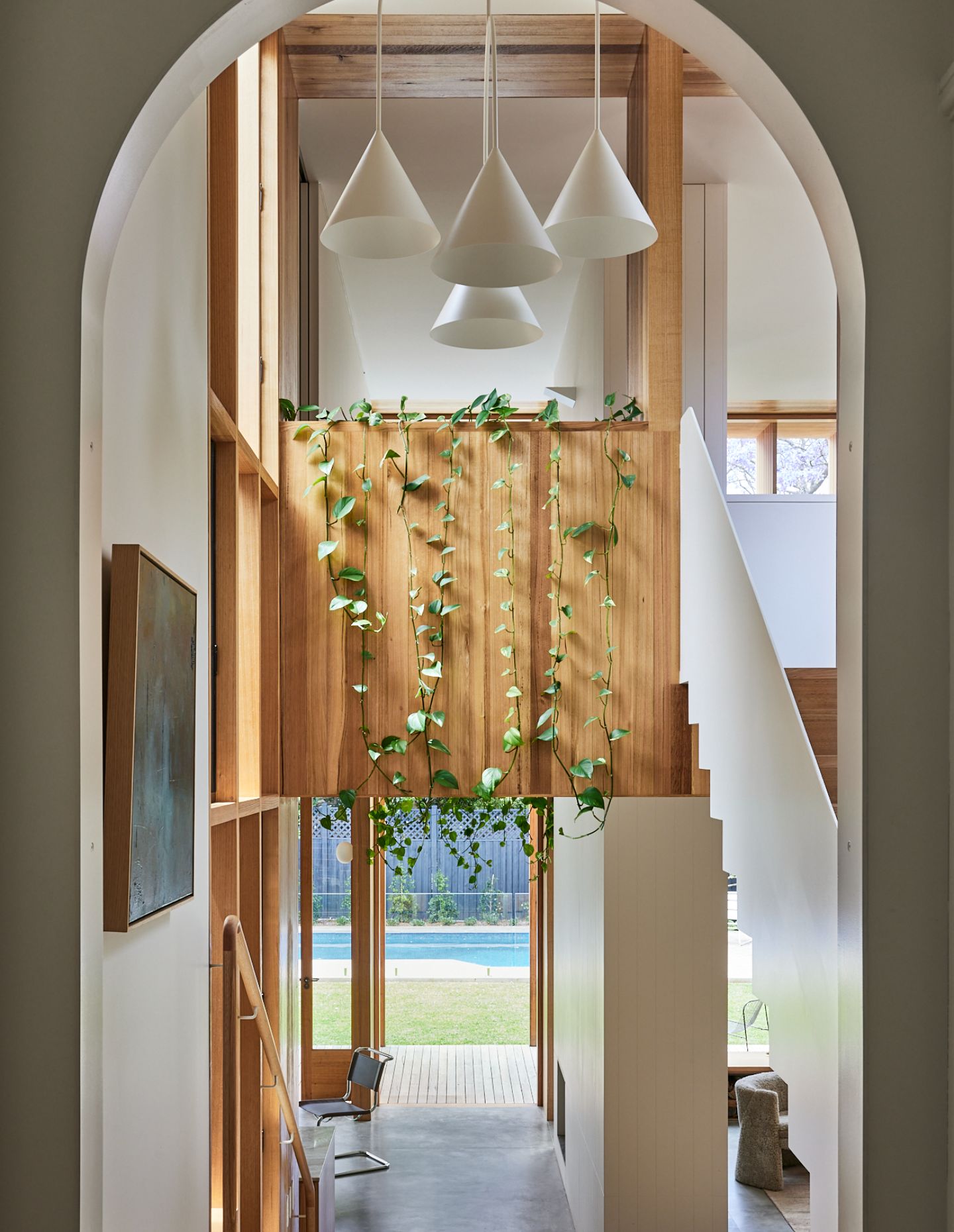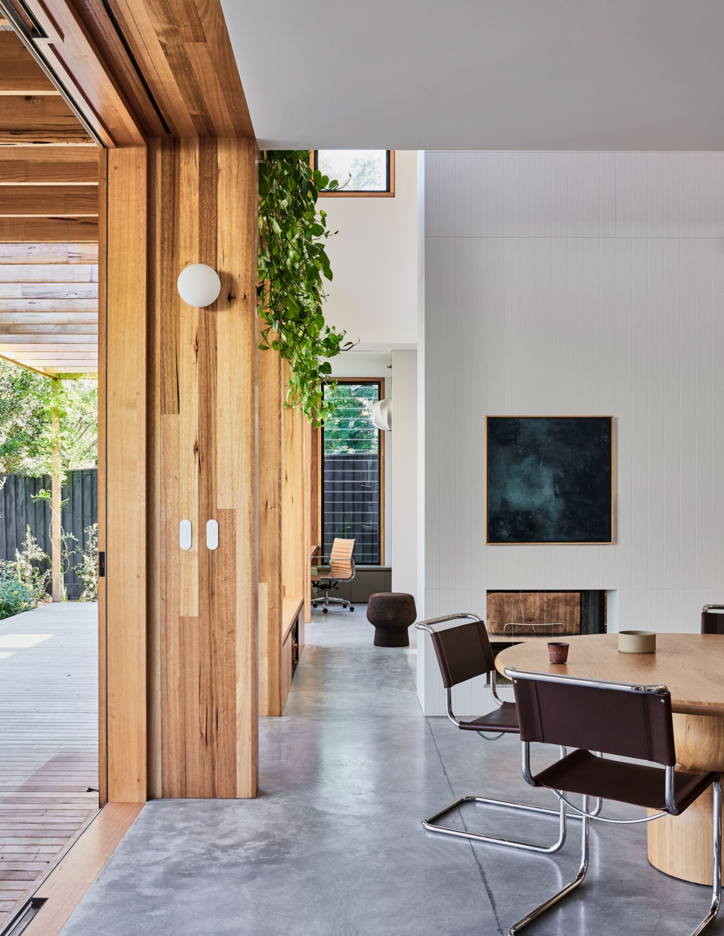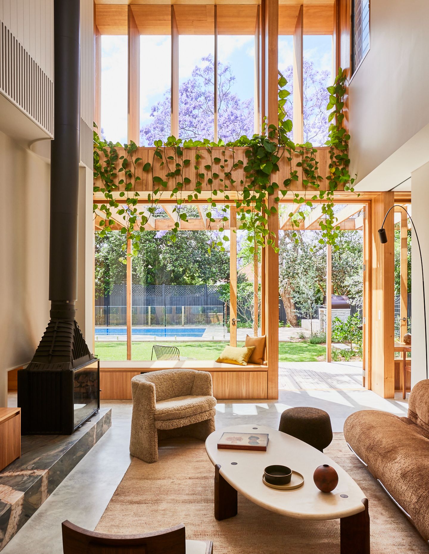 A light, airy pavilion is rhythmically expressed in Victorian ash. Within, a double-height void opens up the living space to sunlight and air, deepening the links between the private upstairs spaces and the downstairs spots in which the family comes together. A fireplace divides the open-plan living, kitchen, and dining spaces, which flow serenely onto the east-facing deck covered by a wisteria-clad pergola that frames the garden view. It is a home perfectly suited to entertaining and elevating the simple daily ritual of a meal in the sun.