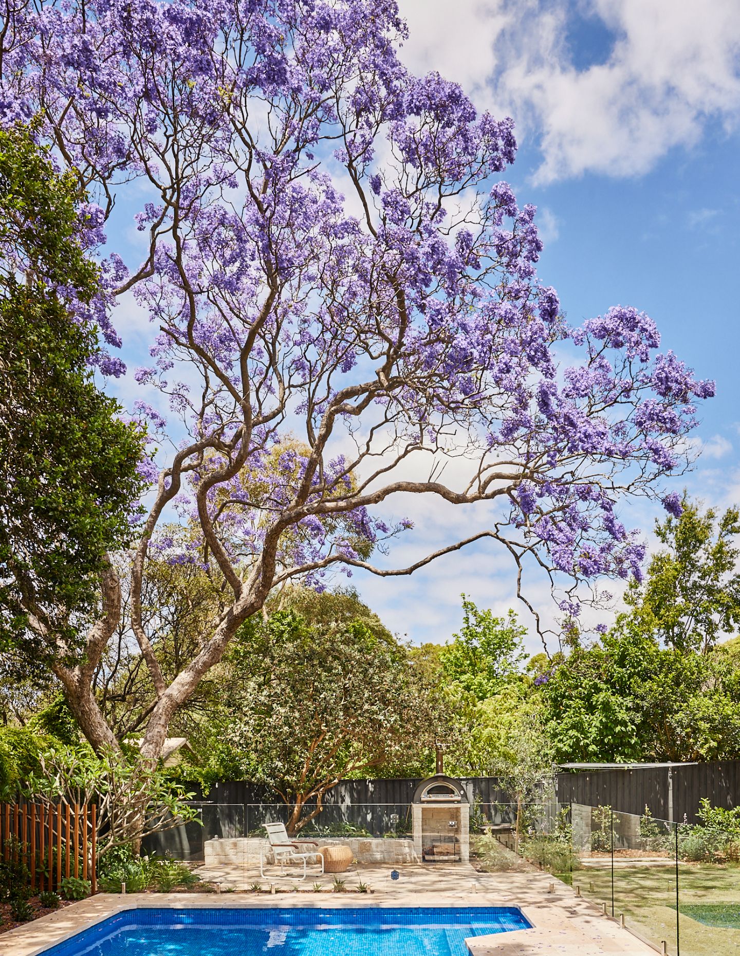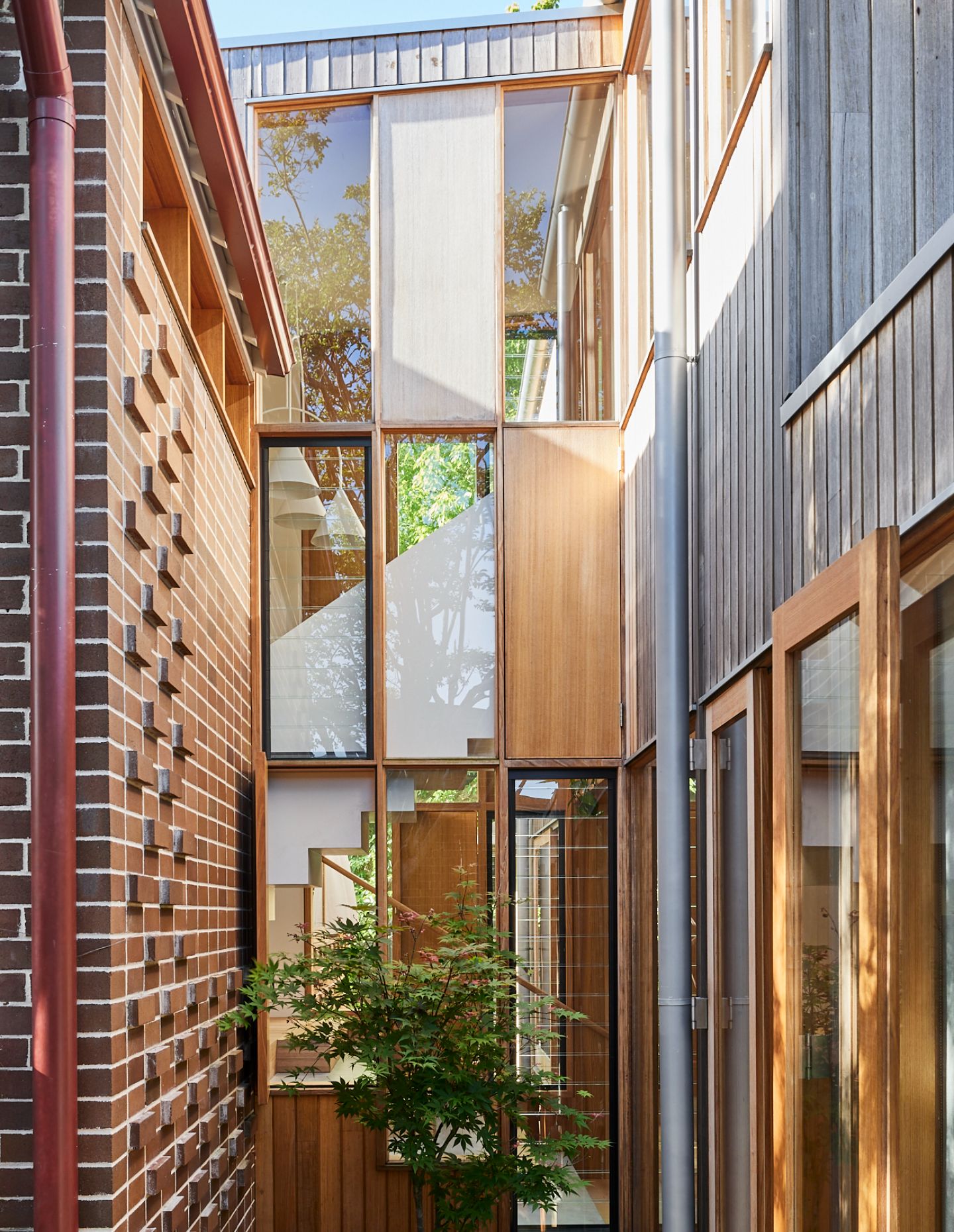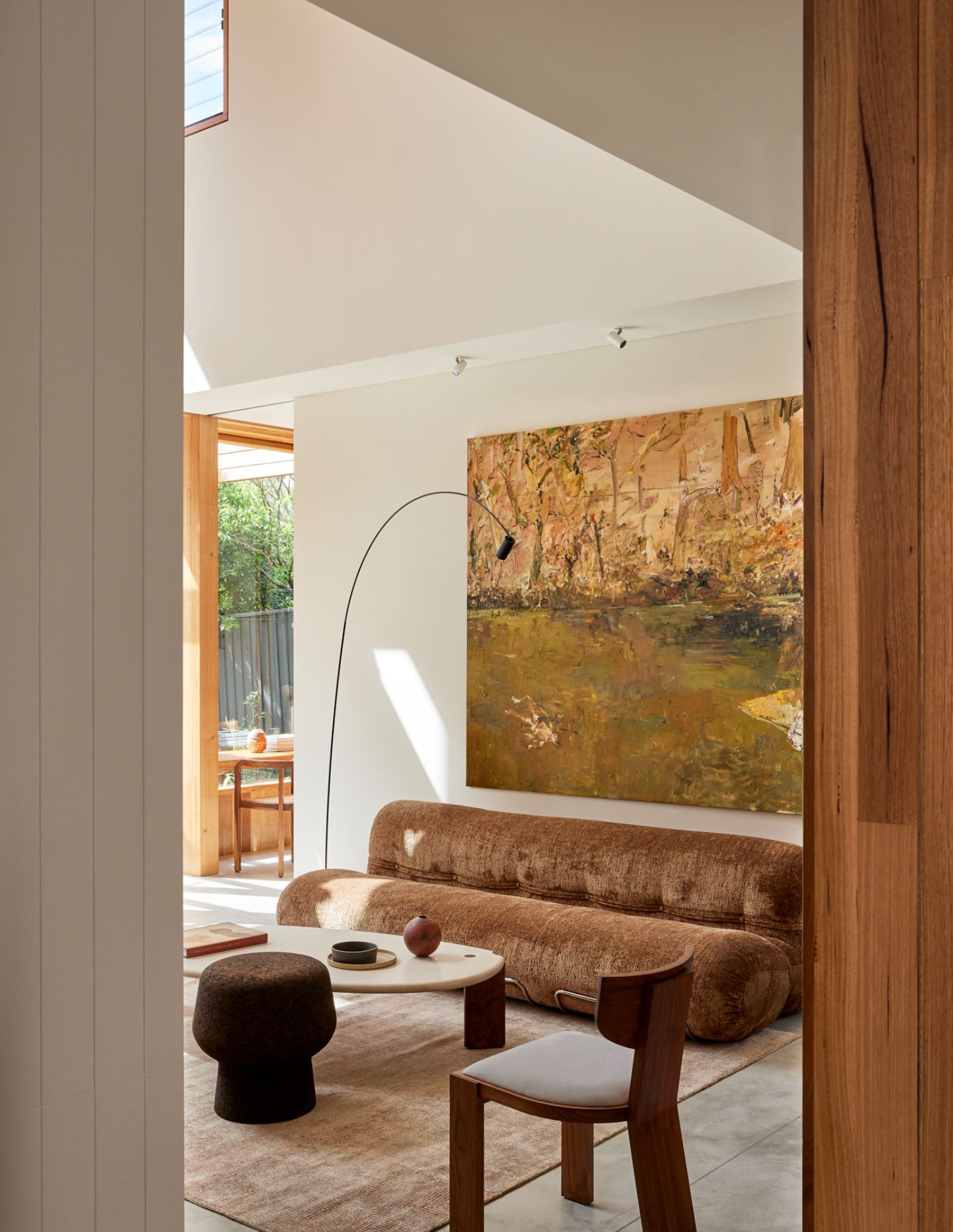 A light, airy pavilion is rhythmically expressed in Victorian ash. Within, a double-height void opens up the living space to sunlight and air, deepening the links between the private upstairs spaces and the downstairs spots in which the family comes together. A fireplace divides the open-plan living, kitchen, and dining spaces, which flow serenely onto the east-facing deck covered by a wisteria-clad pergola that frames the garden view. It is a home perfectly suited to entertaining and elevating the simple daily ritual of a meal in the sun.
