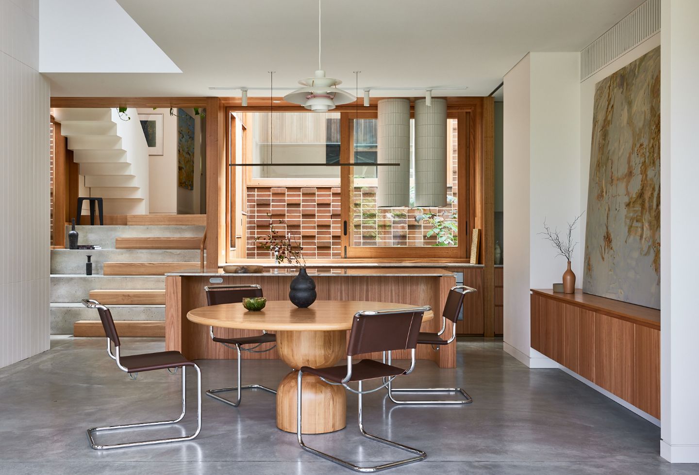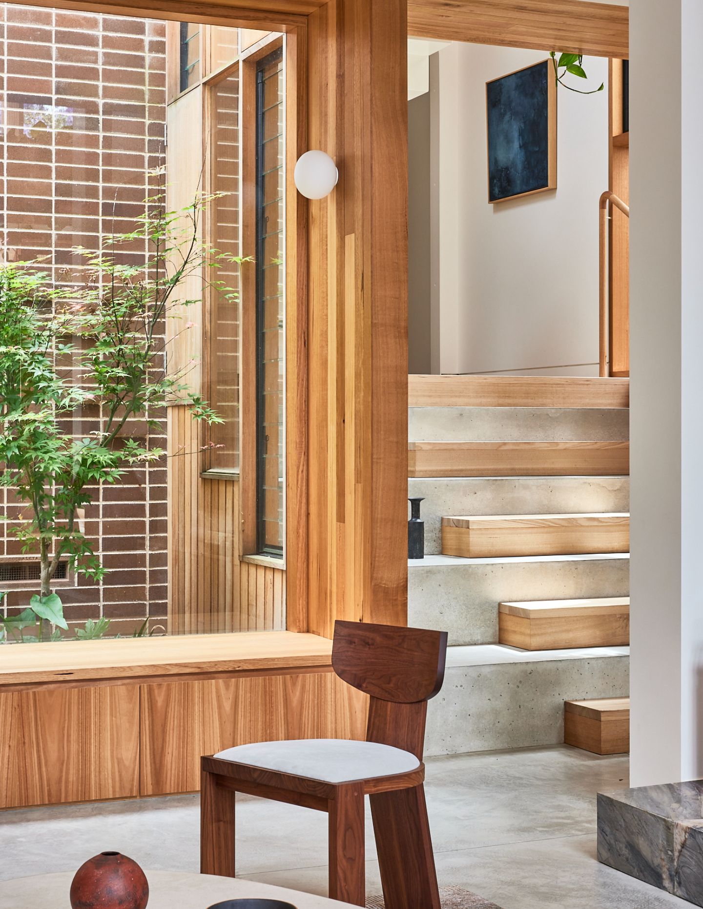 The addition unfolds from a distinct junction between old and new that helps the home negotiate its sloping site. A wide stair combines concrete and timber to create a processional entry down into the new space, doubling as seating. To one side, a white steel plate staircase rises to the first floor, with the whole space wrapped in a combination of timber, fixed glazing, and adjustable louvres for cross-ventilation, it announces the intention of the addition as a bright, spacious, double-height volume.