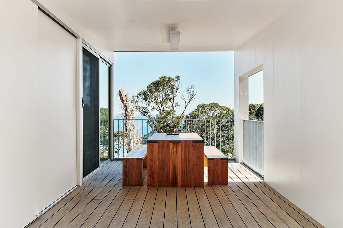 Three projects started to take shape, but it was this home for his client Rachel that really explored Goodman’s ideas of a modern Australian beach shack vernacular. The building is a simple rectangular form clad in Barestone fibro sheeting, perched on an incredibly steep site with a skillion roof.