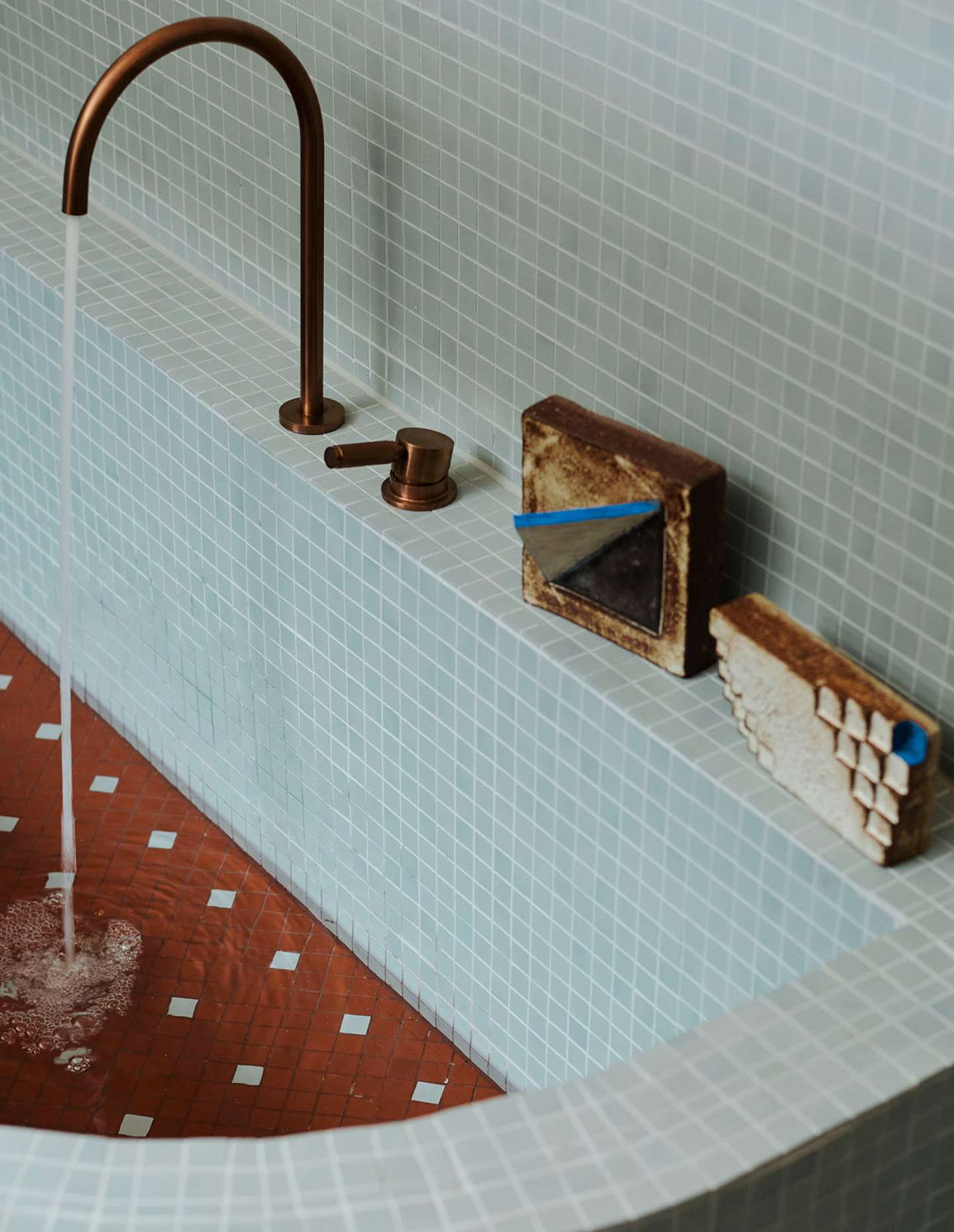 Hammams provided inspiration for the bathroom design, which includes a raised curved tub, seating perches and tiles tracking to high datums. The tones are beautiful and the whole piece achieves a small amount of ceremonial atmosphere, something a little more than the average domestic bathroom while maintaining its small scale and homeliness.