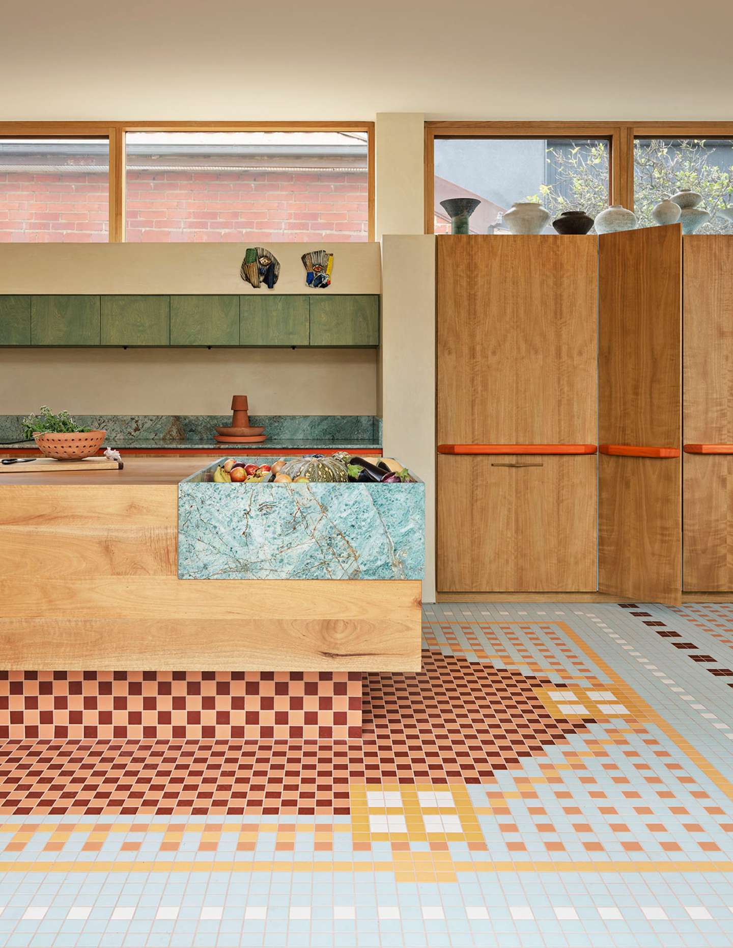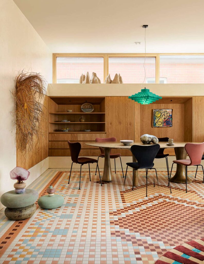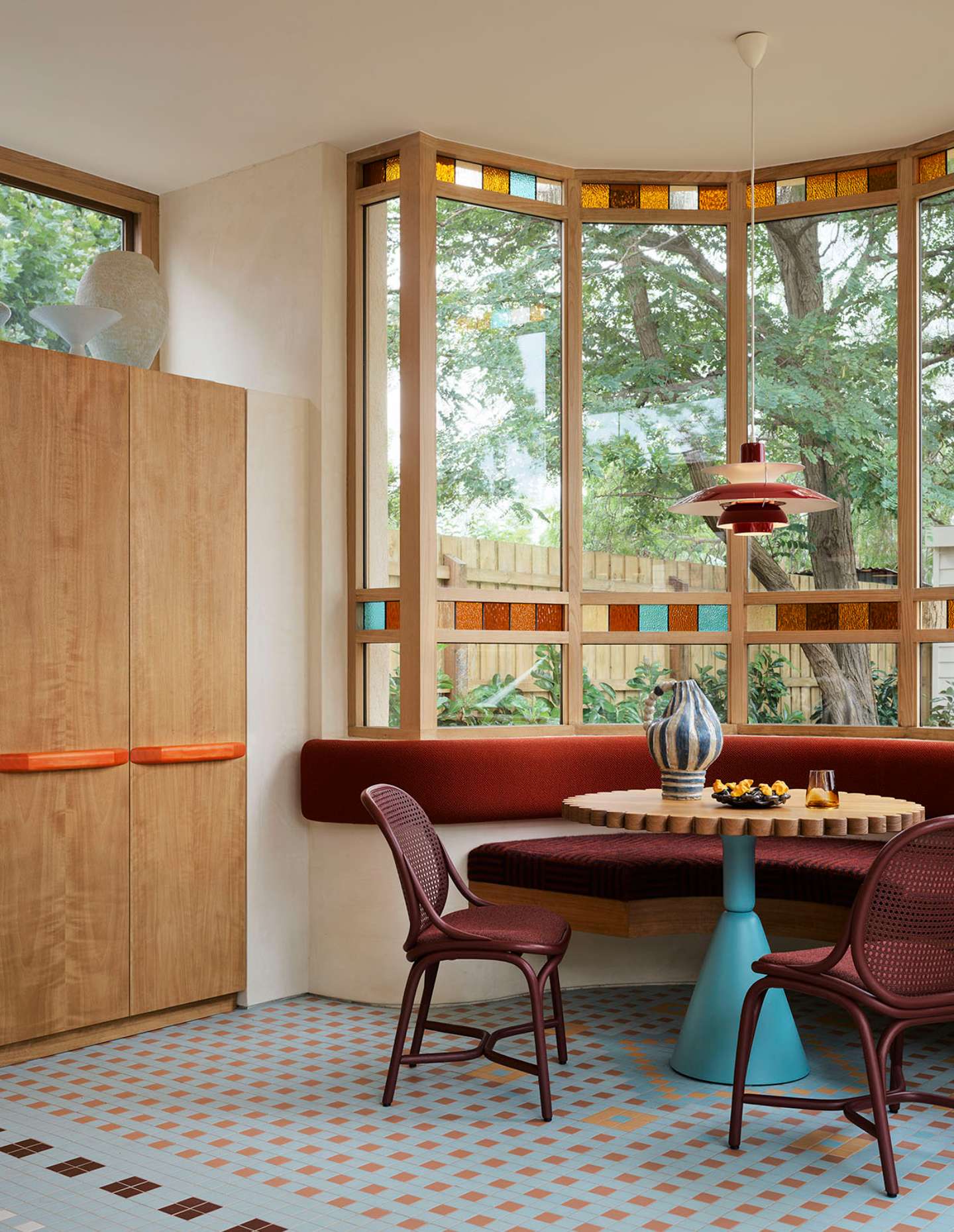 Working for their clients – an Egyptian-Australian married to a Danish minimalist – the design team has fully embraced an alluring fusion of cultural references. The home is at once bursting with colour and evocative of a certain Scandinavian calmness and restraint. The mixed references, meanwhile, are much more than just generic touch points; the design makes intelligent and meaningful allusions to the design heritage of these varied places. The curvaceous dining alcove, new semi-enclosed courtyard and earthy external wall tone, for example, are all inspired by Egyptian architect Hassan Fathy’s mud brick constructions.