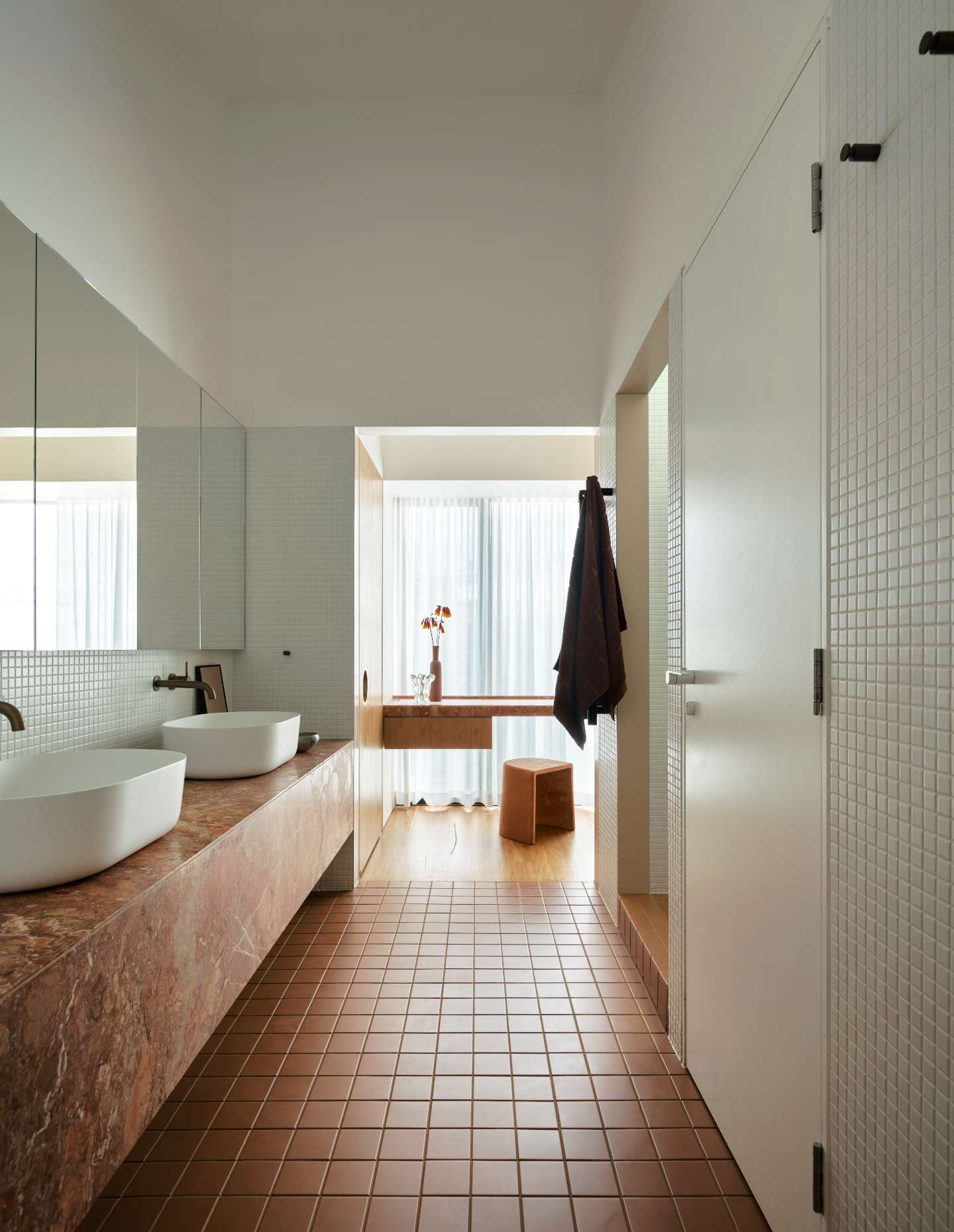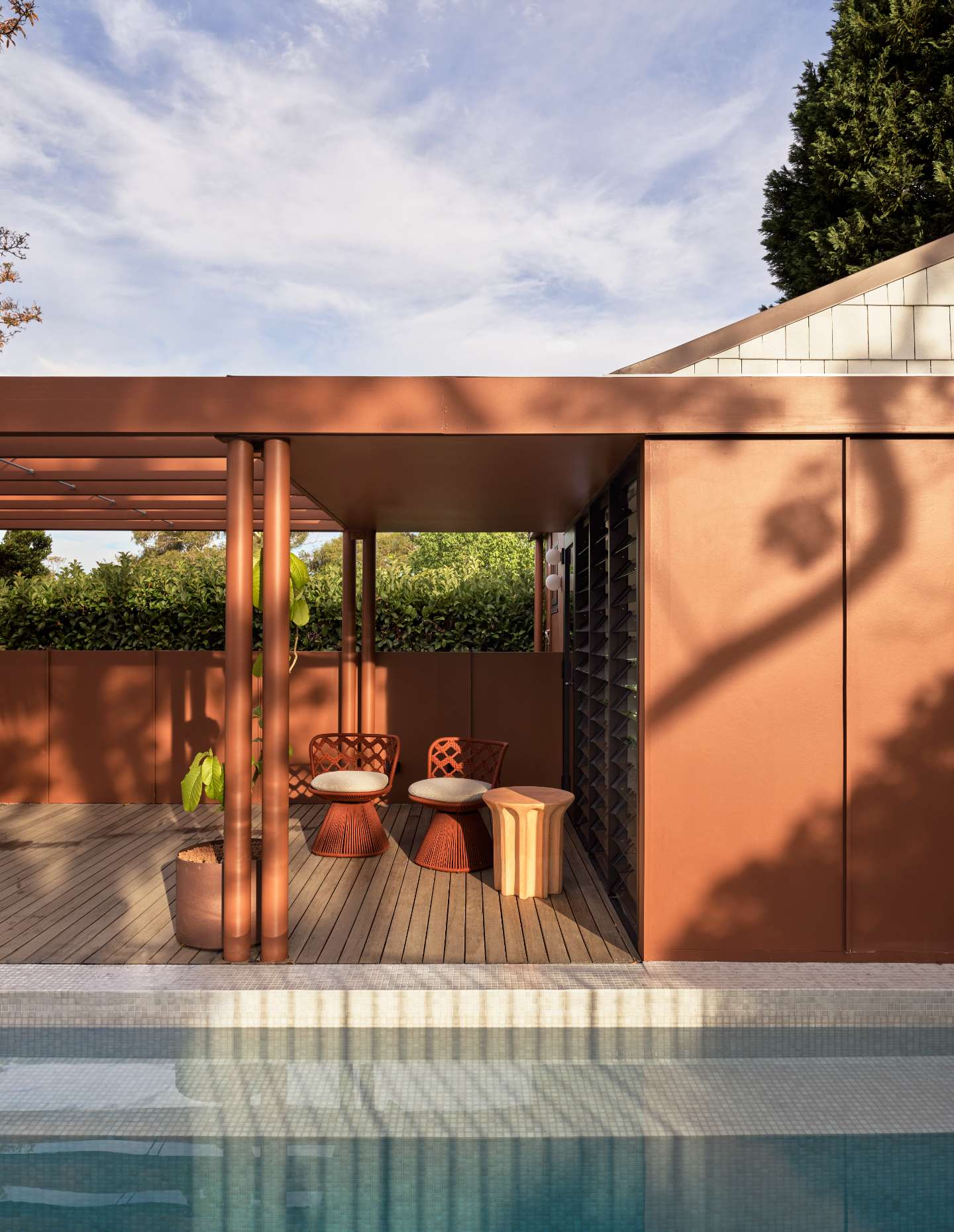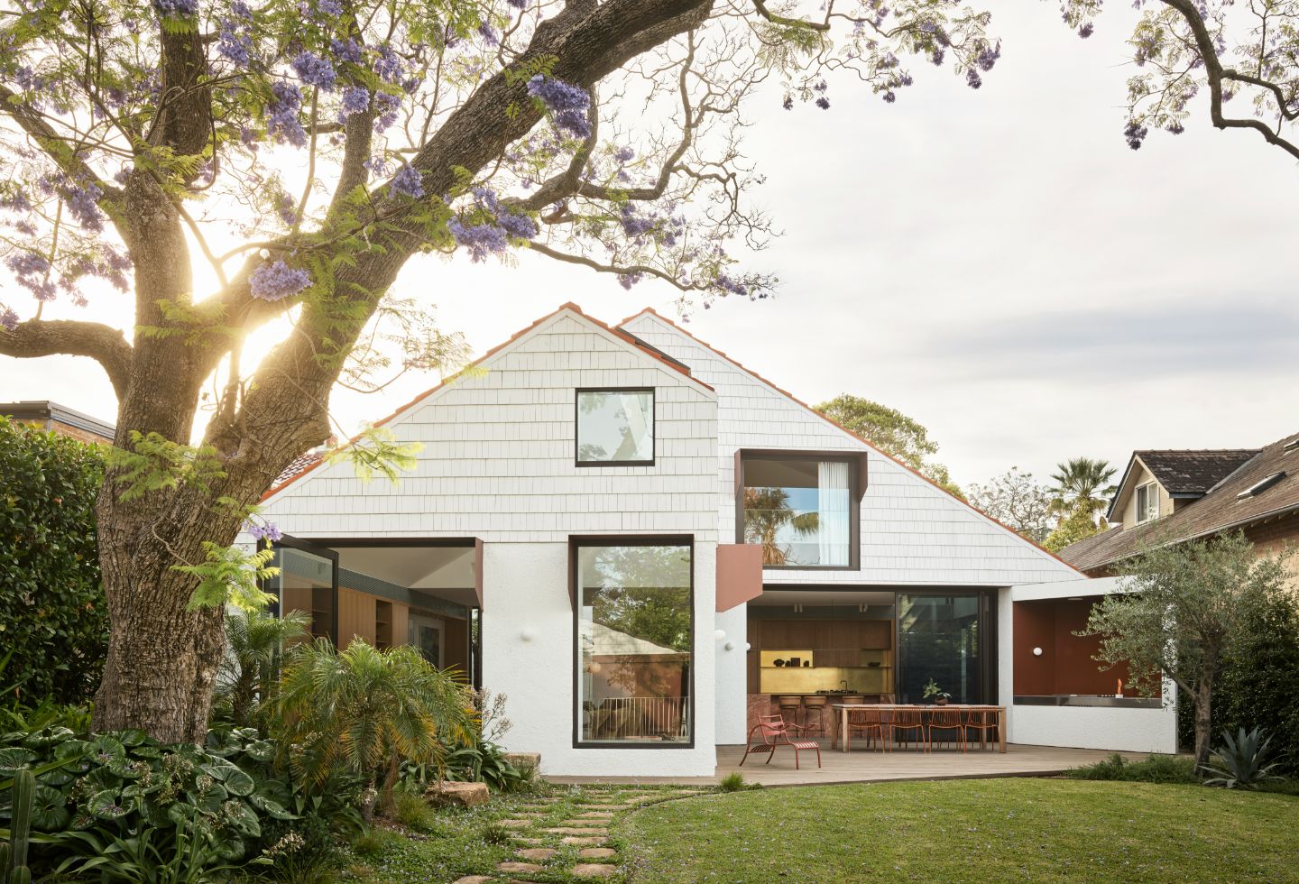 The project as a whole is spatially arranged to optimise the established gardens and Jacaranda tree, transforming it into a warm and generous family residence that encourages a sense of togetherness. Testament to Studio Prineas’ volumetric understanding of space, the home’s previous incongruous additions are replaced with an expansive, L-shaped volume and realignment so that “the internal level change now affords a greater connection between the principal living zones and landscape,” as Eva-Marie Prineas, principal of Studio Prineas explains.