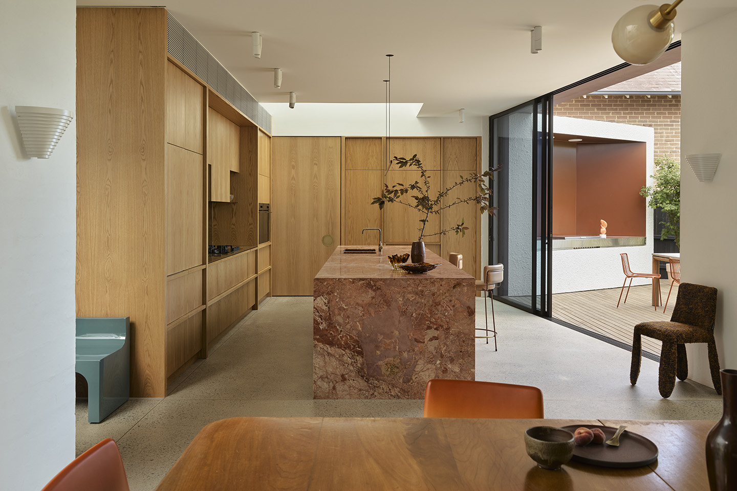 Alpha House is a multilayered story of redesign, renovation, replacement reinvigoration. The transformation of a Federation cottage has a number of different spatial focal points, but it’s hard to look past the show-stopping kitchen island. Indeed, it recently featured as a front cover image for Habitus magazine, standing out for its colour and material qualities.