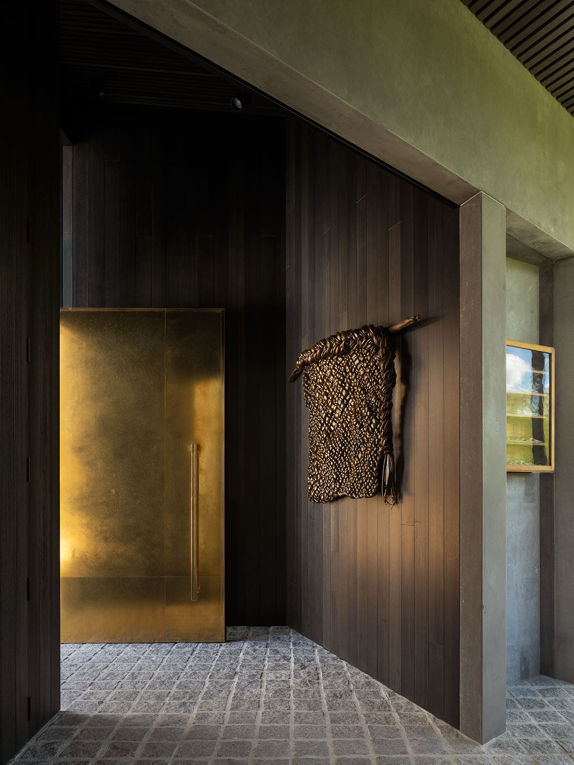 These four pavilions – two stone and two steel – are carefully placed around a small rise and accessed from a central sculpture court. Reached from the driveway below by a flight of steps, this arrival space is an urban (almost civic) experience. Lined in granite cobblestones, and enclosed by the four wings of variable height, the space feels like the plaza of a medieval hill town. It’s where the full palette of materials combine – steel, mountain schist, exposed concrete and a large bronze front door recalling the gold nuggets once gleaming from the river beds. The client’s own organic sculpture adorns the court and has recently been joined by another work, the two pieces activating the space, their organic lines contrasting against the cubic forms of the house.