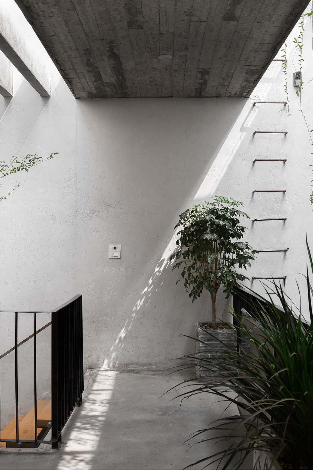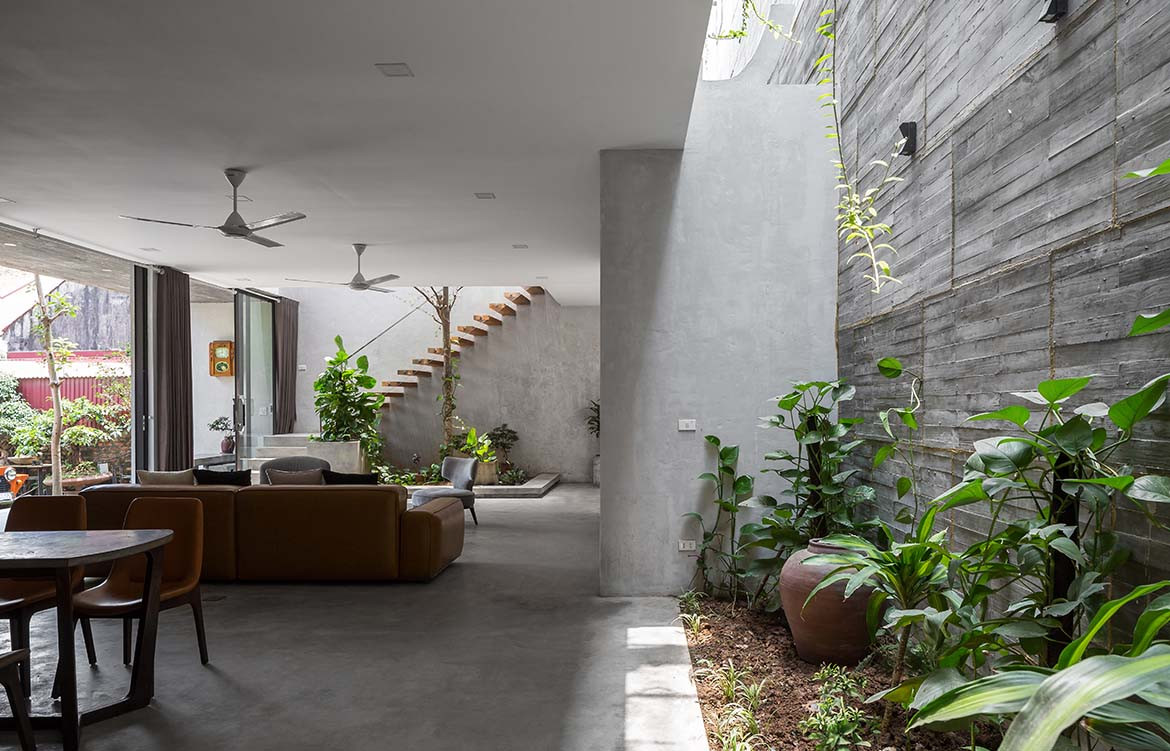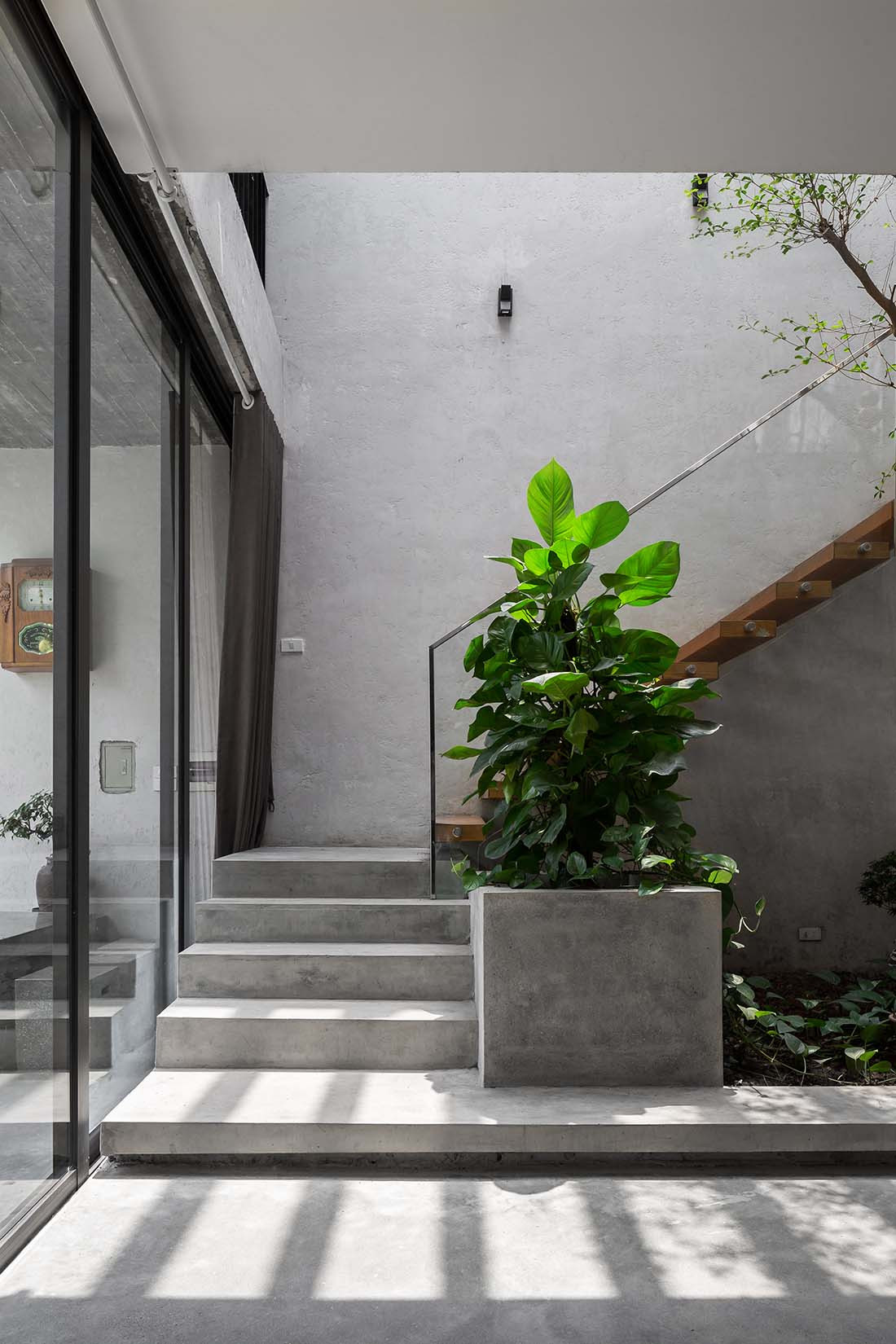 Nature (both greenery and timber elements) softens the concrete character of the house. “We gave priority to trees and plants that can grow well inside a house without meticulous care as the homeowner is pretty busy with his daily work already,” Van says of the indoor planting. Bamboo and Terminalia mantaly, commonly known as the Umbrella tree, were chosen for their delicate foliage and low leaf fall.