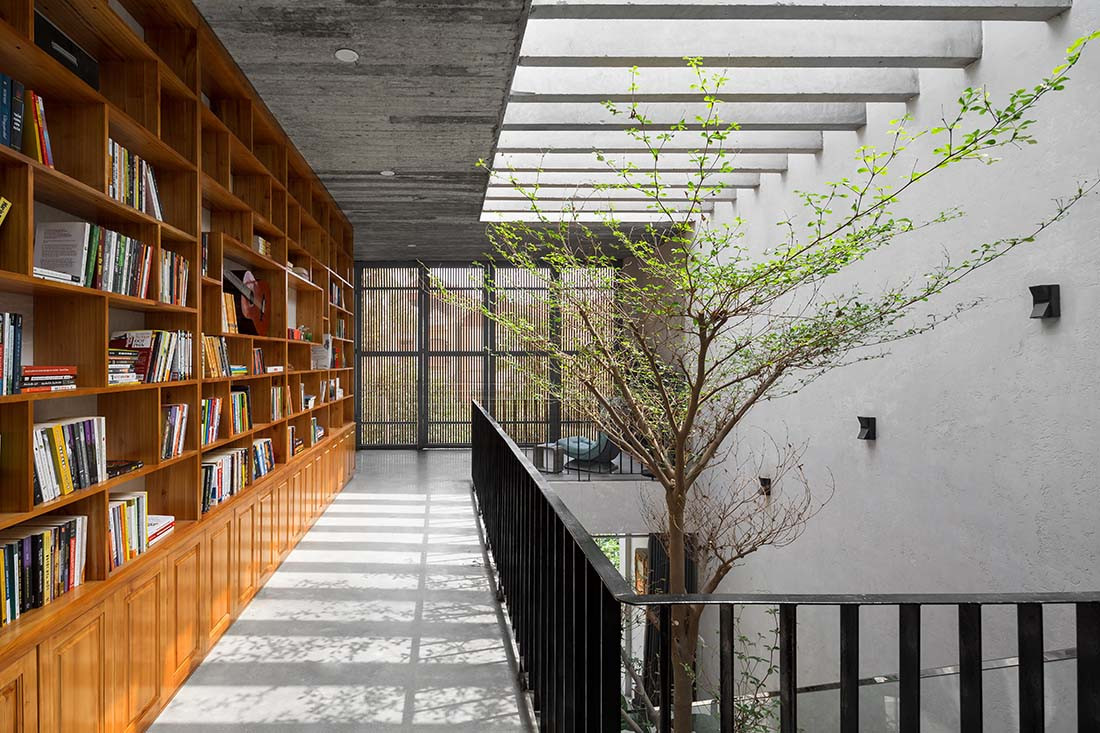 The house’s large openings invite the breeze and offer views out. They create opportunities for quieter enjoyments too, such as in the reading area upstairs, set in a cosy yet open space by a stretch of windows and bookcase – both gratifyingly large for the resident bookworm.