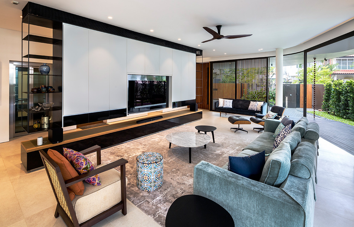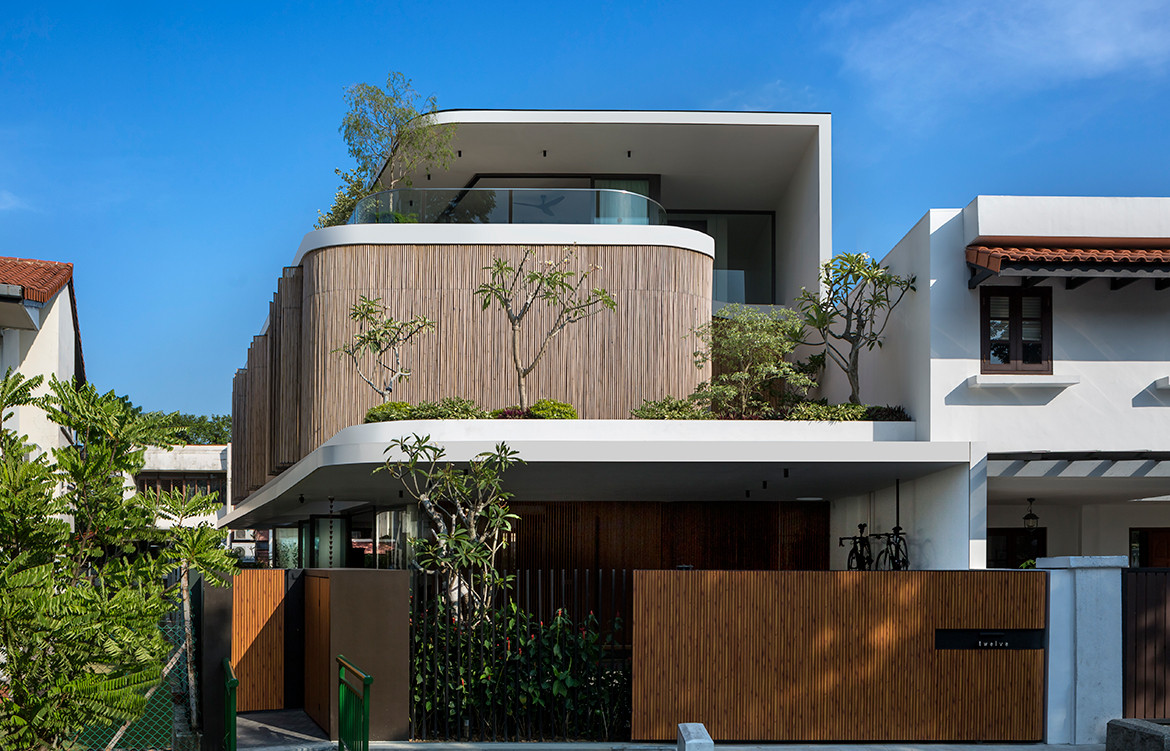 This 680-square-metre, semi-detached house replaces an earlier house on a curving triangulated site. It is for a small family of just three. “[I] had the luxury of building a small house with an ample amount of shade with deep overhangs,” says the architect, Robin Tan of Wallflower.