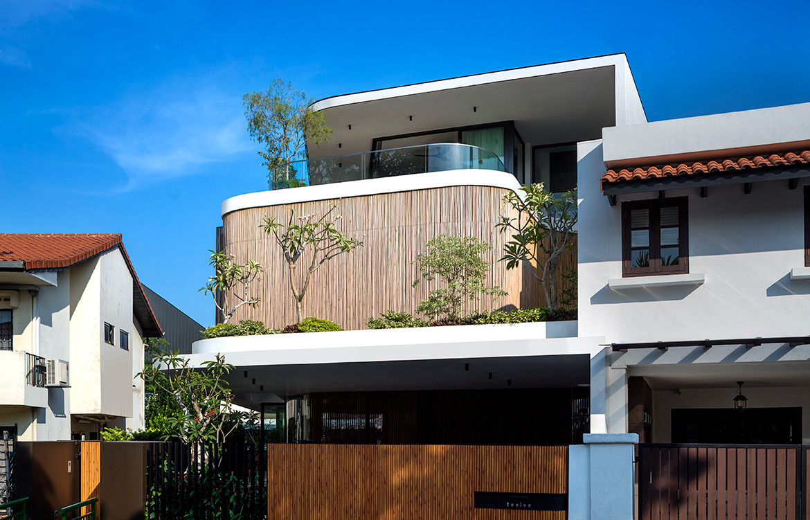 Apart from the bamboo screens, climate mitigation is helped by a large overhang that wraps over the attic aided by ample greenery.“We like to introduce pockets of greenery,” says Robin, “because in Singapore owners want to build up to the max. So we like as much as possible to bring the greenery up to the second storey and to the attic level.” In this case, there is a little garden above the garage. This not only helps cool the master bedroom, but it also provides a privacy screen from the neighbours opposite. Planting on the attic floor screens the western afternoon sunlight while also providing some green relief.