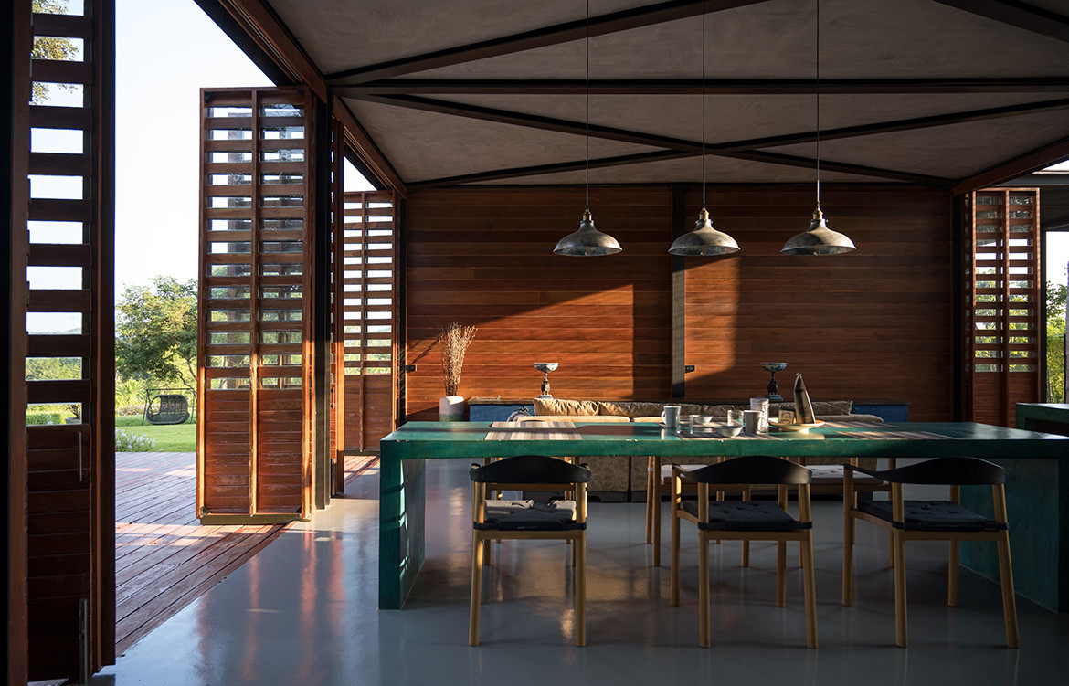 The architects also borrowed the strategy of using modular, pre-fabricated timber systems, resulting in a structure that retains the aesthetic appeal of the timber façade of the Korat House, but in a very lightweight form. In fact, the house seems almost to de-materialise without any sense of imposing itself on the landscape.
