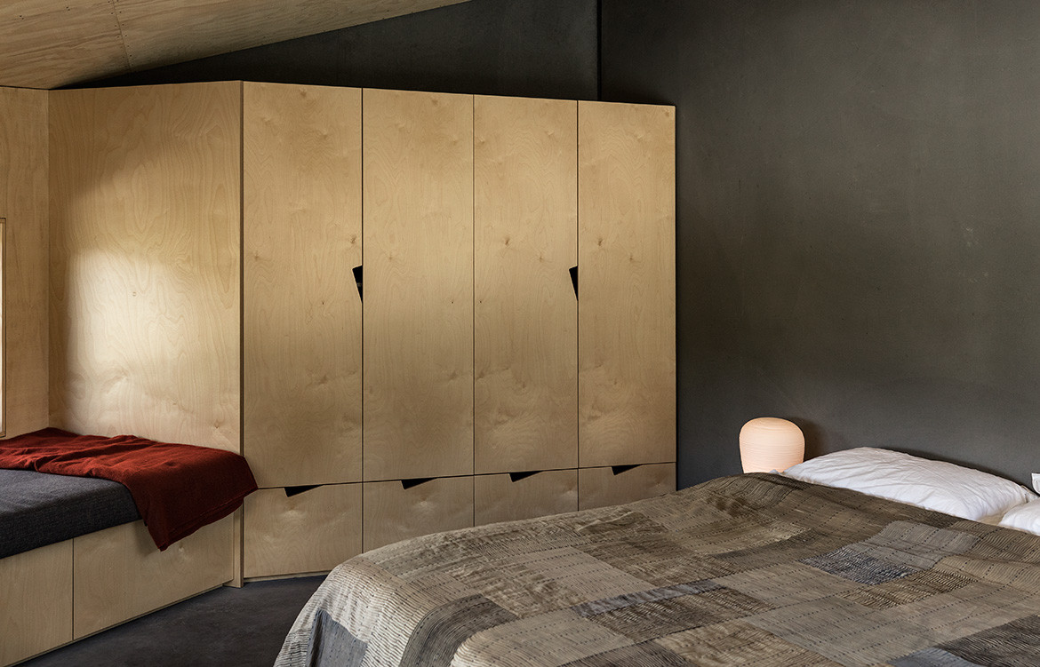 With concrete for its high thermal mass, these social spaces feel solid, hunkered down and reverberate with a slight echo. But on turning the corner into one of the sleeping areas, the whole ambience changes. Untreated band-sawn plywood walls and ceilings create softer acoustics and light. A low slot window is setup to be viewed from one bed, and a perfectly square window frames the landscape from another. These private areas are intimate and cocooned and offer true spatial variety and contrast within the small footprint.