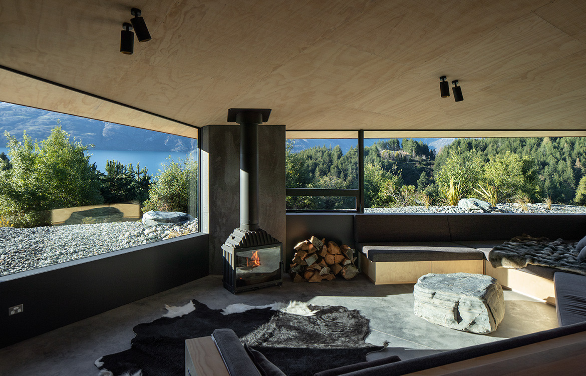 While Sam’s hut is on the forest floor, the site for this house overlooks Lake Wakatipu near Queenstown – on a platform created by a large cut in the side of the valley wall. “It wouldn’t have been my approach to create a house site,” says Vaughn. “So we began to imagine how we could somehow repair or reinstate part of the site by referencing the original contour. This led to how the house might have been formed around large rock fragments left during the platform excavation. A rock bivvy perhaps.”