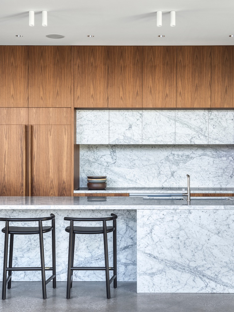 Mindful of fire regulations, the design has a concise and robust materiality of masonry, rendered and textured concrete, marble and blackbutt timber that also informs the colour palette of white, warm honey tones, greys and browns with accents of black.