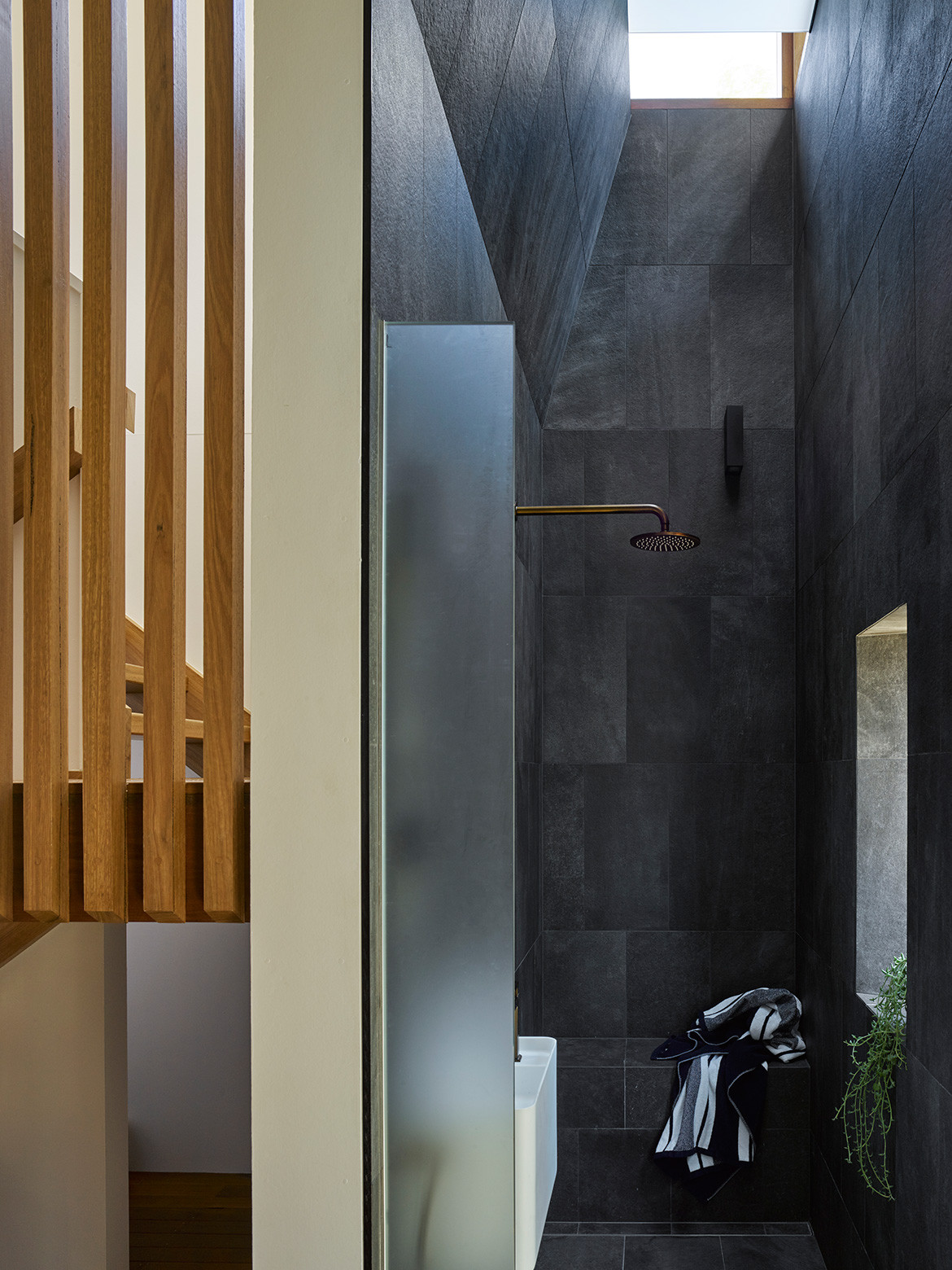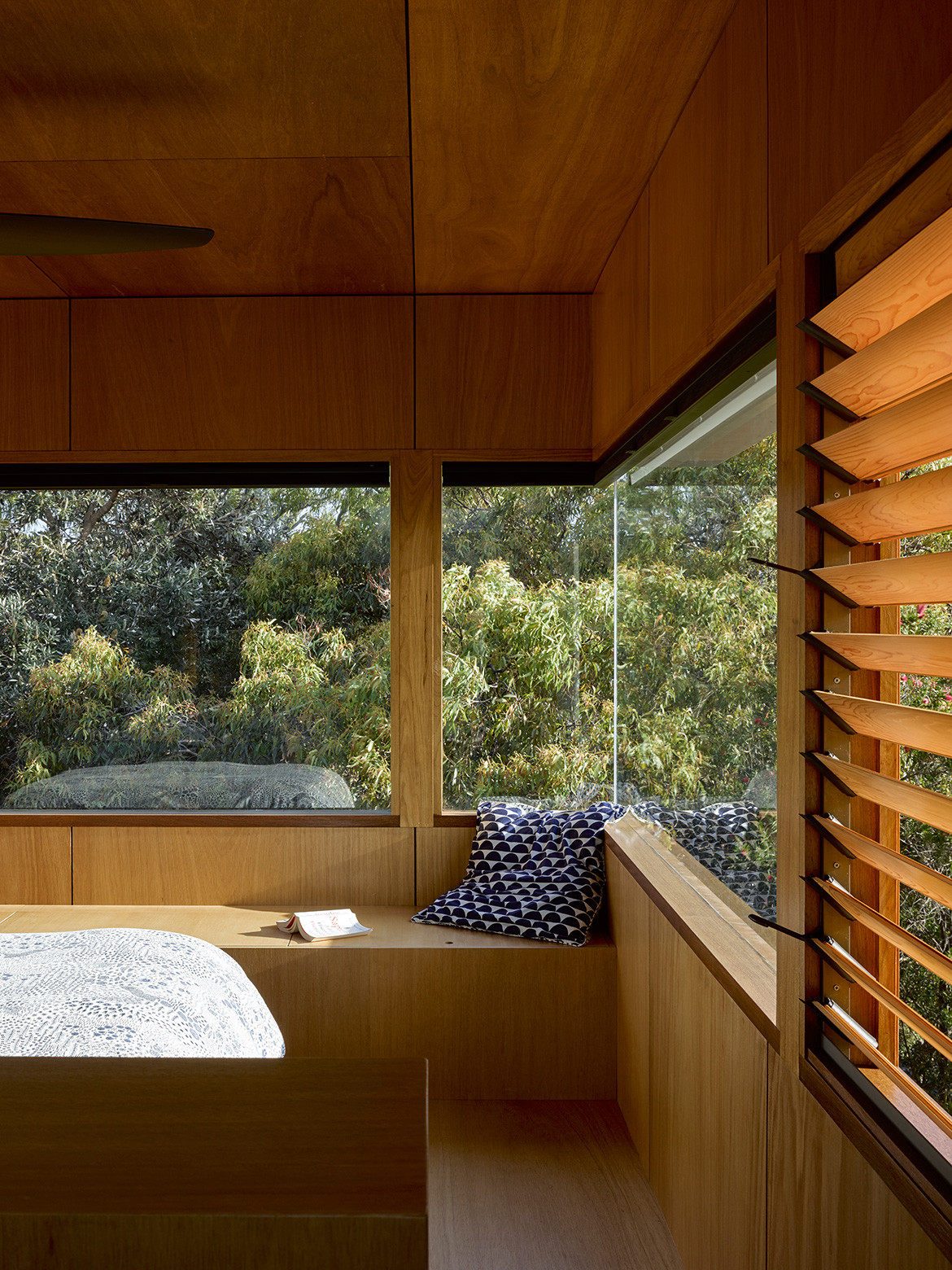 For effect the decking continues upstairs along the corridors connecting the three bedrooms that have been located to the upper, private level. The main bedroom and the boys’ bedrooms at either end of the plan all enjoy ocean views. Although they weren’t significant enough to warrant placing the living spaces on the upper level, they do offer personal and distinctive views for each family member.