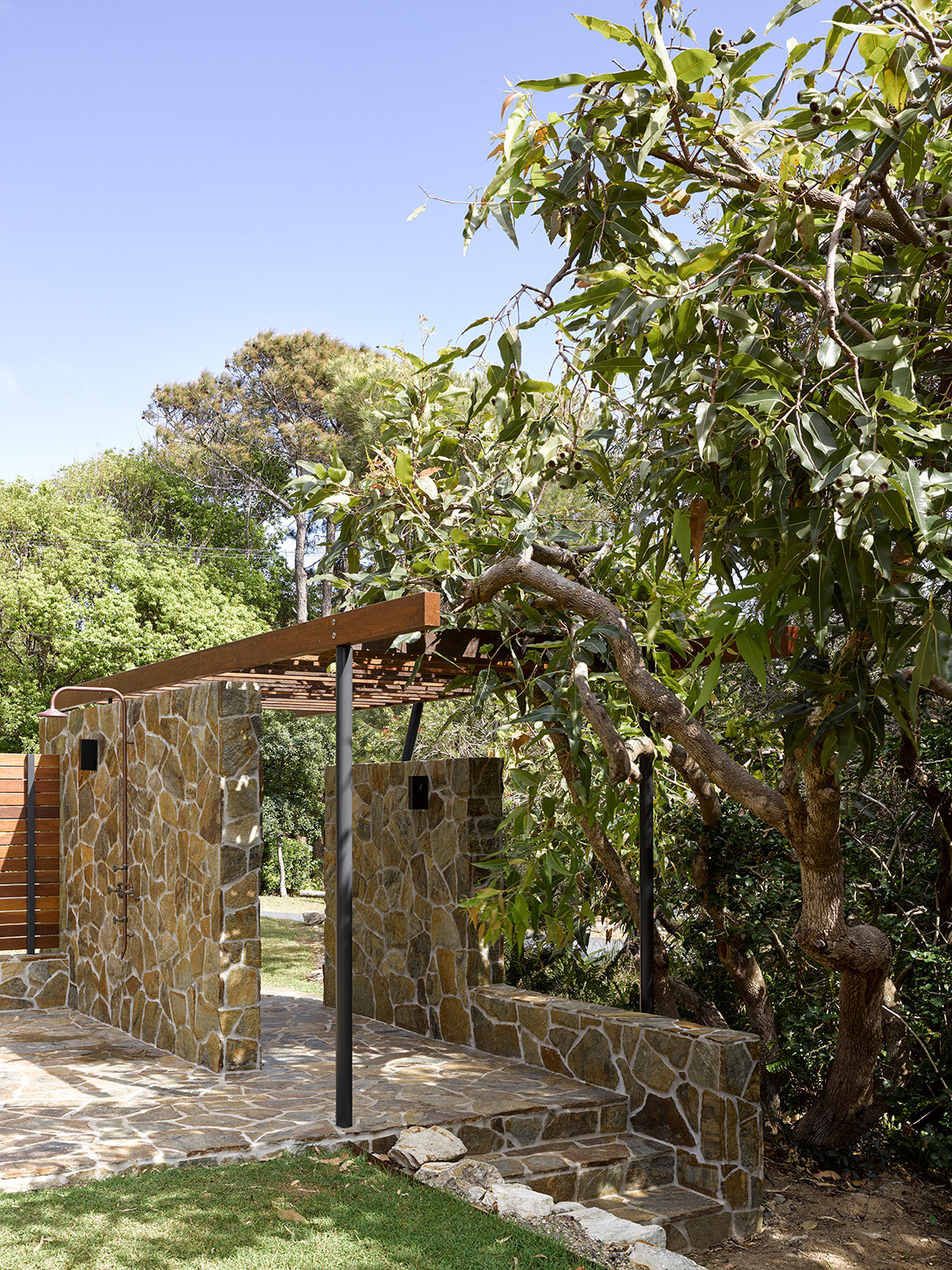 Two stone walls and a timber arbour form the main entrance beneath the characterful, namesake Corymbia tree. A generous width between the timber beams encourages the Flowering Gum to peak through and cast interesting shadows. On the other side of the entry sequence, the house fully reveals itself as it opens on to the great room off the deck and leading to the kitchen with sightlines through to the interior living spaces. This also works as passive security, in lieu of rigid fences, front gates and intercom systems – all of which are rarely found on the island.