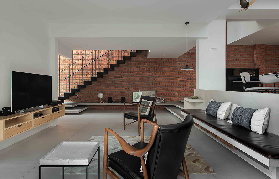 Other elements add some warmth: a brick wall, hardwood timbers and the greenery of the rooftop. Even though in-situ concrete is a common and cheap building material in Malaysia, texture is added through the boardmarked pattern in the formwork.