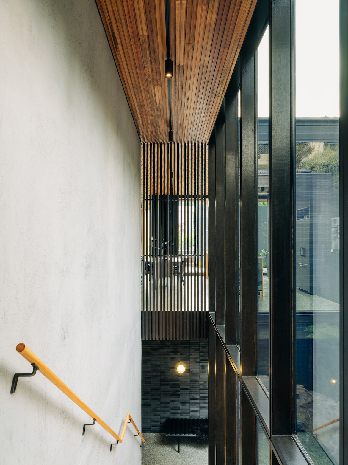 While the opportunity to build came with a 1,000-square-metre site, the terrain was relatively steep with a rocky bed as the foundation. One of the massive boulders was retained and transformed into a fern-style garden. Given the slope of the site and the desire to ensure neighbours’ views of the river were also maintained, Archier excavated more than six metres below the original ground level, nestling the house into a dolerite base.