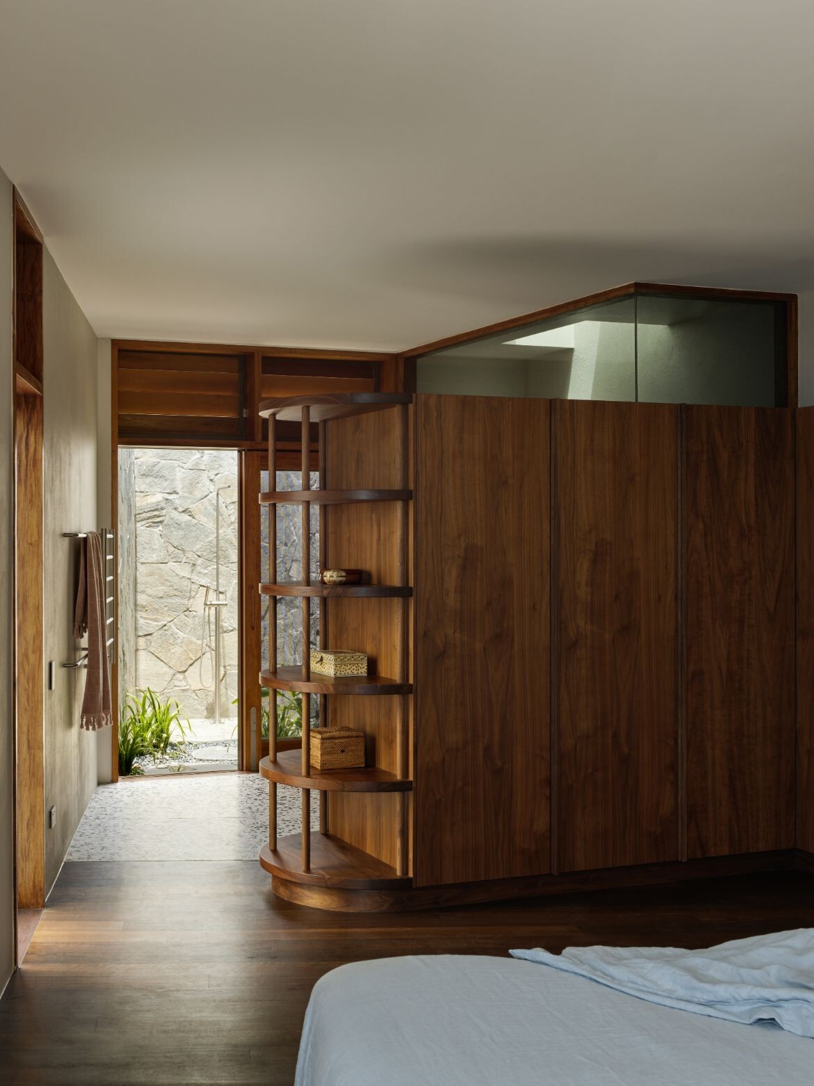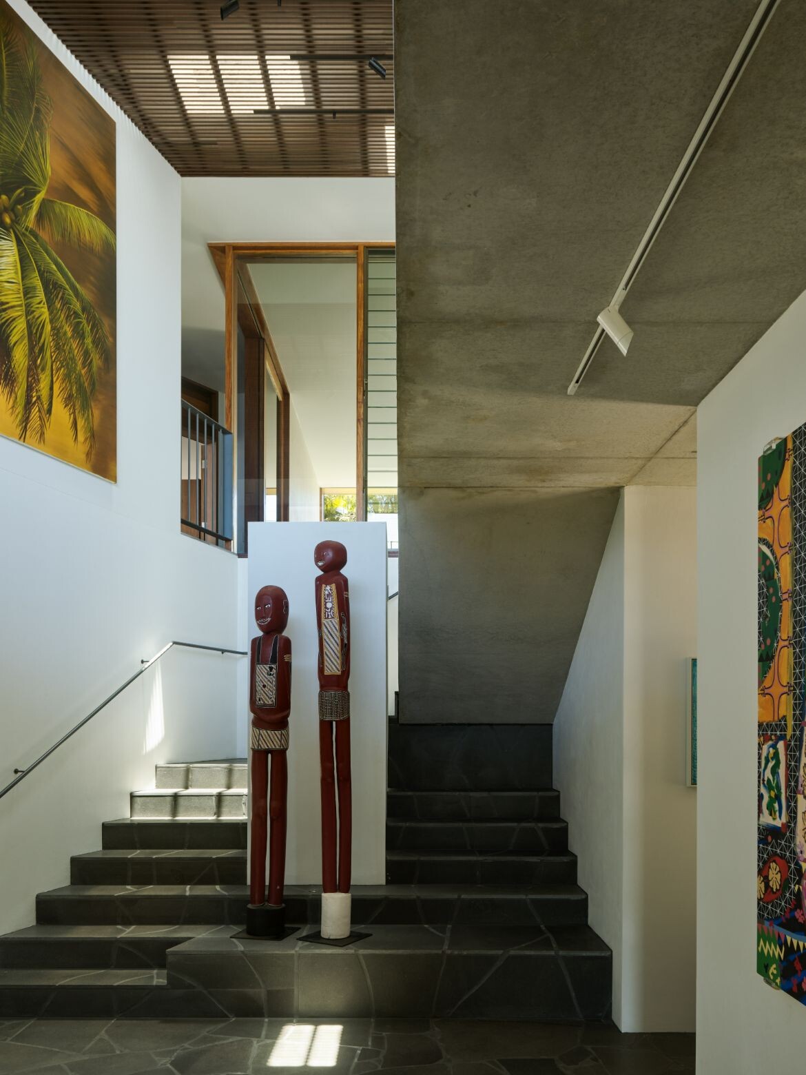 Through materiality and layout, the architects have achieved a beautiful and effective synthesis of the whole. On one hand, there is an upper living area defined by openness, sightlines and porous thresholds between indoor and outdoor space. On the other, a lower space that is both art gallery and private holiday quarters. It’s a delicate balance achieved under one sub-tropical roof.