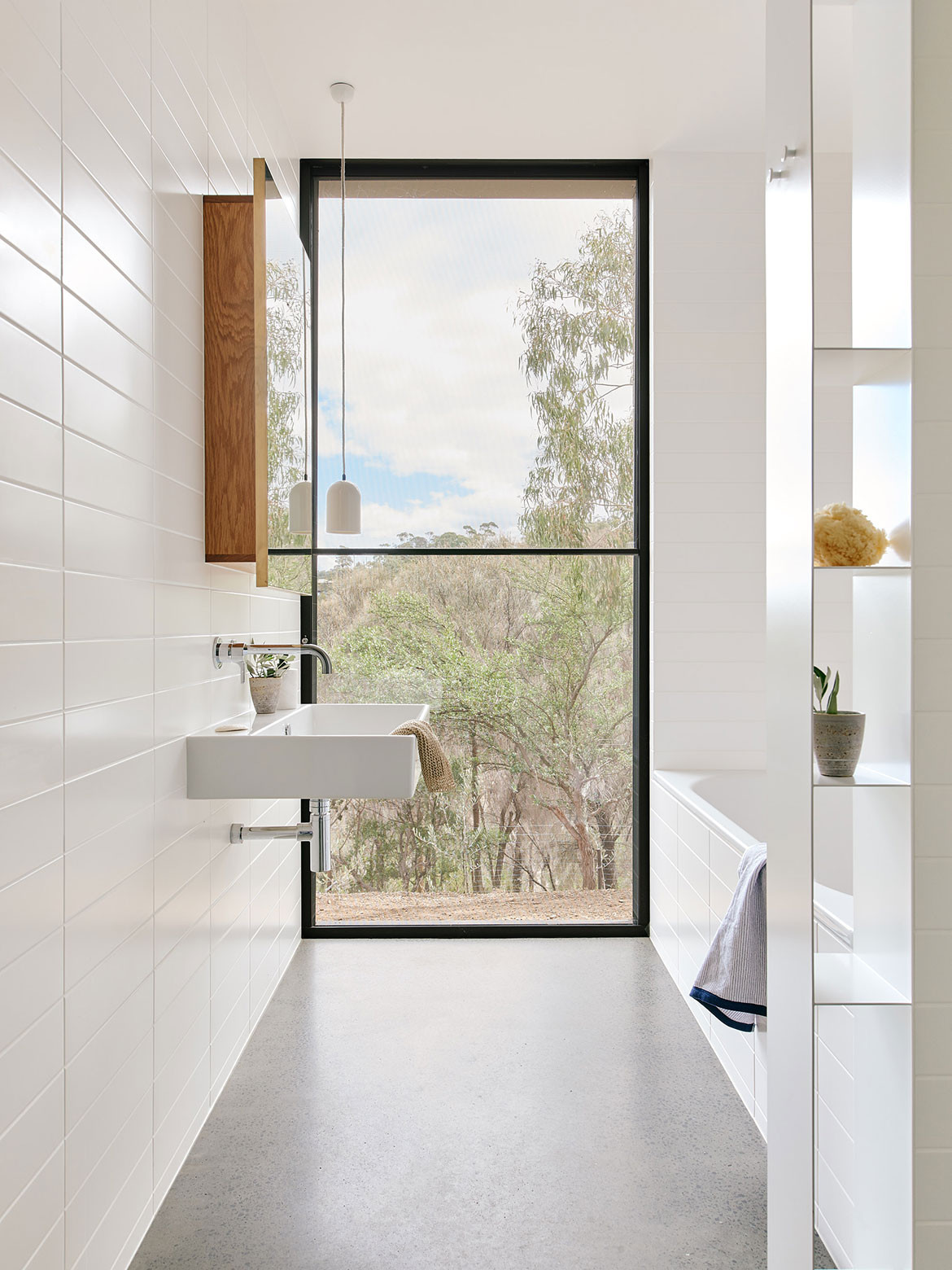 Elements of the external material palette, such as the masonry and timber, continue inside. Concrete floors act as thermal mass boosted by underfloor and woodfire heating. The latter also helps with fuel loads in the site. The colours are kept neutral and pared back, not wishing to distract from the natural beauty of the area.