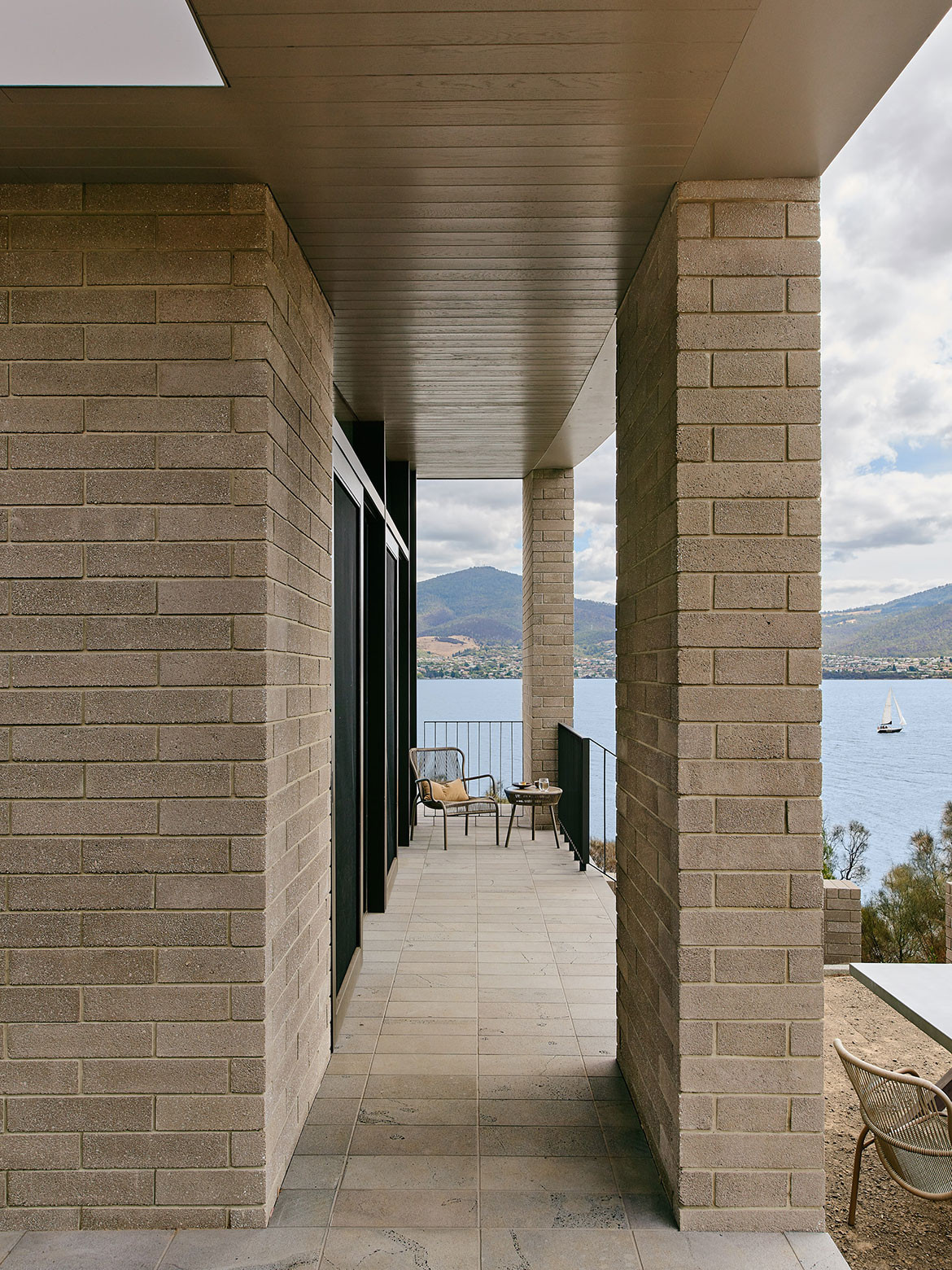 The House at Otago Bay by Topology Studio is located on a bend in the Derwent River in Tasmania. It is set back from the road and purposely humble on approach: the brick and timber façade is simple in shape and materiality and, while it appears to be a single story, a second, lower level was achieved by following the descent of the hill. Furthermore, the house intentionally obstructs the view on approach, saving the true grandeur of the location for a later reveal. This creates drama as you move through the residence.