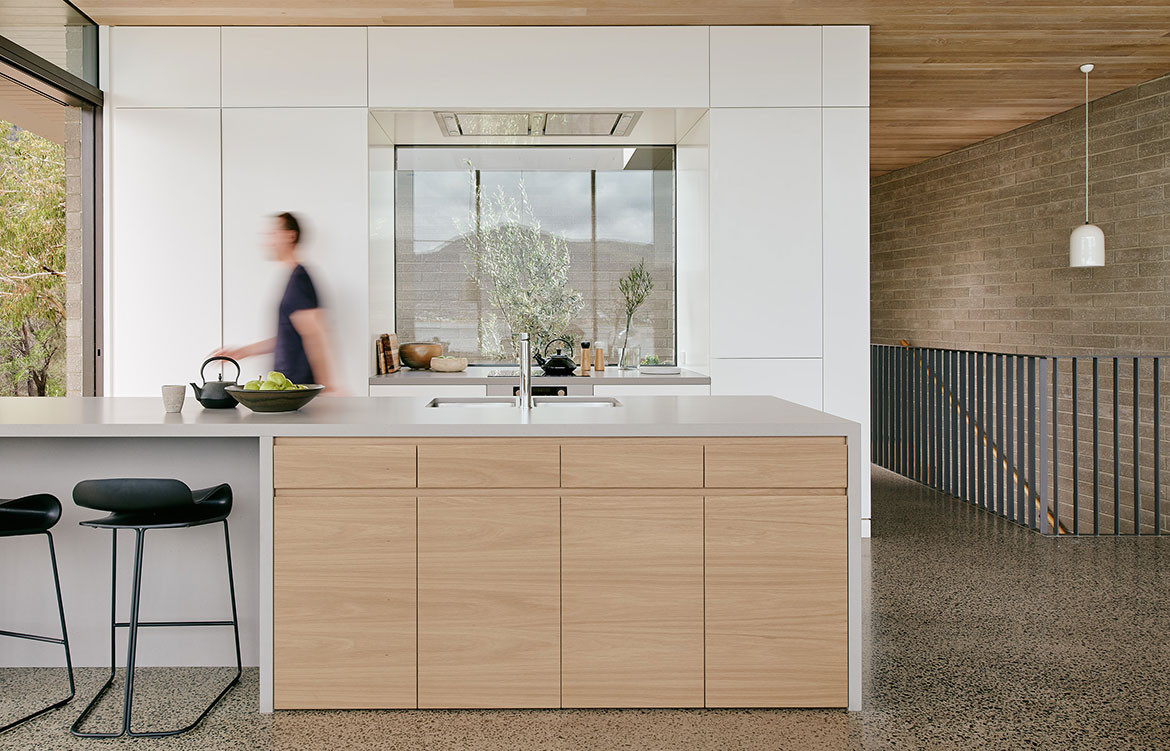 A mix of locally sourced masonry is appropriate given the environment, but also matches the tone of the site. The hardwood timber is non-combustible and the shape of the roof minimises the guttering required. These natural materials, as well as bluestone pavers, were chosen for their weathering capabilities. “This is a house that looks better with age, rather than requiring a lot of maintenance,” says Amy Hallett of Topology Studio.
