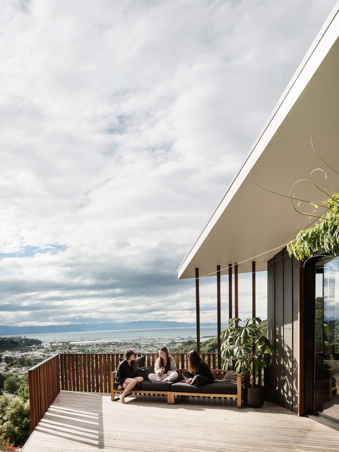 Located near Nelson on the northwest of New Zealand’s South Island, Feather House rests on the top of a hill surrounded by landscape with views of the town and ocean. The form is elongated with tapering ends – a feather shape – and there is a layering of materials and lapped-cladding with copper tips, hence its name Feather House.